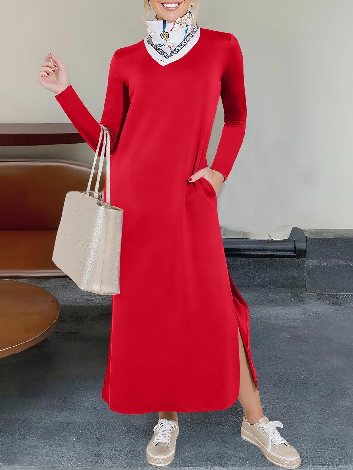 ANRABESS Women Long Sleeve Dresses 2025 Fall Casual Crewneck Loose Fit Split Flowy Wrinkle-Free Travel Vacation Maxi Dress(Red)