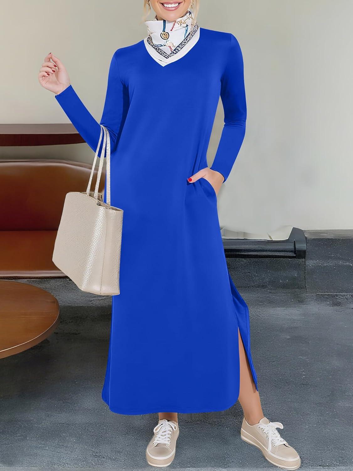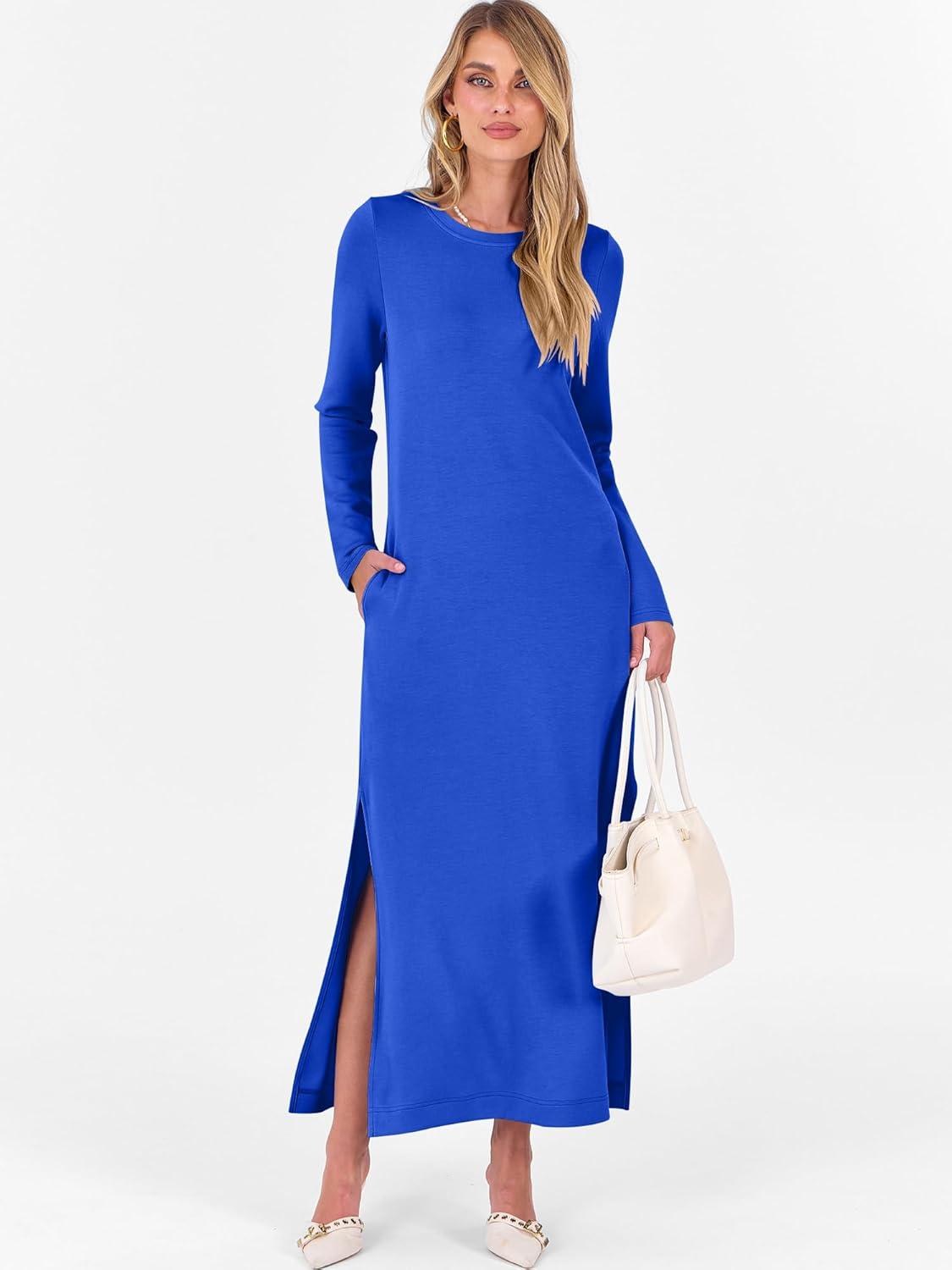 ANRABESS Women Long Sleeve Dresses 2025 Fall Casual Crewneck Loose Fit Split Flowy Wrinkle-Free Travel Vacation Maxi Dress(Royal Blue)