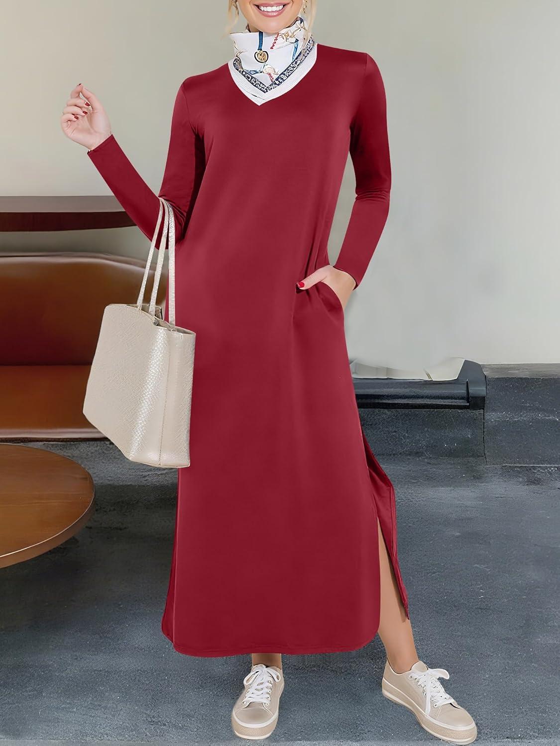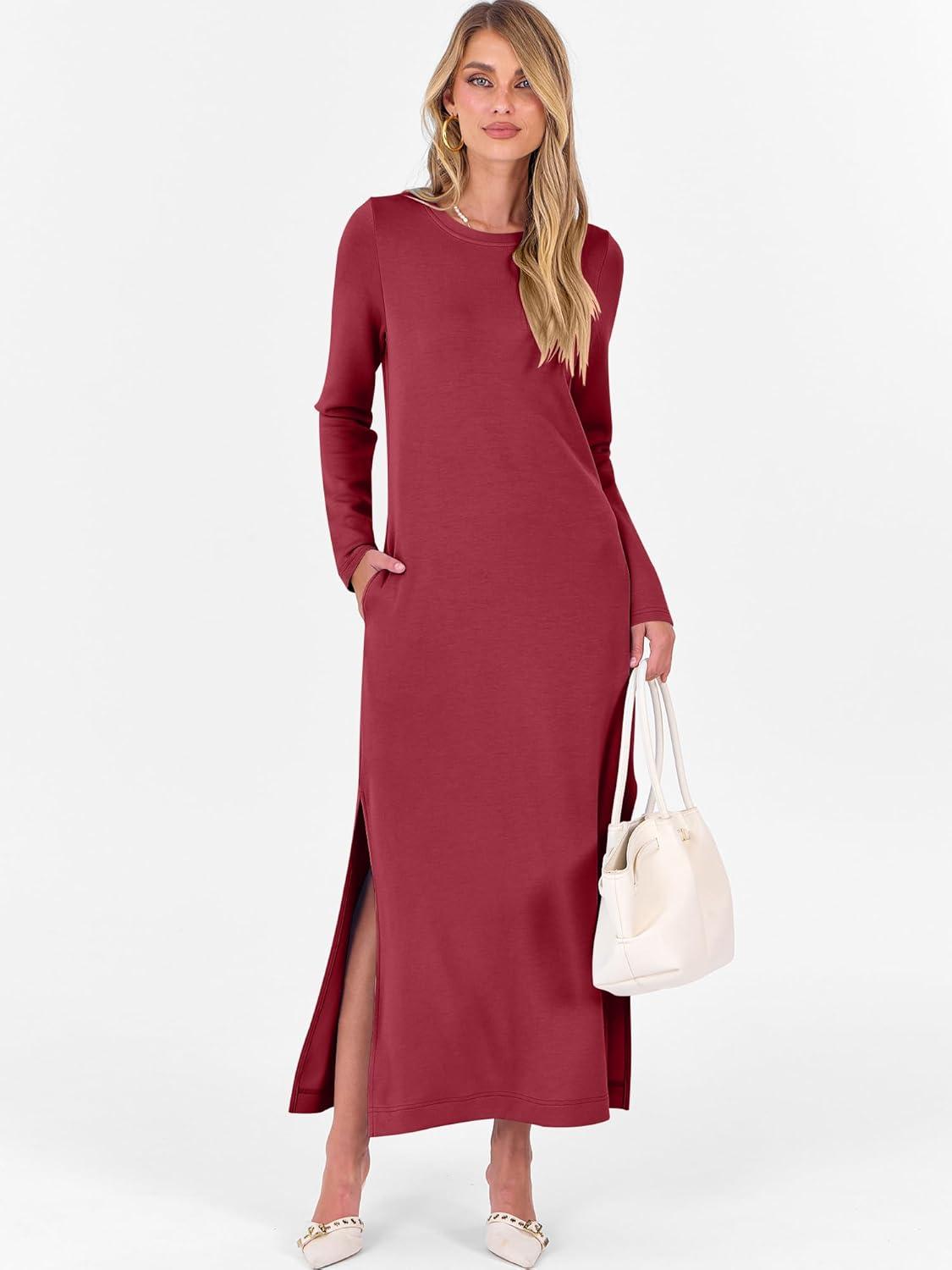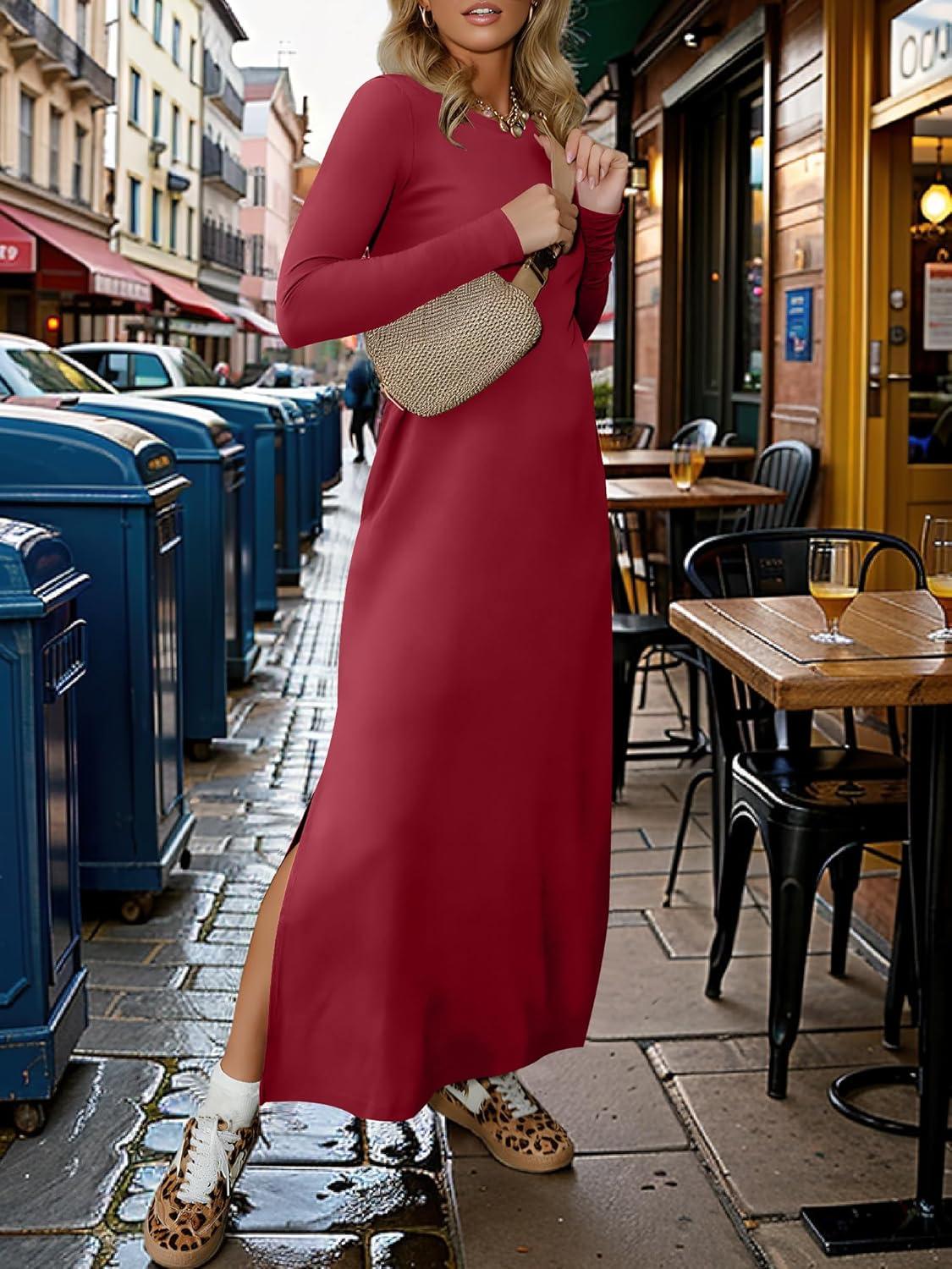 ANRABESS Women Long Sleeve Dresses 2025 Fall Casual Crewneck Loose Fit Split Flowy Wrinkle-Free Travel Vacation Maxi Dress(Wine Red)