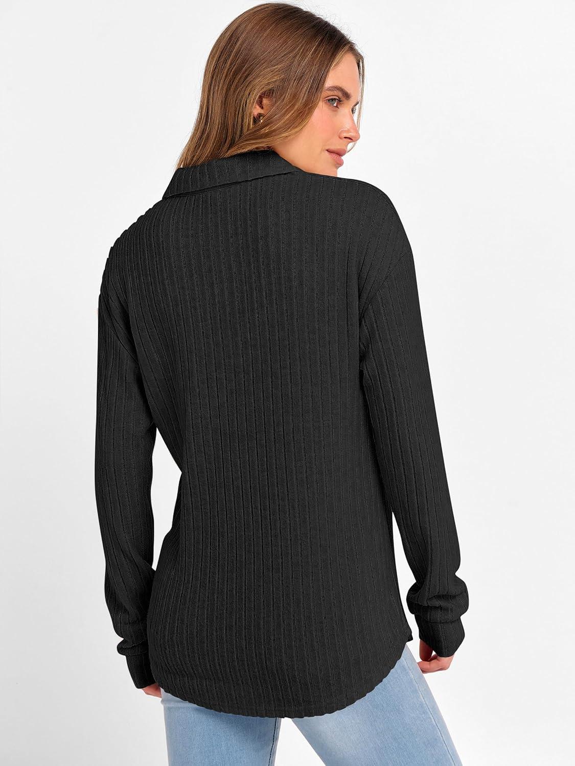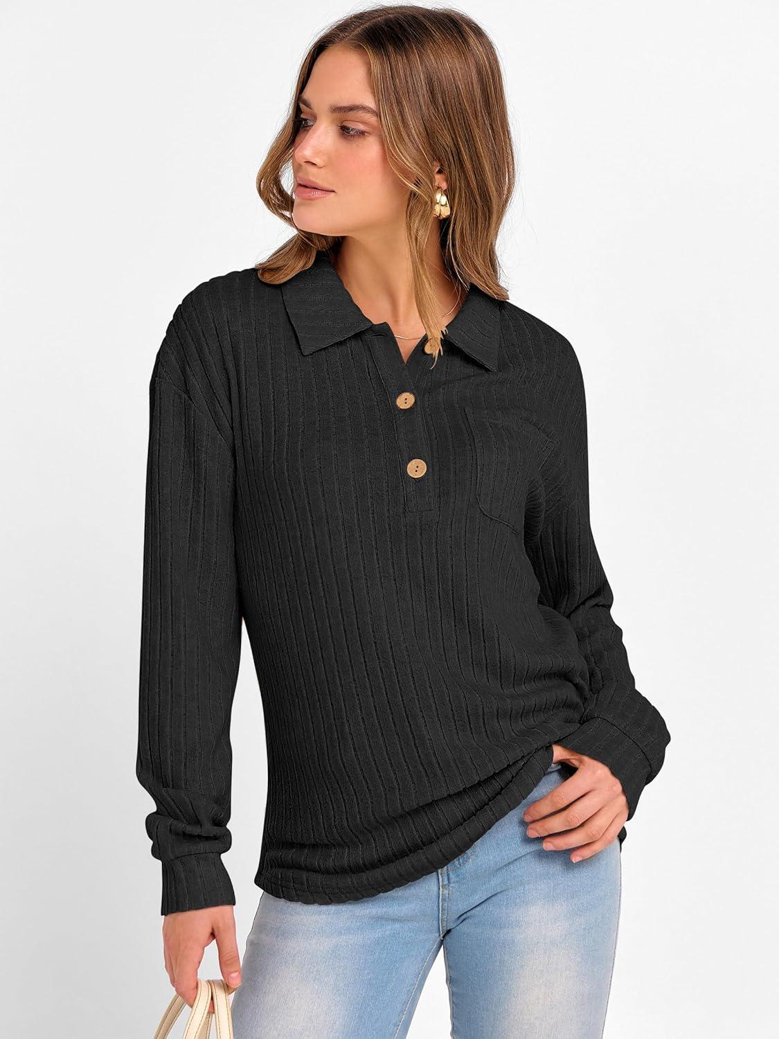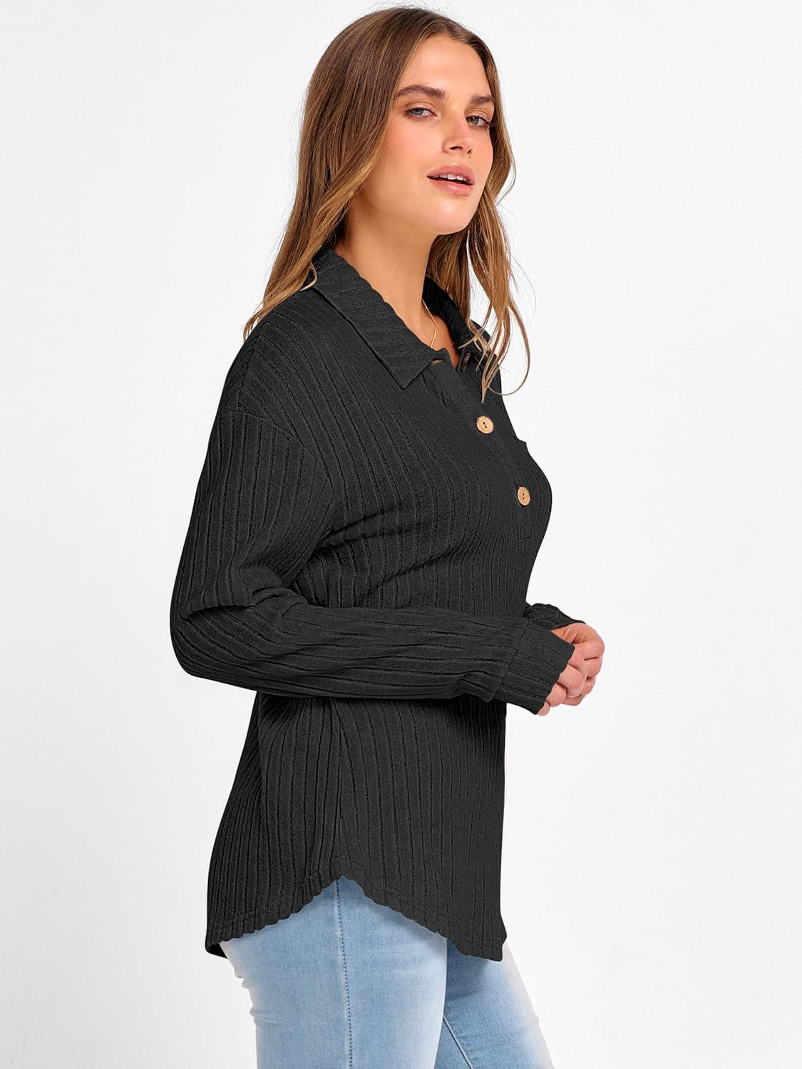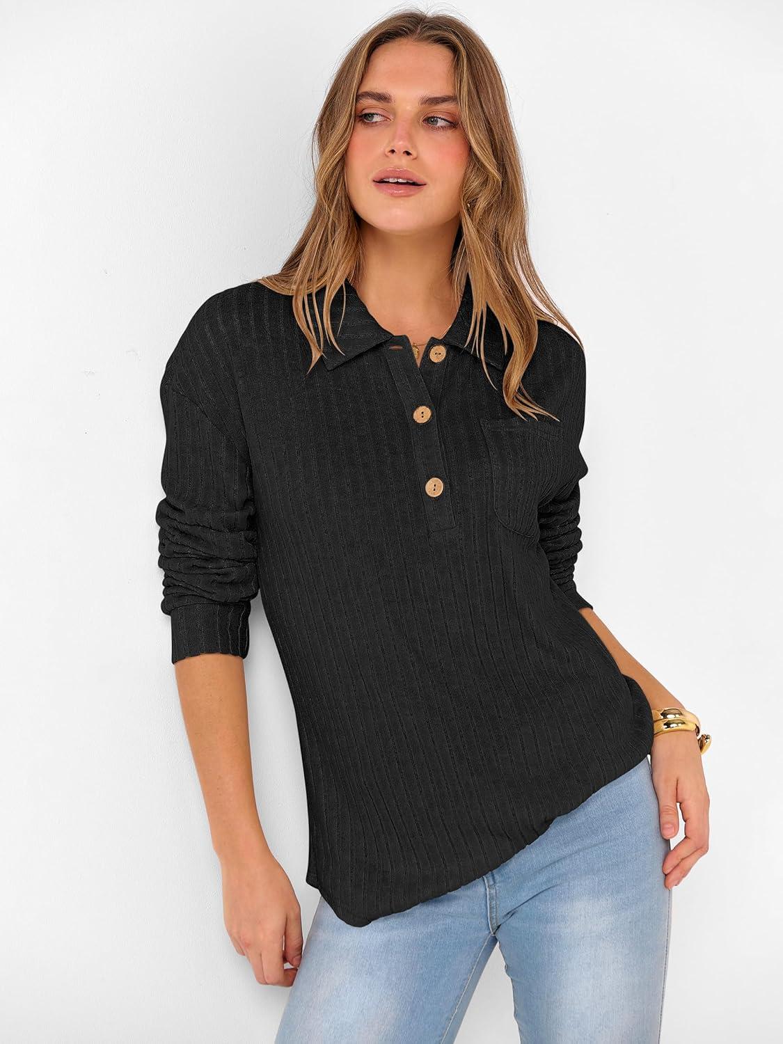 ANRABESS Women Long Sleeve Henley Shirts Ribbed Knit Lightweight Sweaters Business Casual Work Tops 2025 Fall Trendy Outfits(Black)