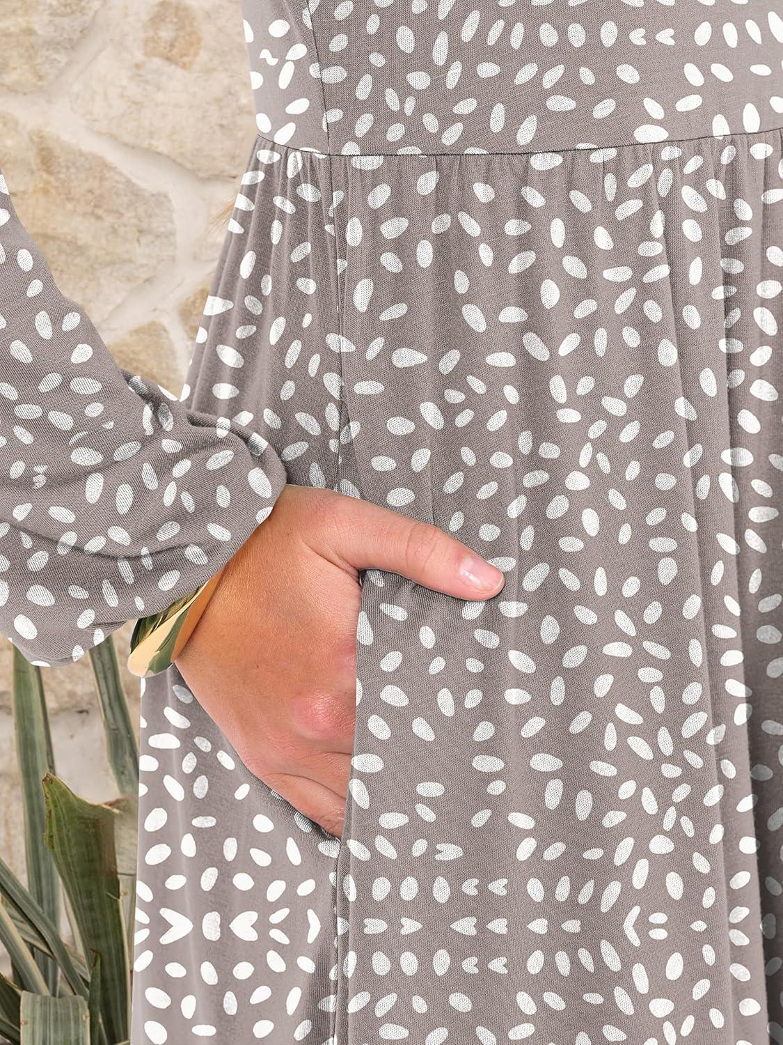 ANRABESS Women Long Sleeve Midi Dress Crewneck 2025 Fall Fashion Casual Flowy A-Line Long Dresses Vacation Outfit with Pocket(Grey Khaki White Dot)