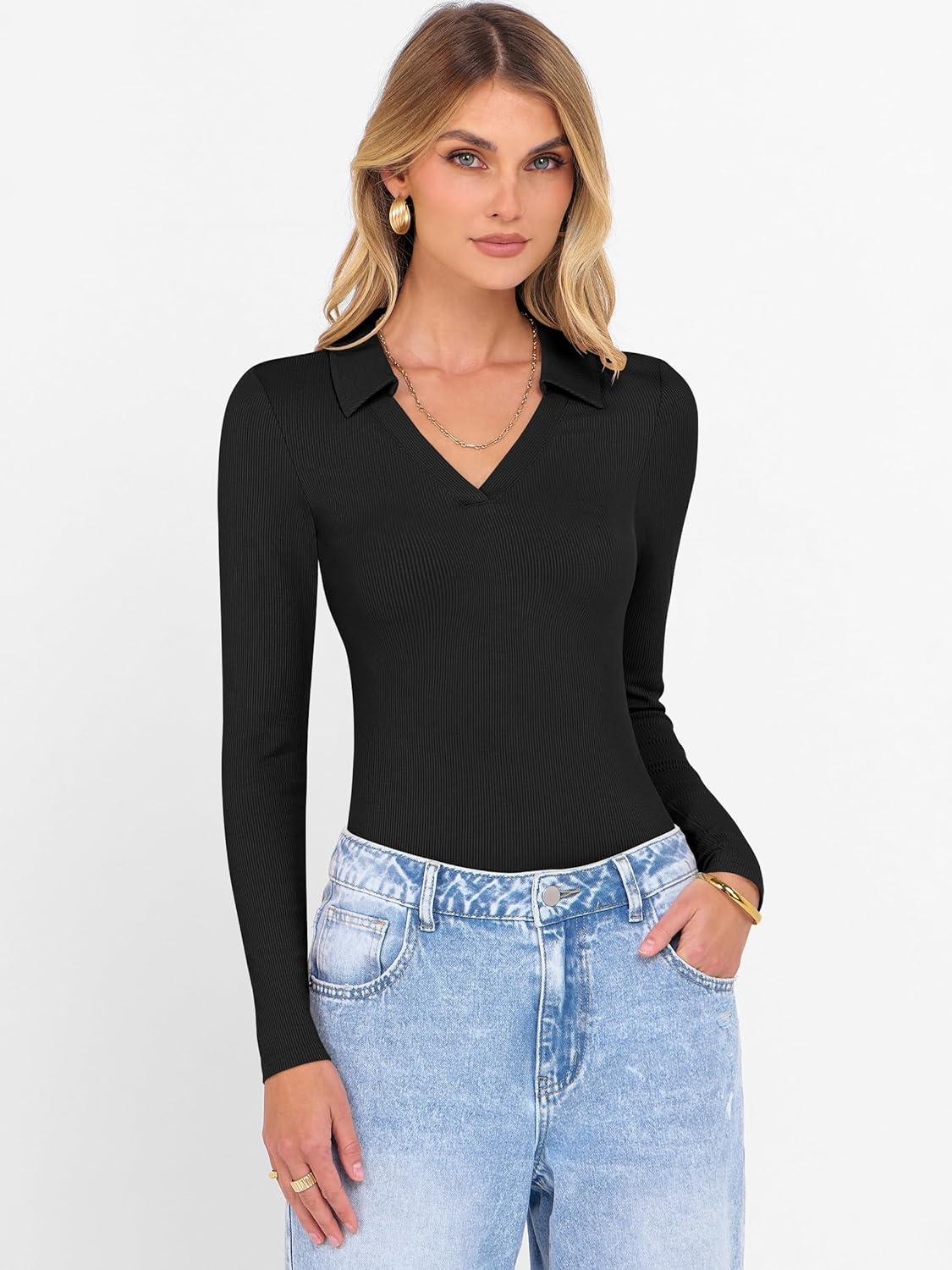 imageANRABESS Women Long Sleeve Polo Shirts V Neck Slim Rib Knit Collared Dressy Business Casual Top 2025 Basic Tee Fall OutfitsBlack