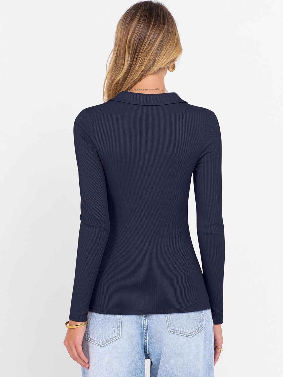 ANRABESS Women Long Sleeve Polo Shirts V Neck Slim Rib Knit Collared Dressy Business Casual Top 2025 Basic Tee Fall Outfits(Navy Blue)