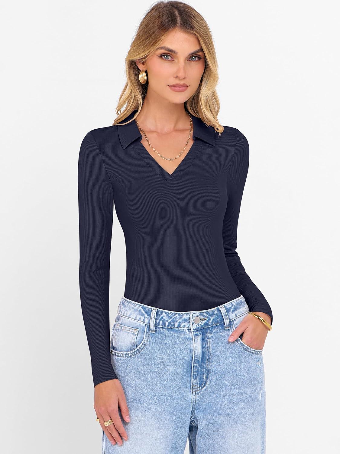 imageANRABESS Women Long Sleeve Polo Shirts V Neck Slim Rib Knit Collared Dressy Business Casual Top 2025 Basic Tee Fall OutfitsNavy Blue