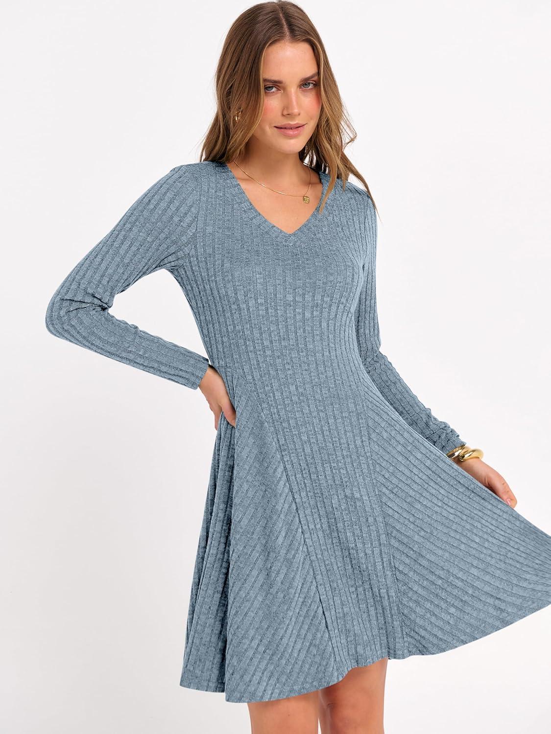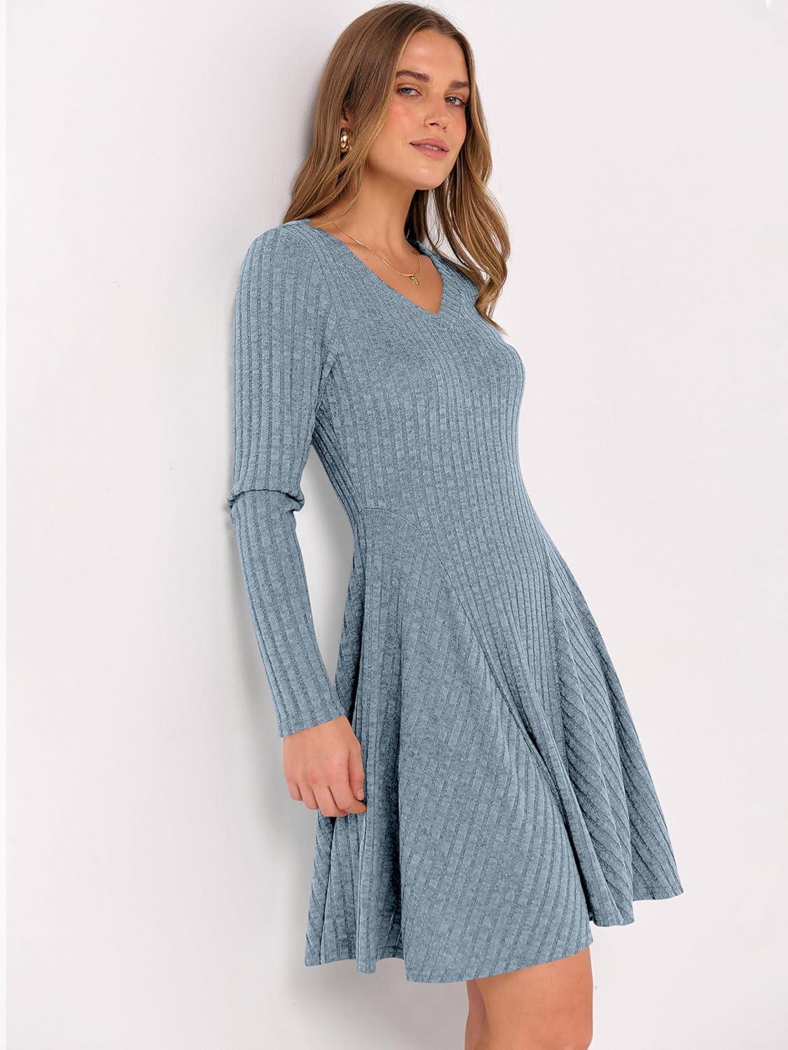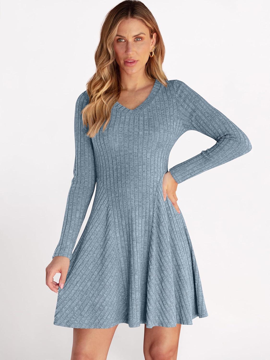 ANRABESS Women Long Sleeve Ribbed Knit Short Dresses 2025 Fall Winter V Neck Casual Swing A Line Sweater Dress(Blue)