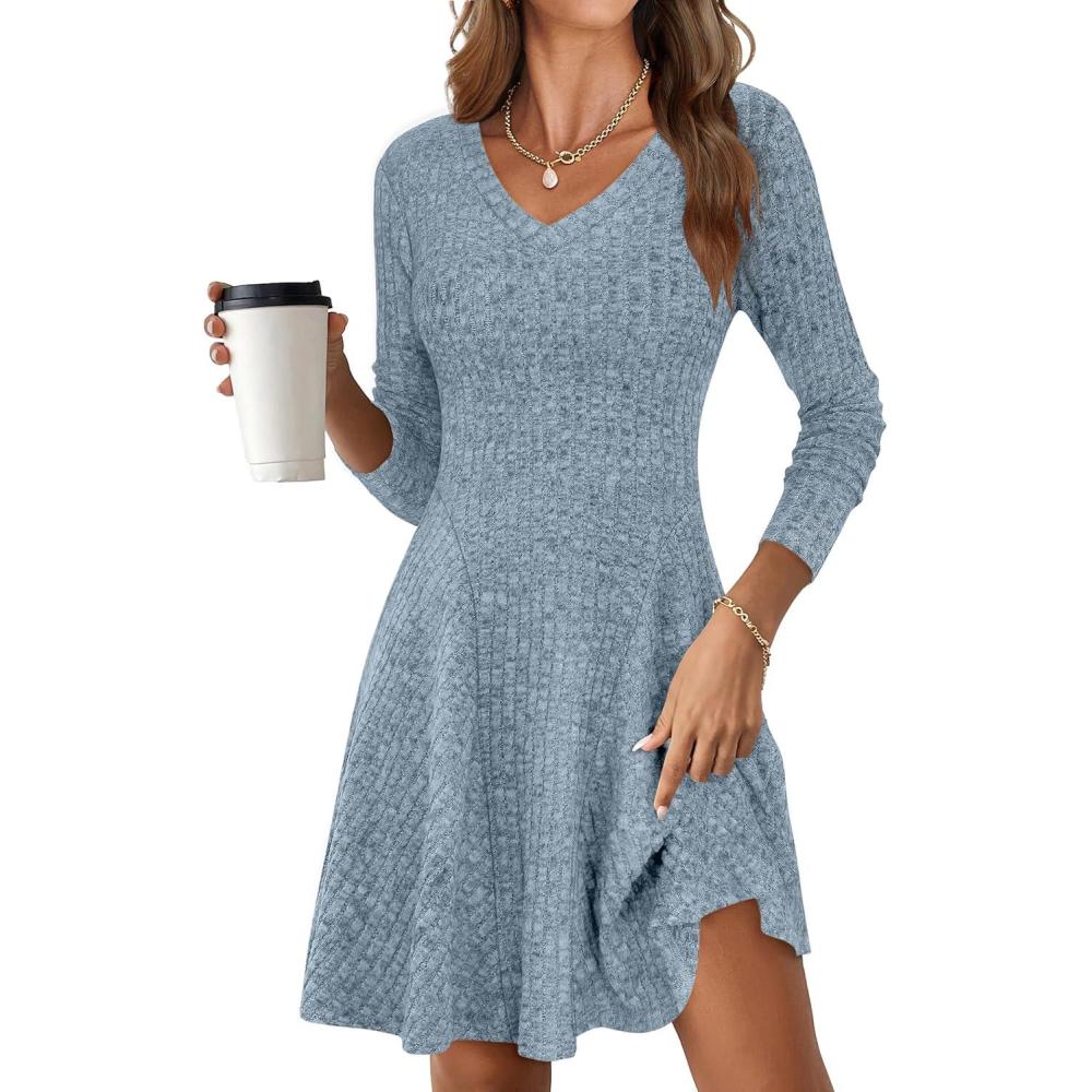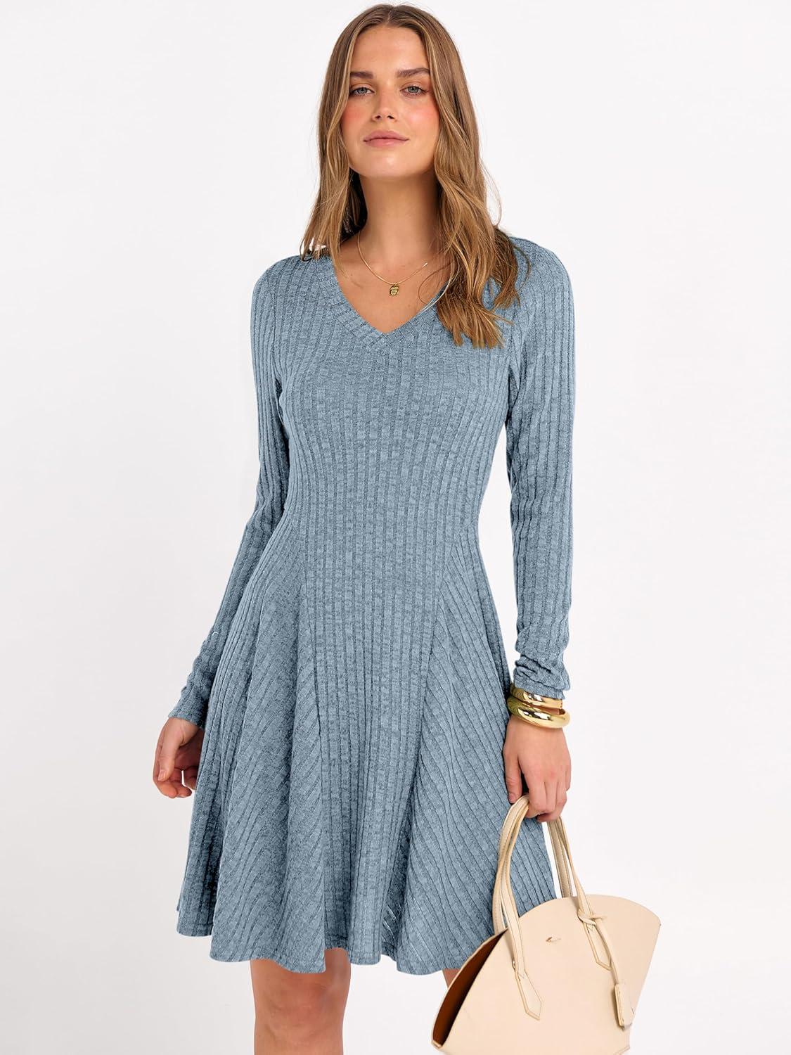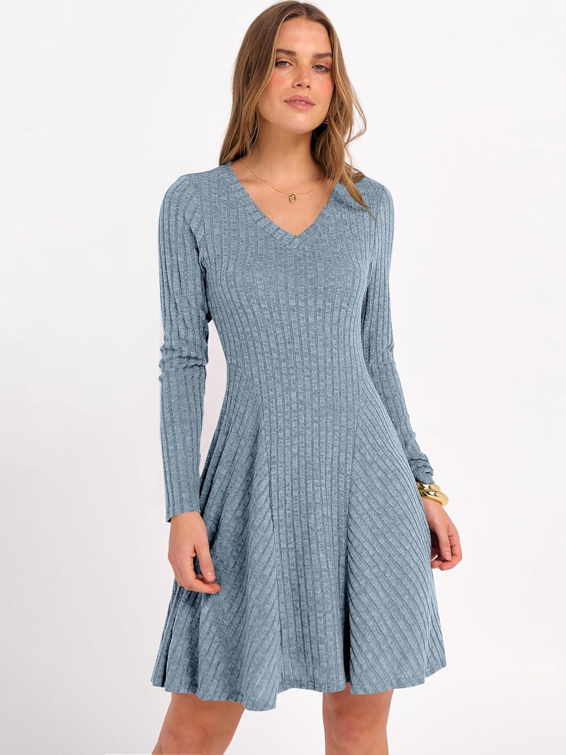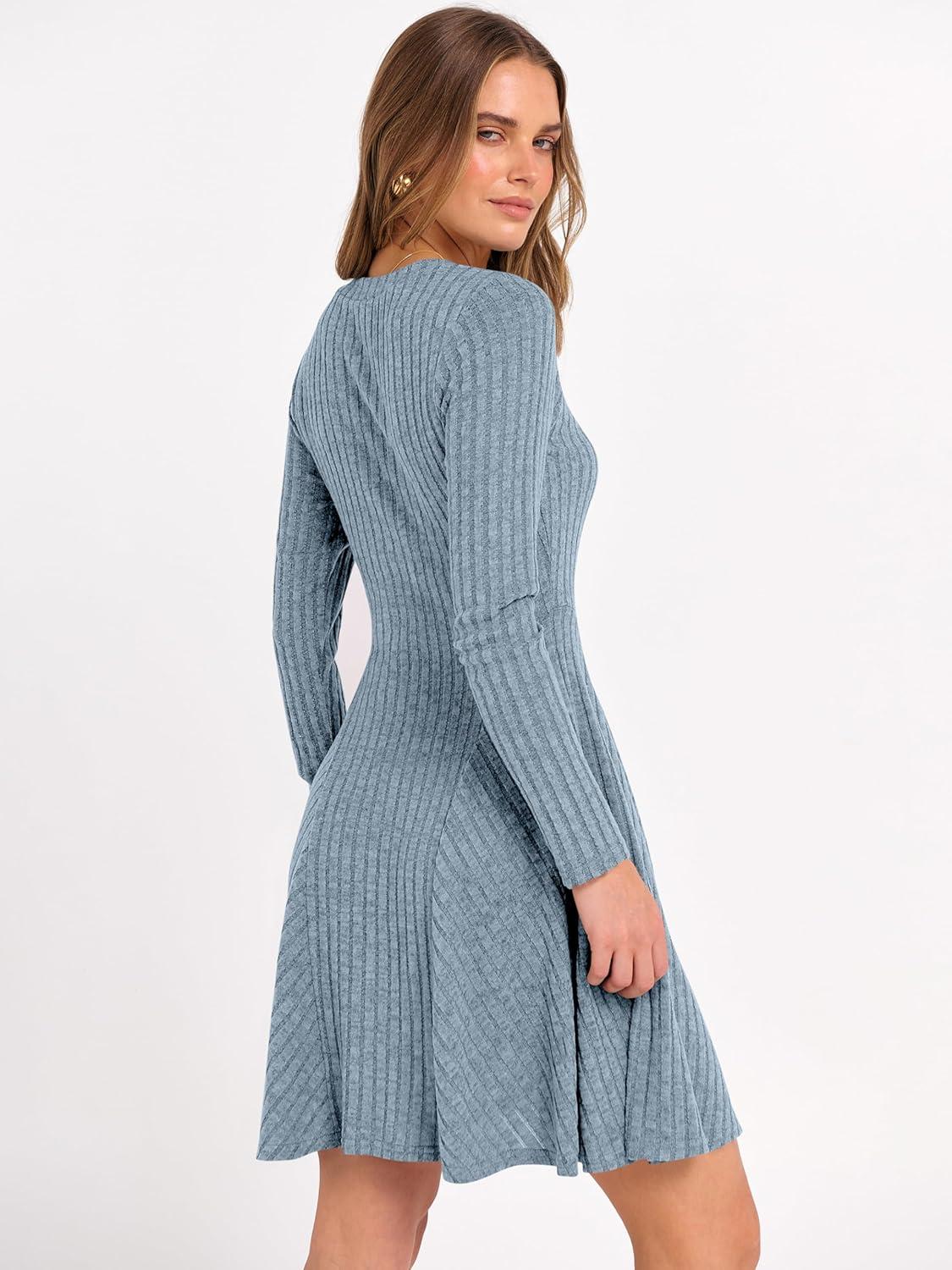 ANRABESS Women Long Sleeve Ribbed Knit Short Dresses 2025 Fall Winter V Neck Casual Swing A Line Sweater Dress(Blue)