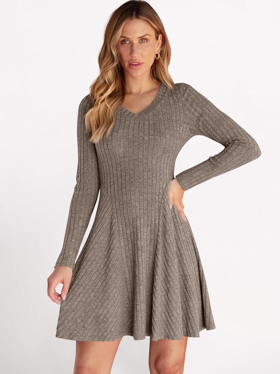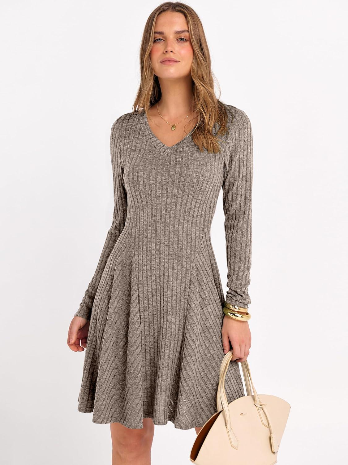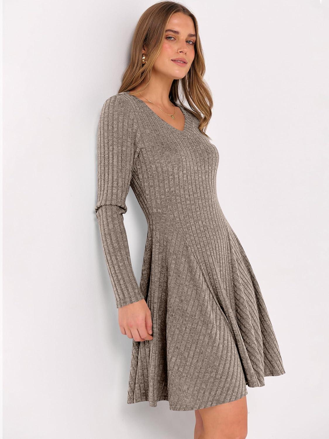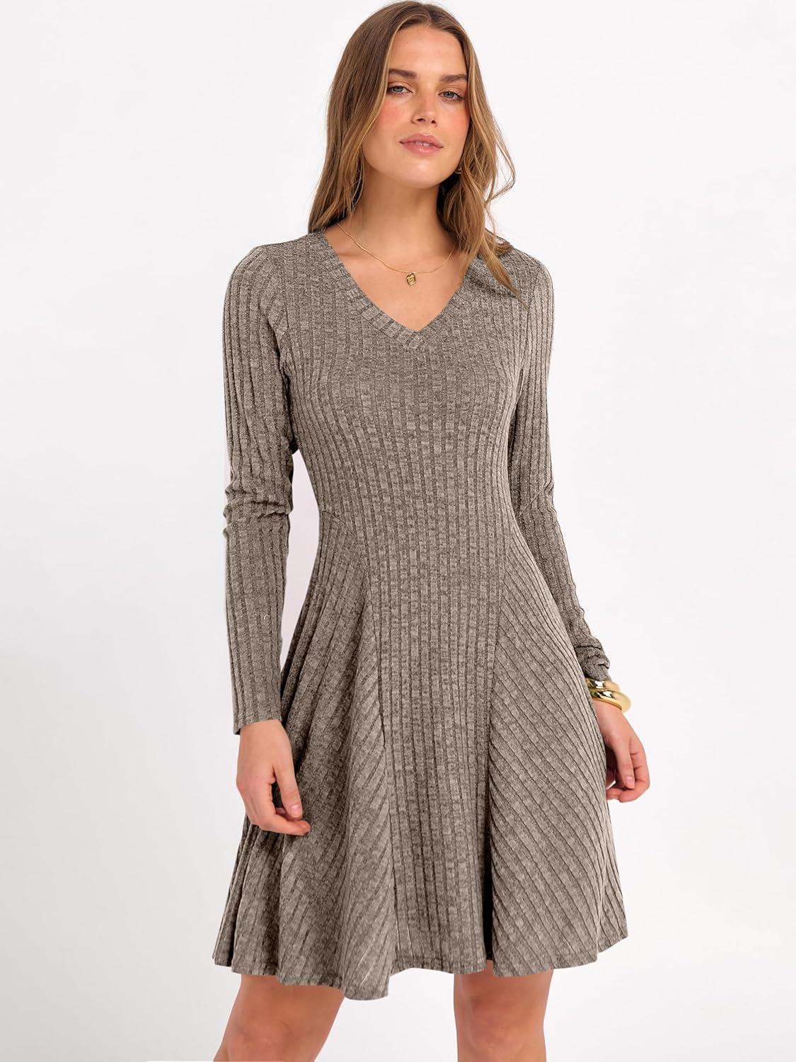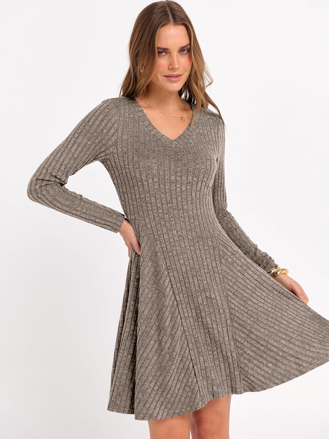 ANRABESS Women Long Sleeve Ribbed Knit Short Dresses 2025 Fall Winter V Neck Casual Swing A Line Sweater Dress(Cool Ash Brown)