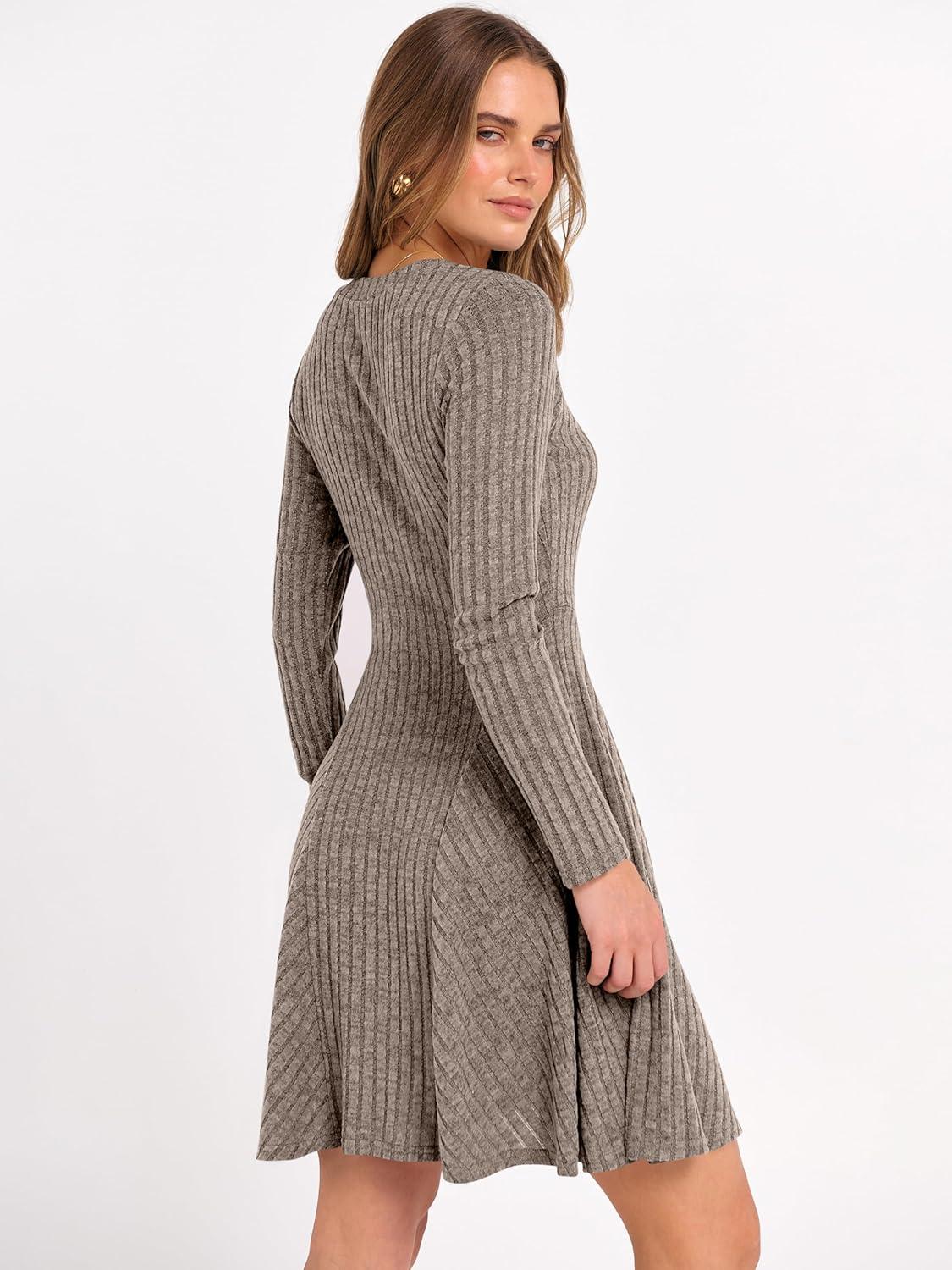 imageANRABESS Women Long Sleeve Ribbed Knit Short Dresses 2025 Fall Winter V Neck Casual Swing A Line Sweater DressCool Ash Brown