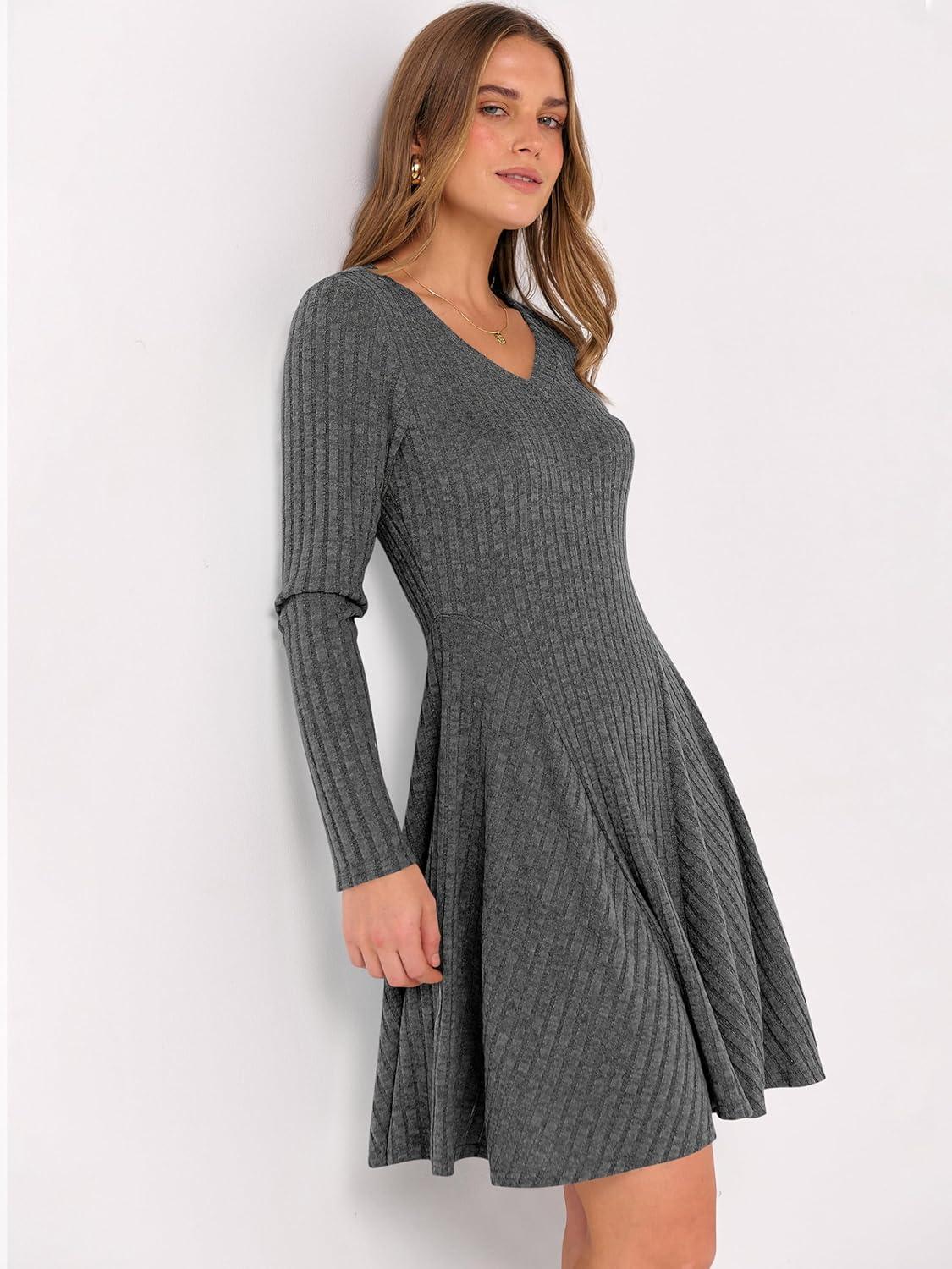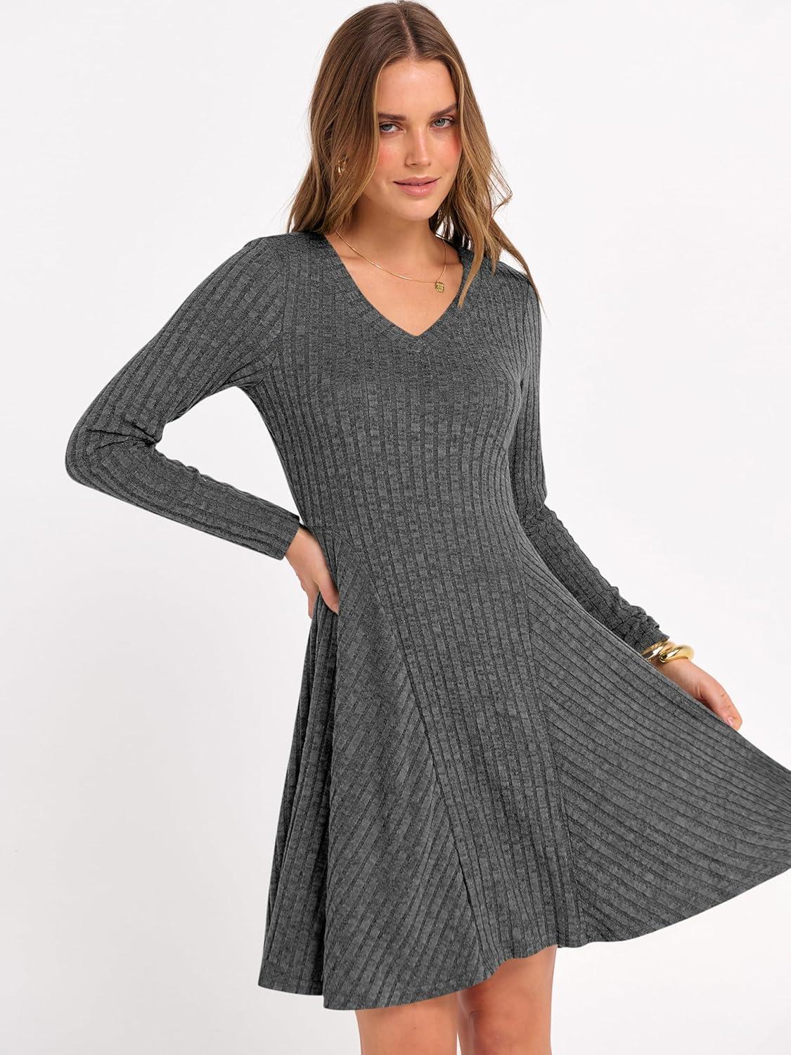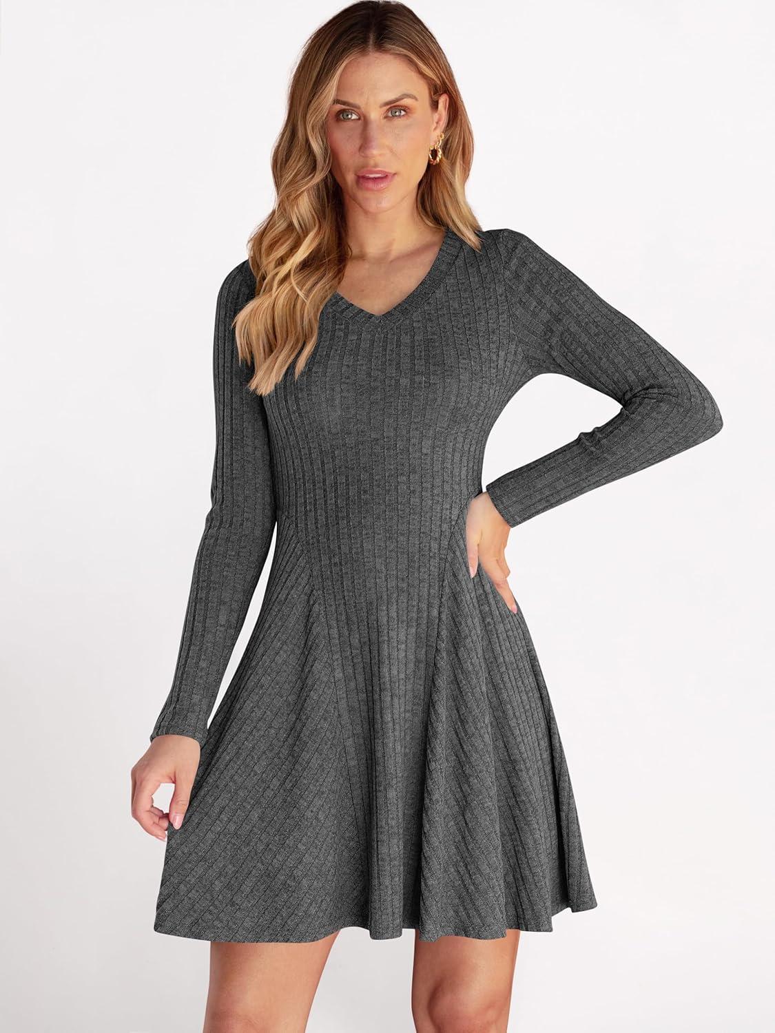 ANRABESS Women Long Sleeve Ribbed Knit Short Dresses 2025 Fall Winter V Neck Casual Swing A Line Sweater Dress(Deep Grey)