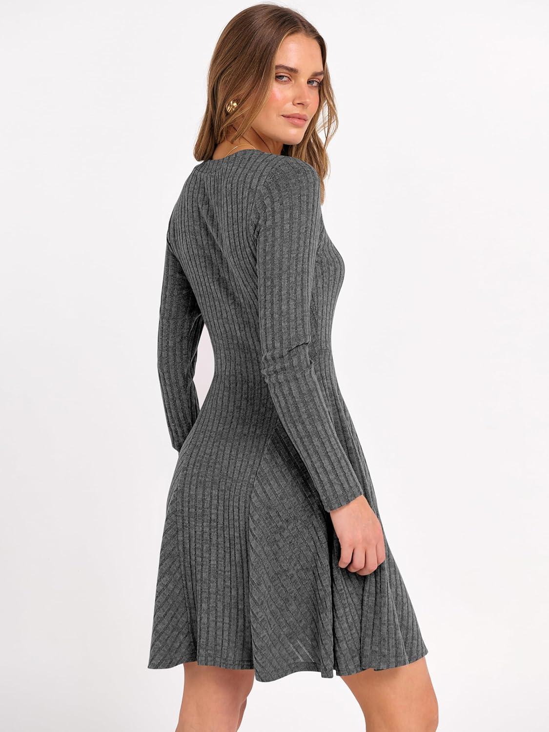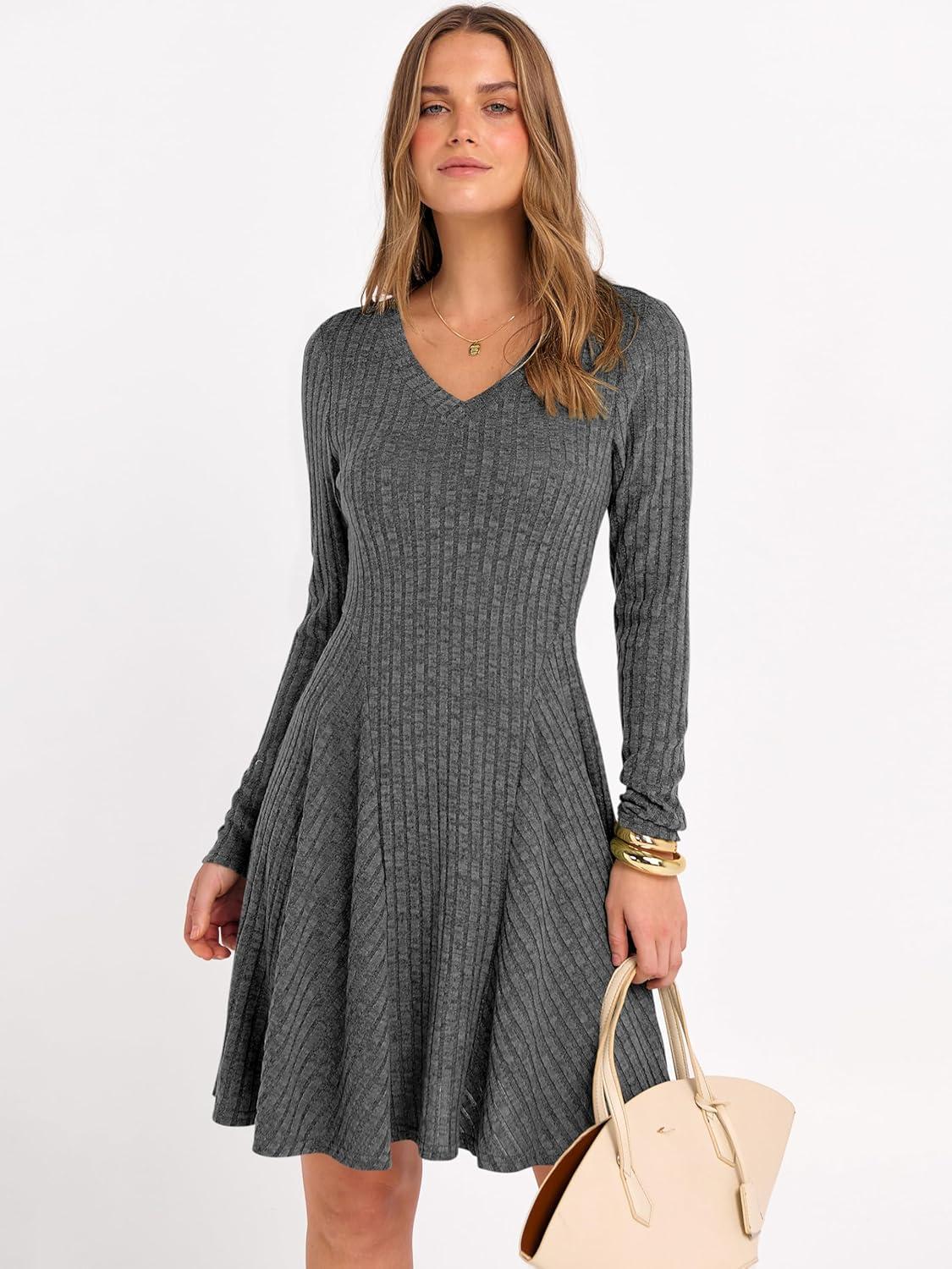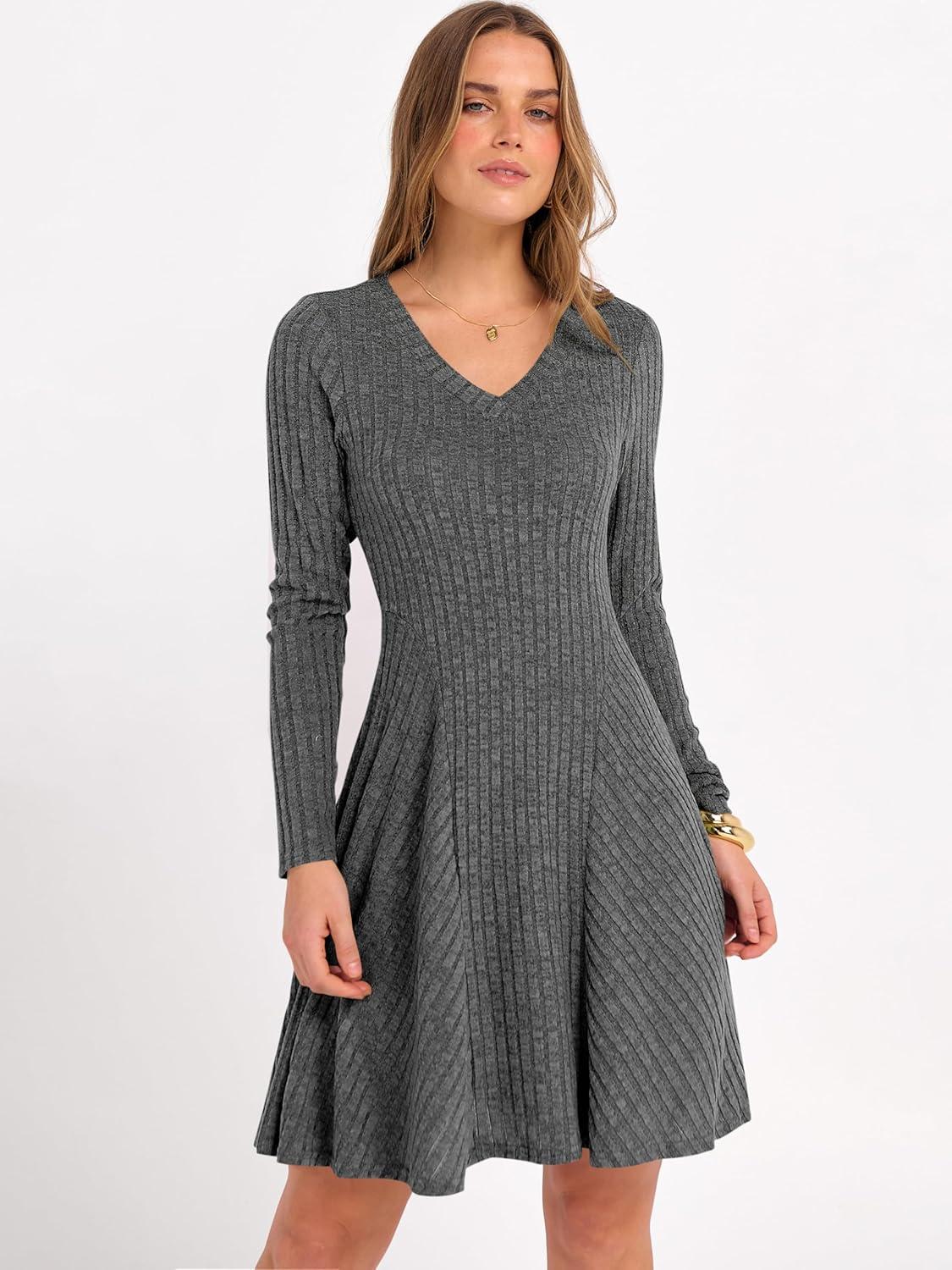ANRABESS Women Long Sleeve Ribbed Knit Short Dresses 2025 Fall Winter V Neck Casual Swing A Line Sweater Dress(Deep Grey)