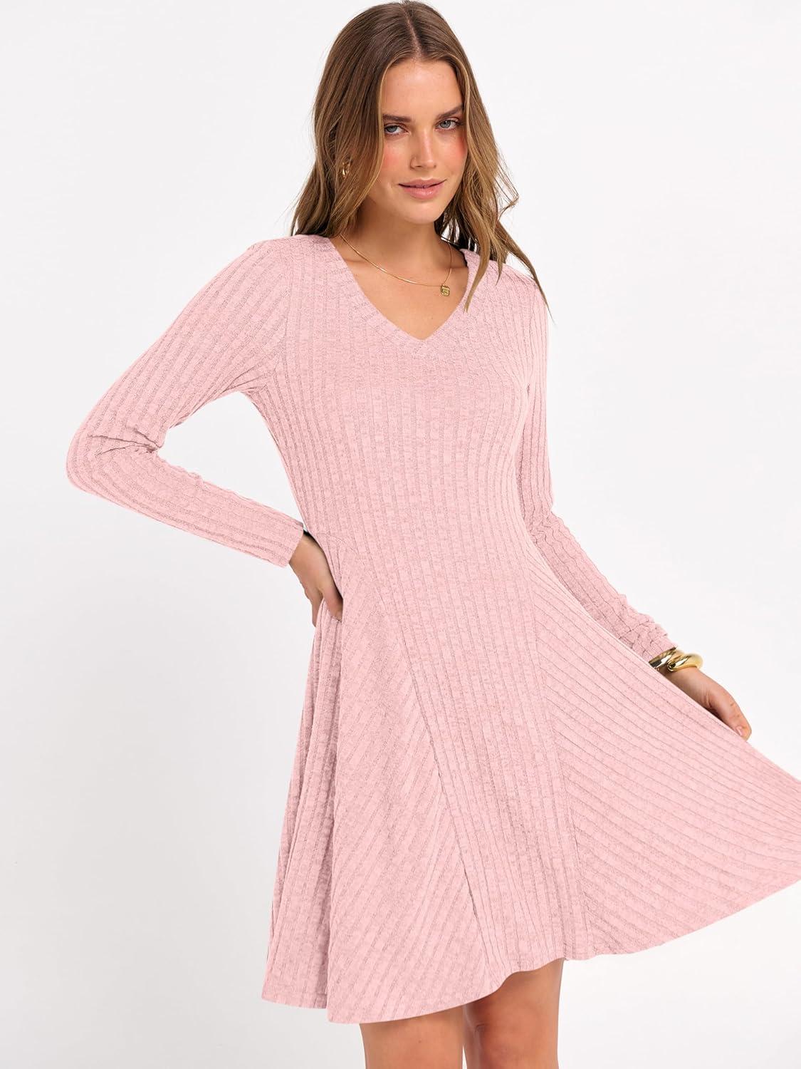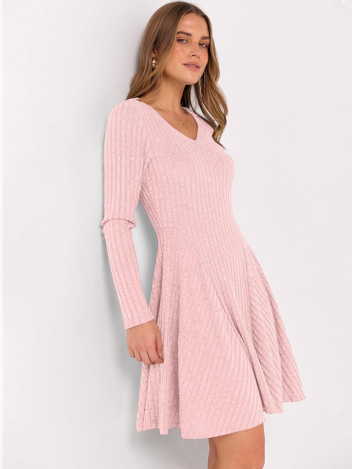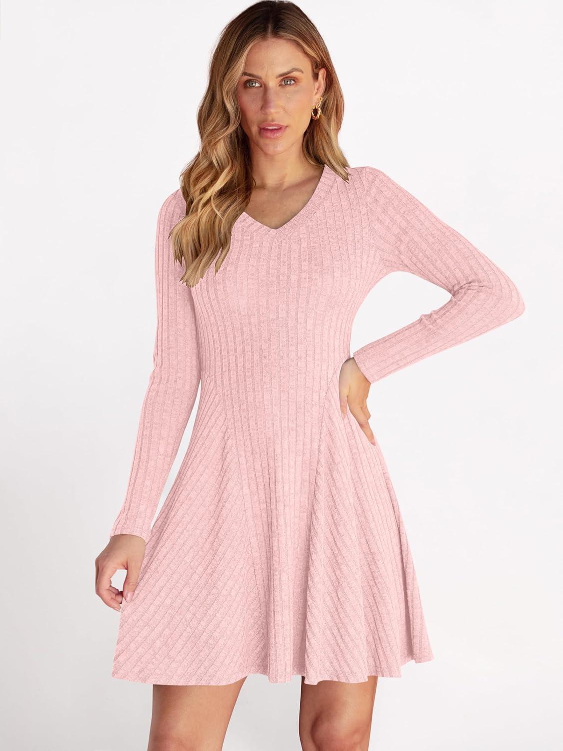 ANRABESS Women Long Sleeve Ribbed Knit Short Dresses 2025 Fall Winter V Neck Casual Swing A Line Sweater Dress(Pink)