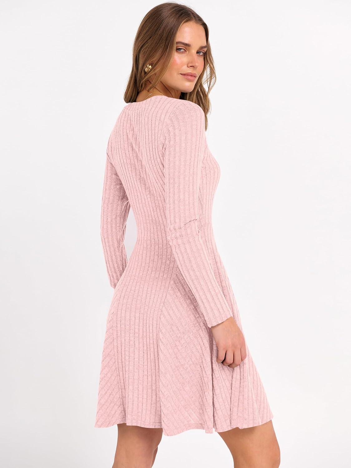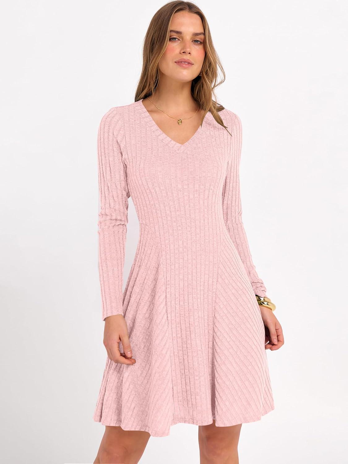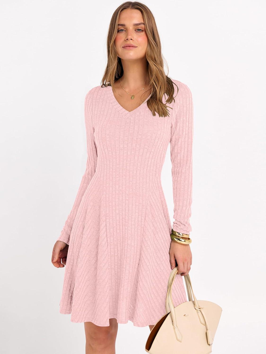 ANRABESS Women Long Sleeve Ribbed Knit Short Dresses 2025 Fall Winter V Neck Casual Swing A Line Sweater Dress(Pink)