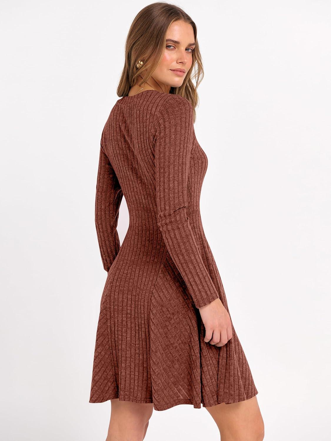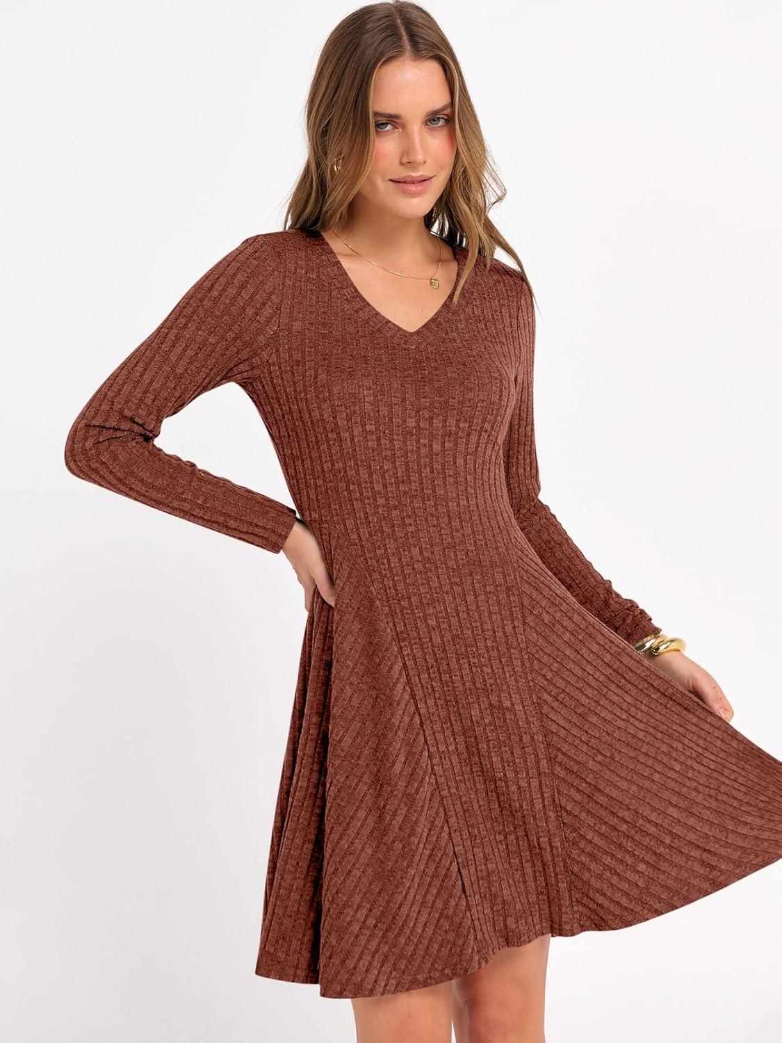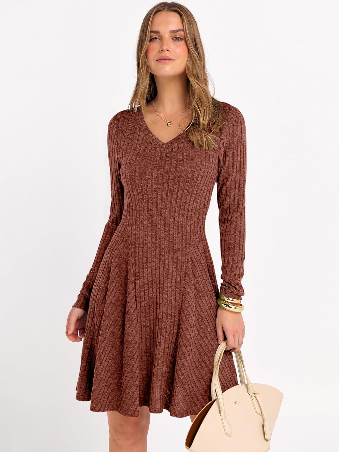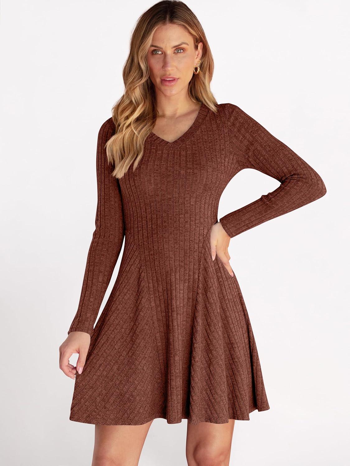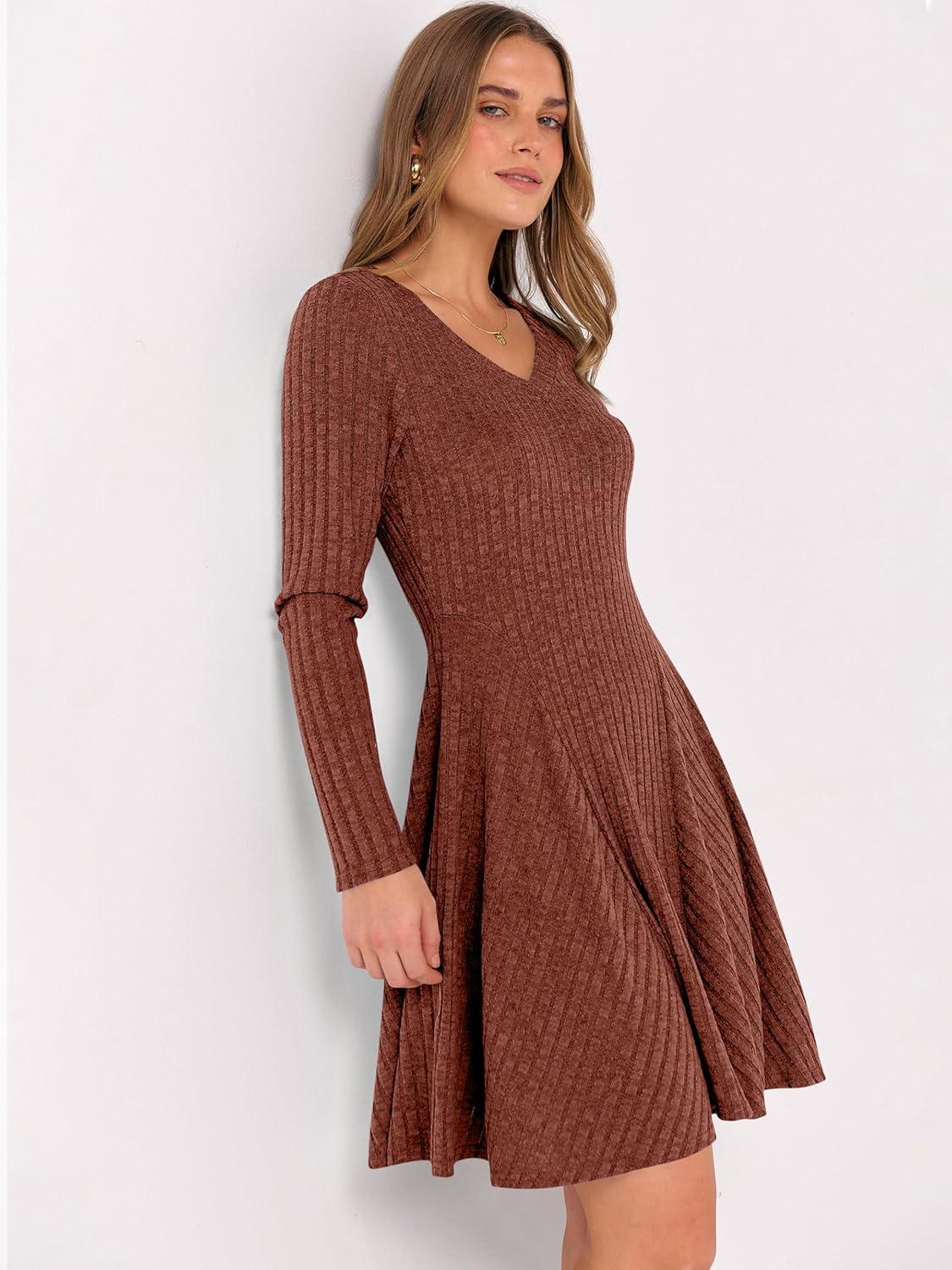 ANRABESS Women Long Sleeve Ribbed Knit Short Dresses 2025 Fall Winter V Neck Casual Swing A Line Sweater Dress(Rust Orange)