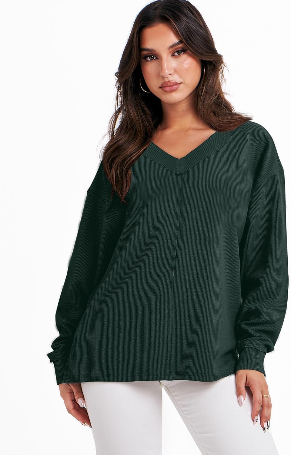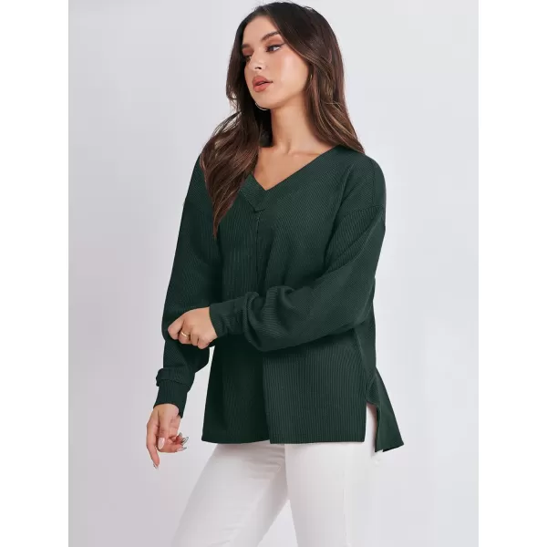 ANRABESS Women Long Sleeve Shirt V Neck Off Shoulder Oversized Knit Pullover Sweatshirt Loose High Low Fall Tunic Tops(Dark Green)