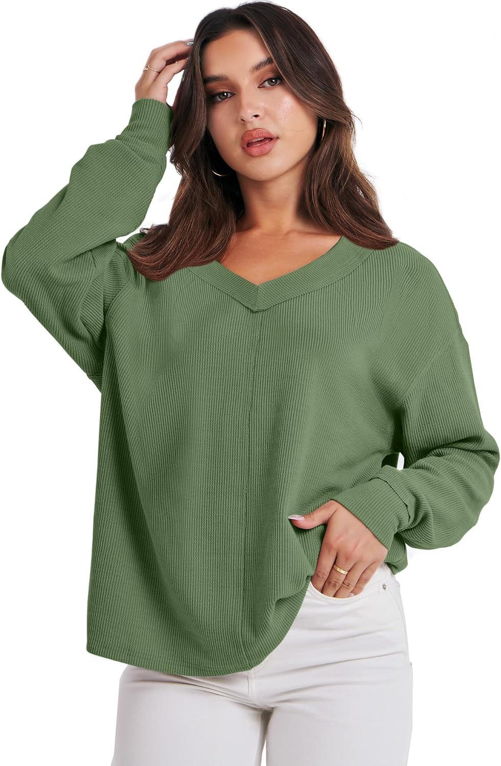 ANRABESS Women Long Sleeve Shirt V Neck Off Shoulder Oversized Knit Pullover Sweatshirt Loose High Low Fall Tunic Tops(Green)