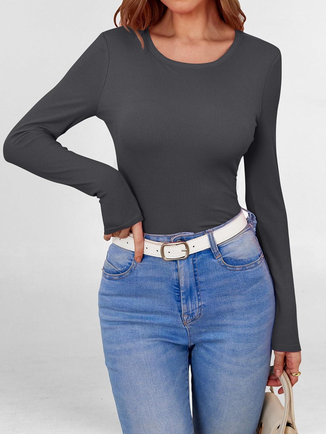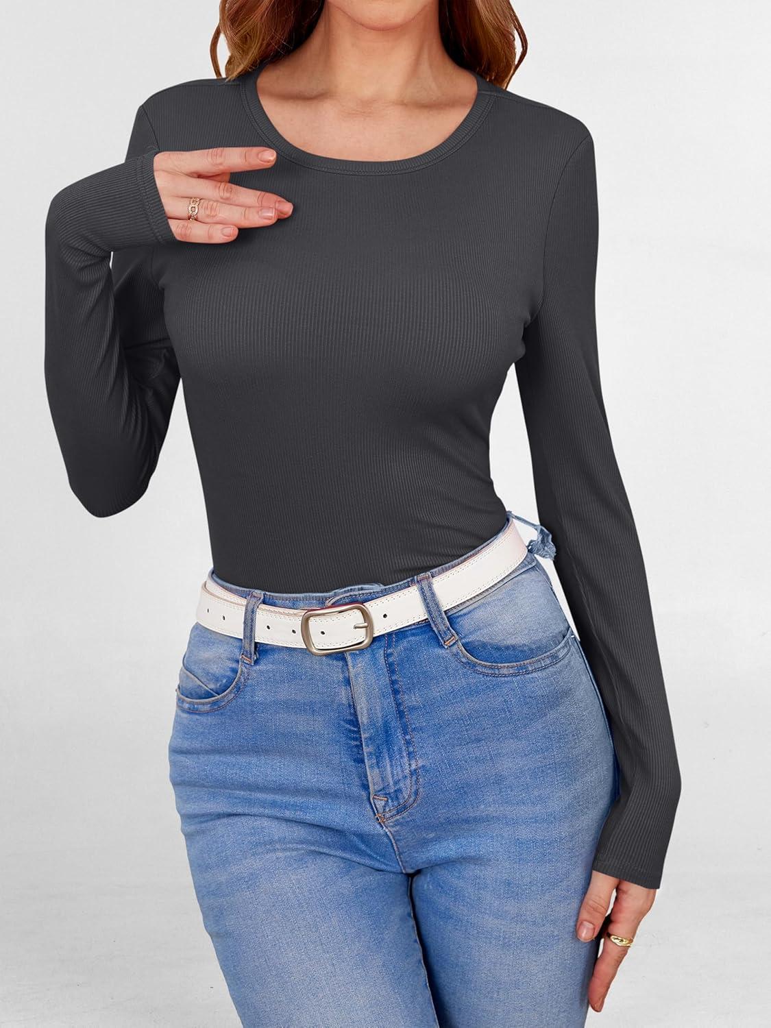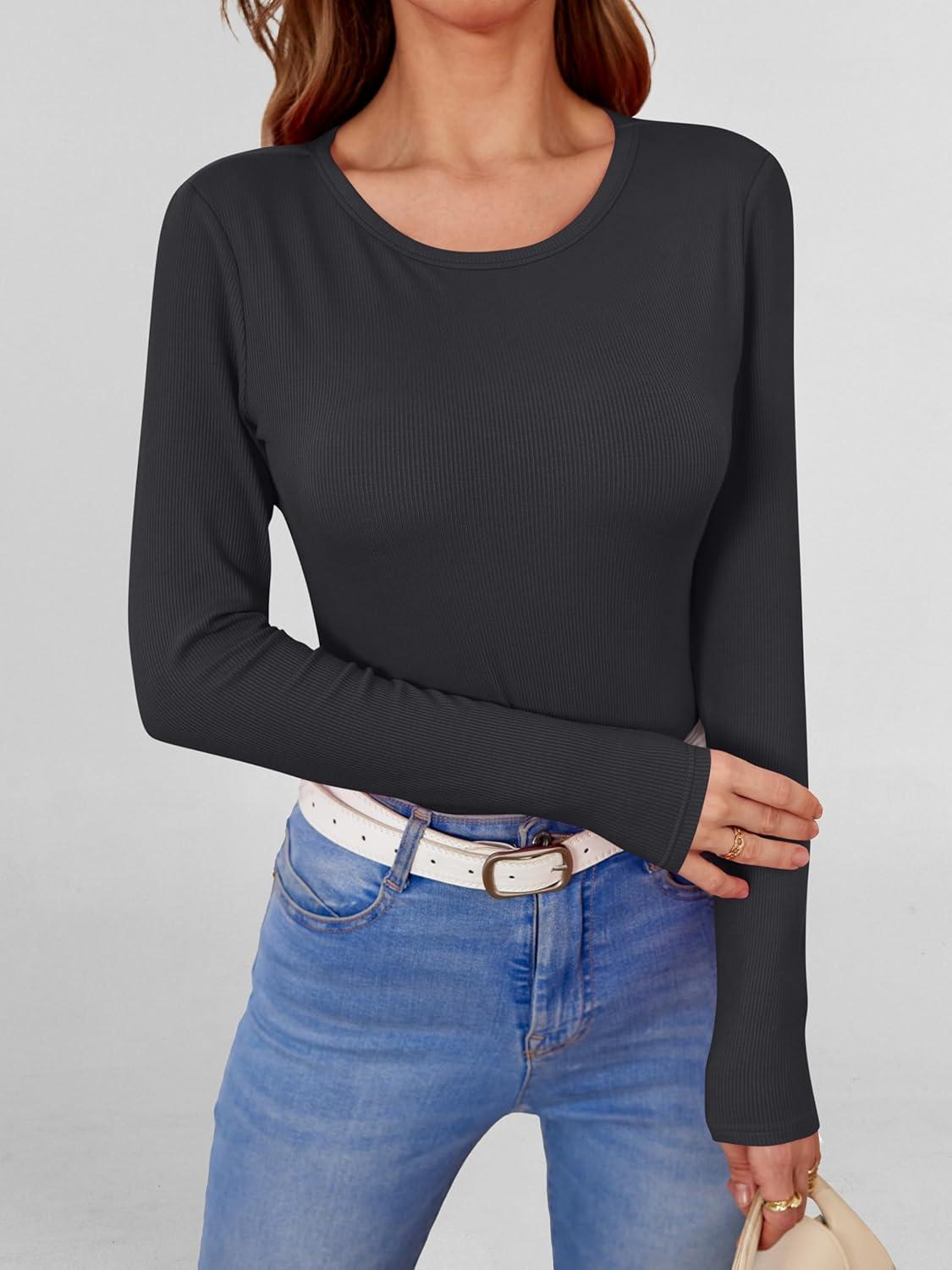 ANRABESS Women Long Sleeve Shirts Built-in Bra Crewneck Rib Knit Slim Fit Basic Tee Tops 2025 Fall Casual T-Shirt Base Layer(Deep Grey)
