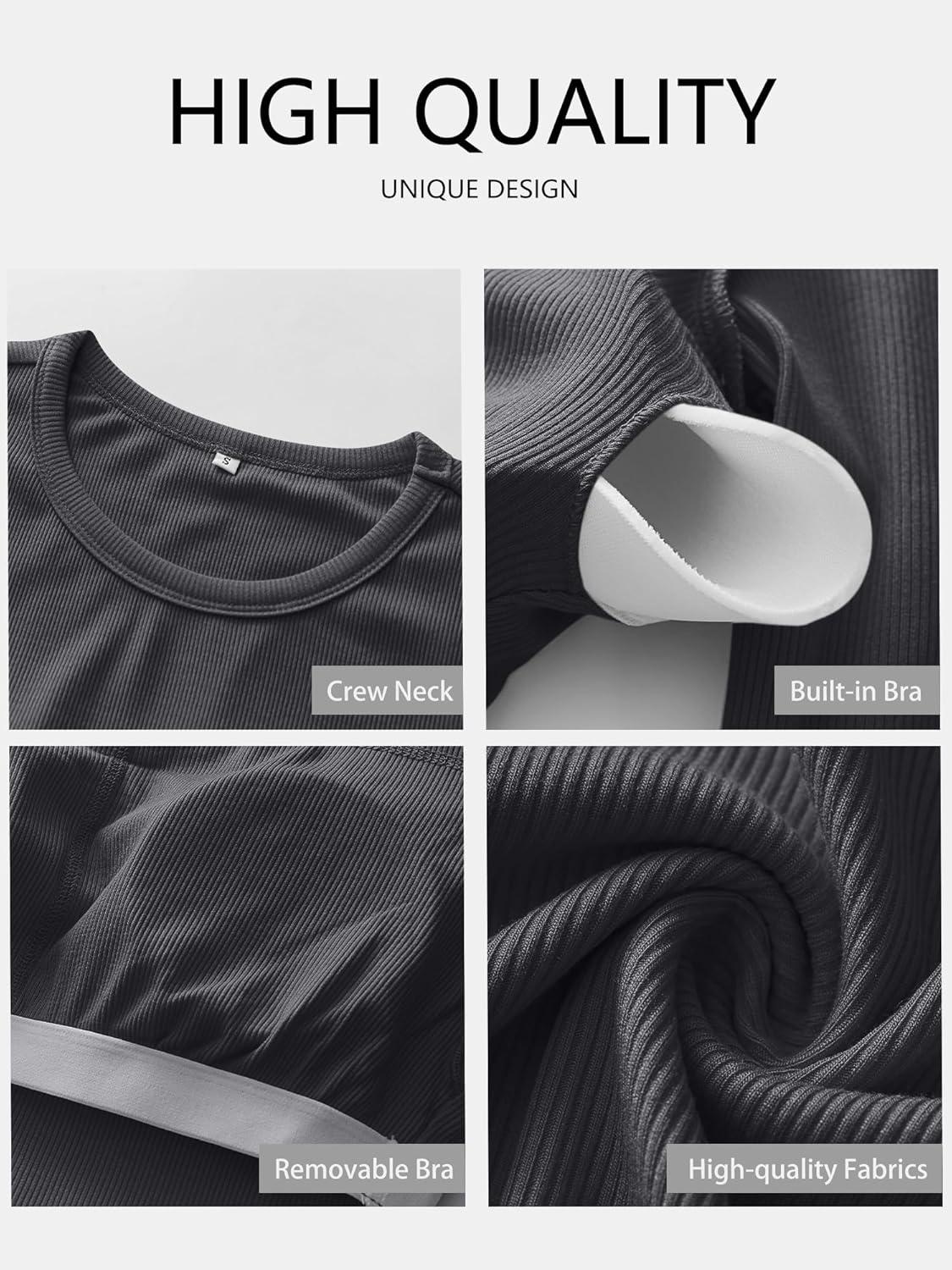 Women's Fall Long Sleeve T Shirts with Built-in Shelf Bra Crewneck Ribbed Knit Slim Fit Casual Basic Tee Tops