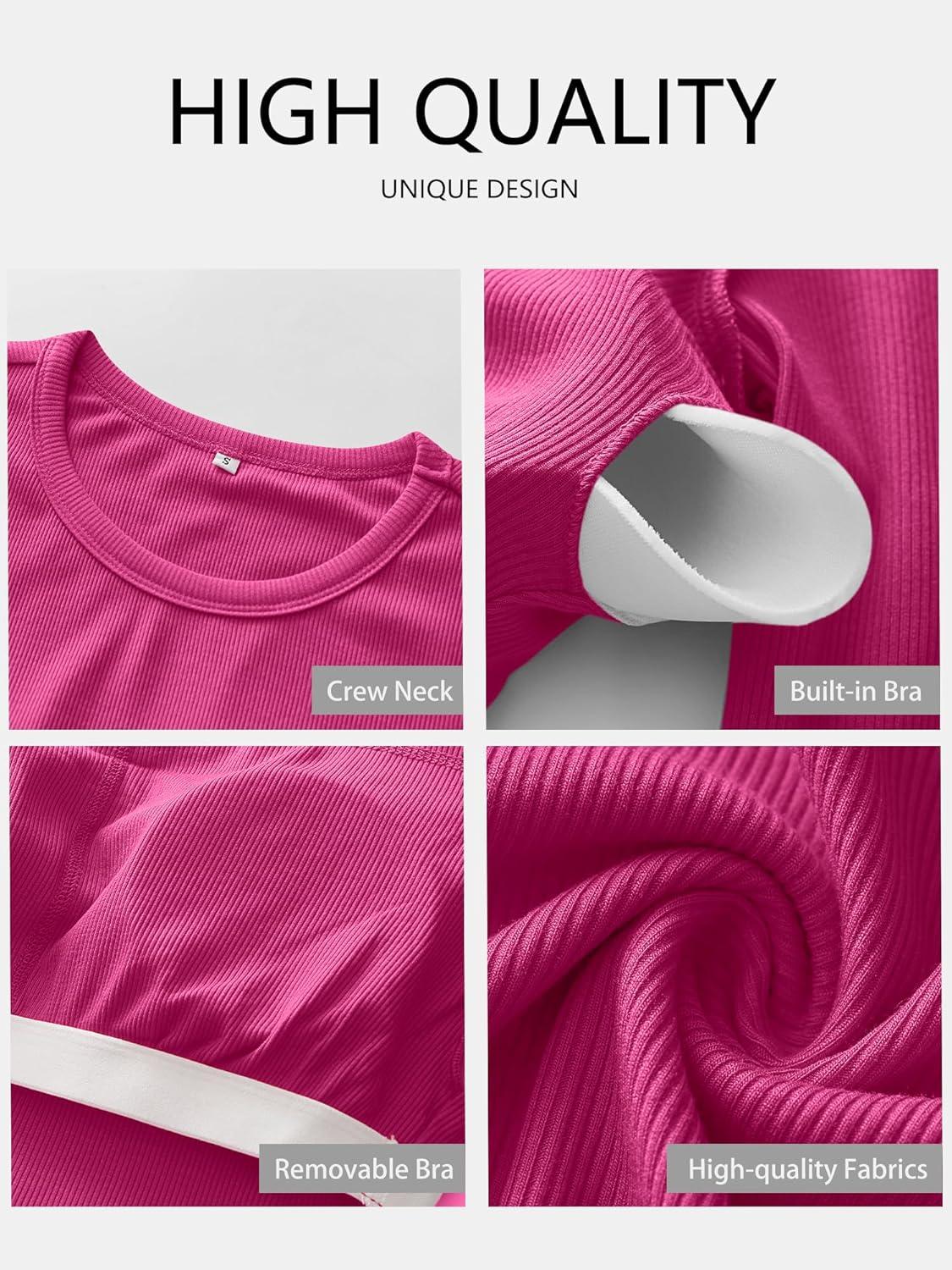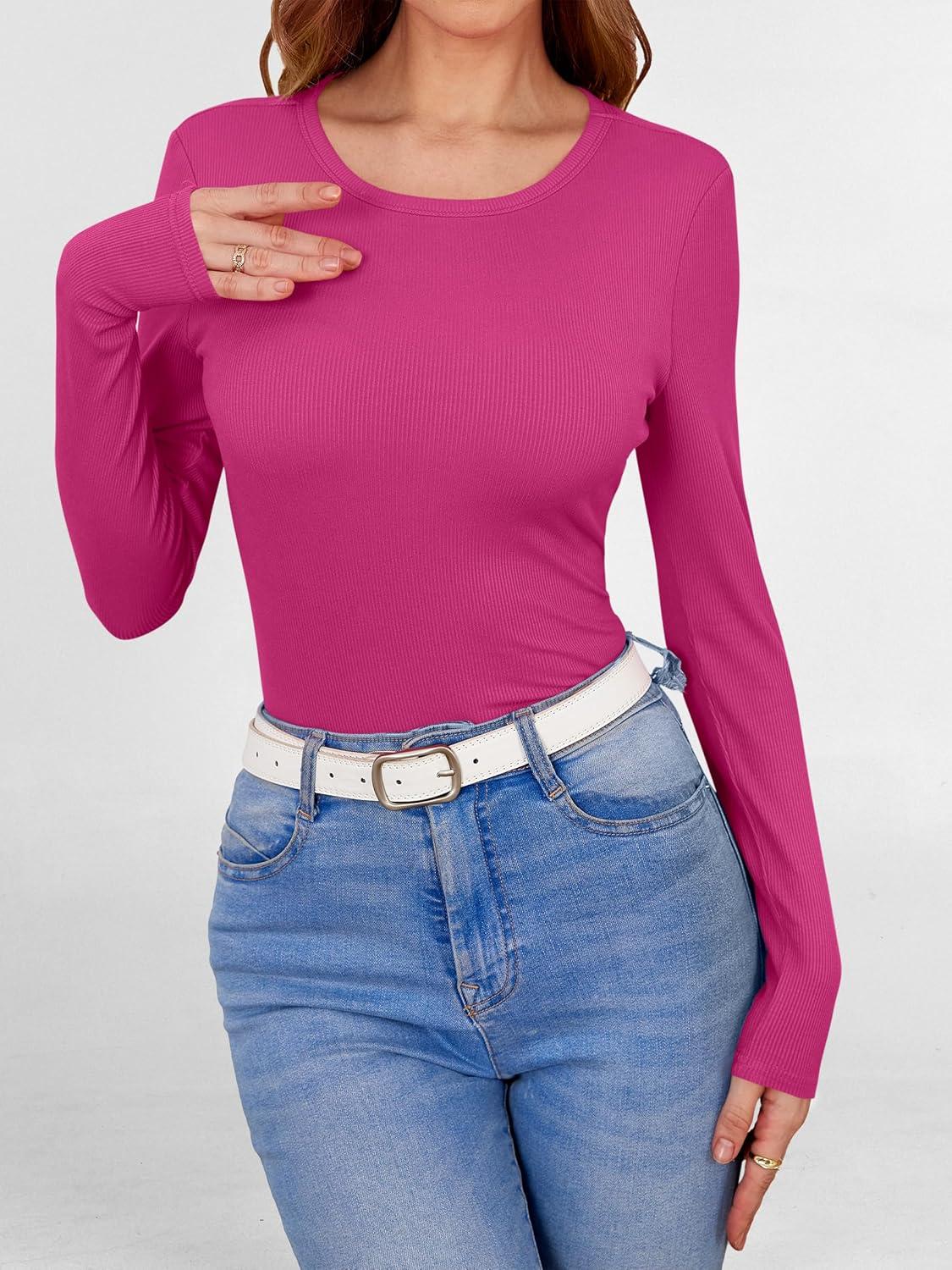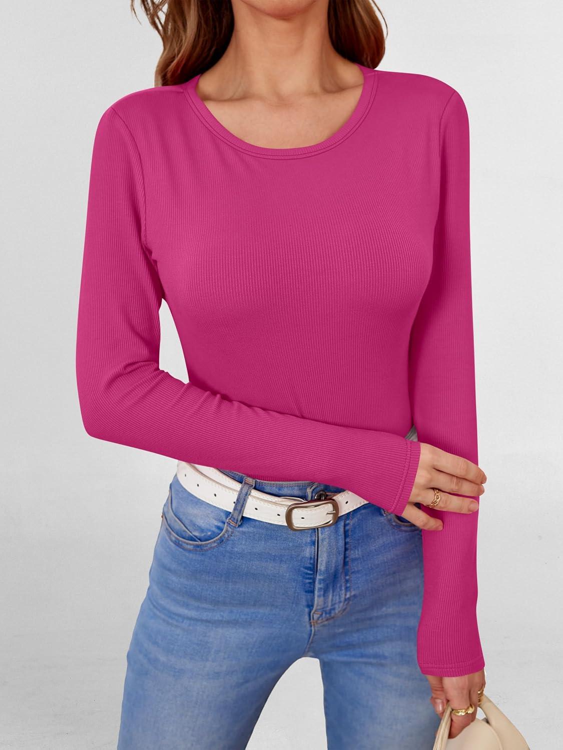 Women's Fall Long Sleeve T Shirts with Built-in Shelf Bra Crewneck Ribbed Knit Slim Fit Casual Basic Tee Tops