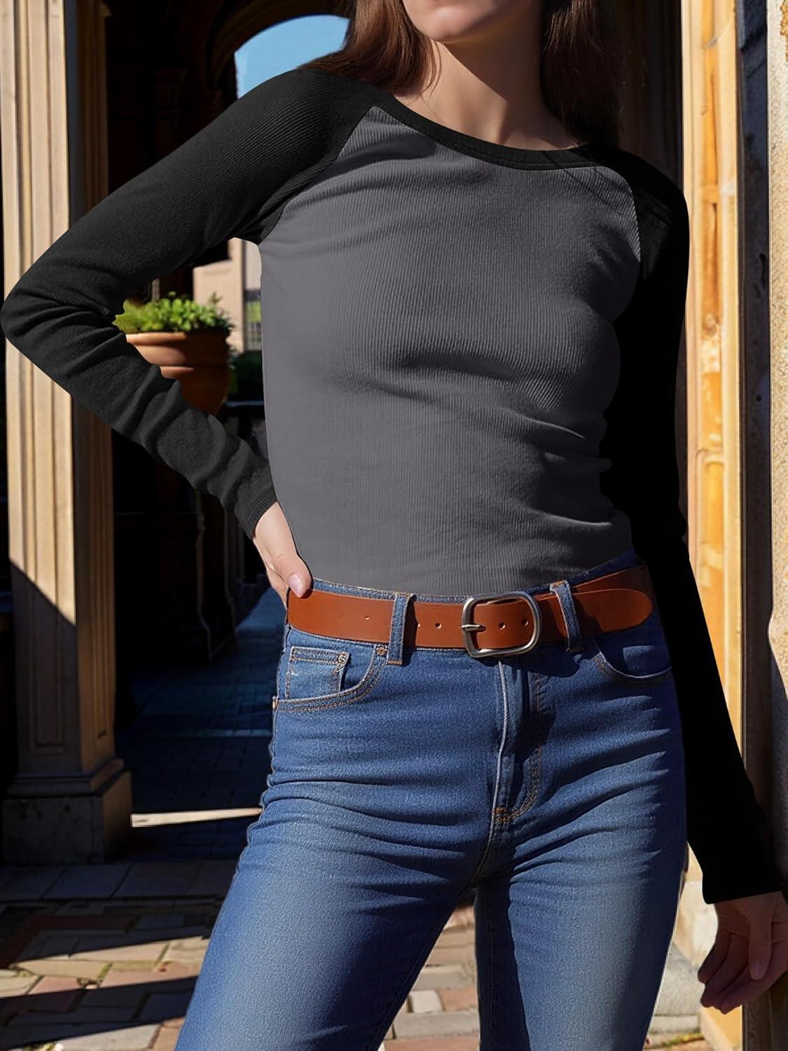 ANRABESS Women Long Sleeve Shirts Ribbed Knit Slim Fitted Tops Casual Basic Tight Tee T-Shirts 2025 Fall Underscrubs Layer(Grey Black)