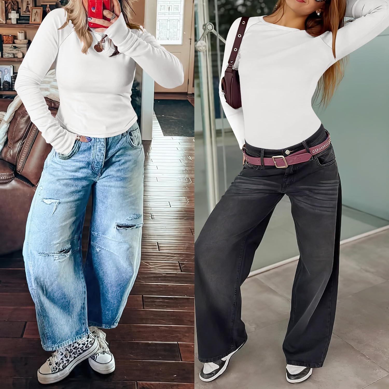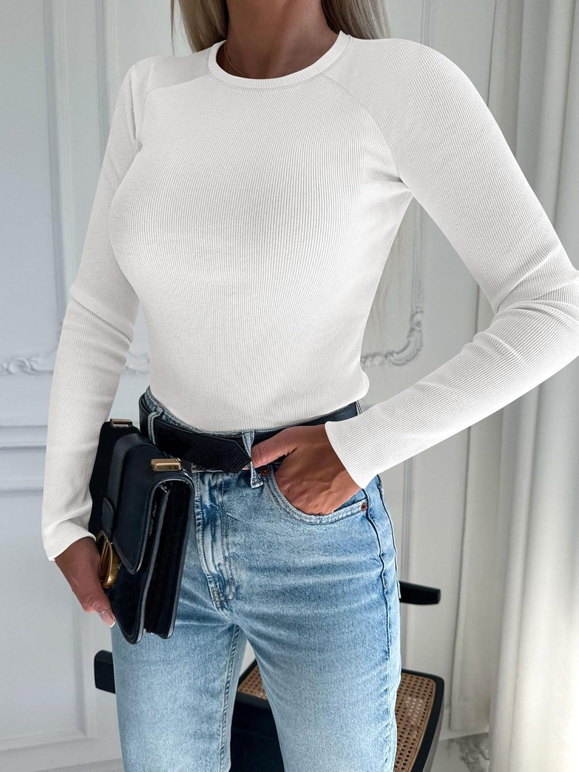 ANRABESS Women Long Sleeve Shirts Ribbed Knit Slim Fitted Tops Casual Basic Tight Tee T-Shirts 2025 Fall Underscrubs Layer(White)