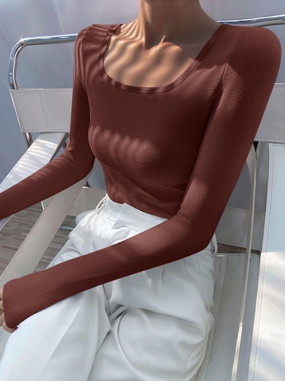 ANRABESS Women Long Sleeve Thermal Top Scoop Neck Slim Fit Fleece Shirts Basic Tee Casual 2025 Fall Winter Warm Undershirts(Red Brown)
