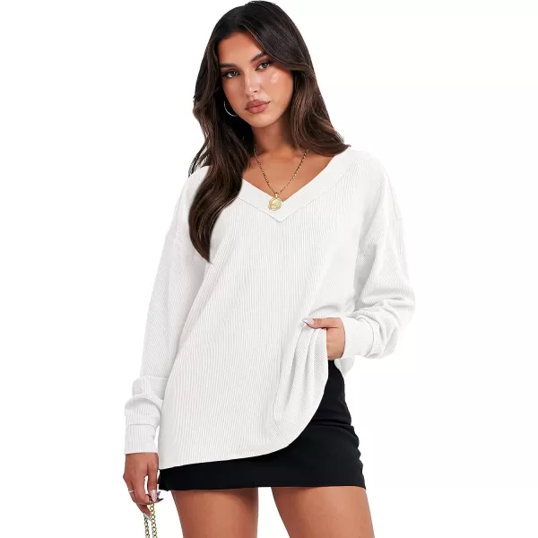 ANRABESS Women Long Sleeve V Neck Off Shoulder Oversized Knit Pullover Sweatshirt Loose Fit High Low Tunic Tops(White)
