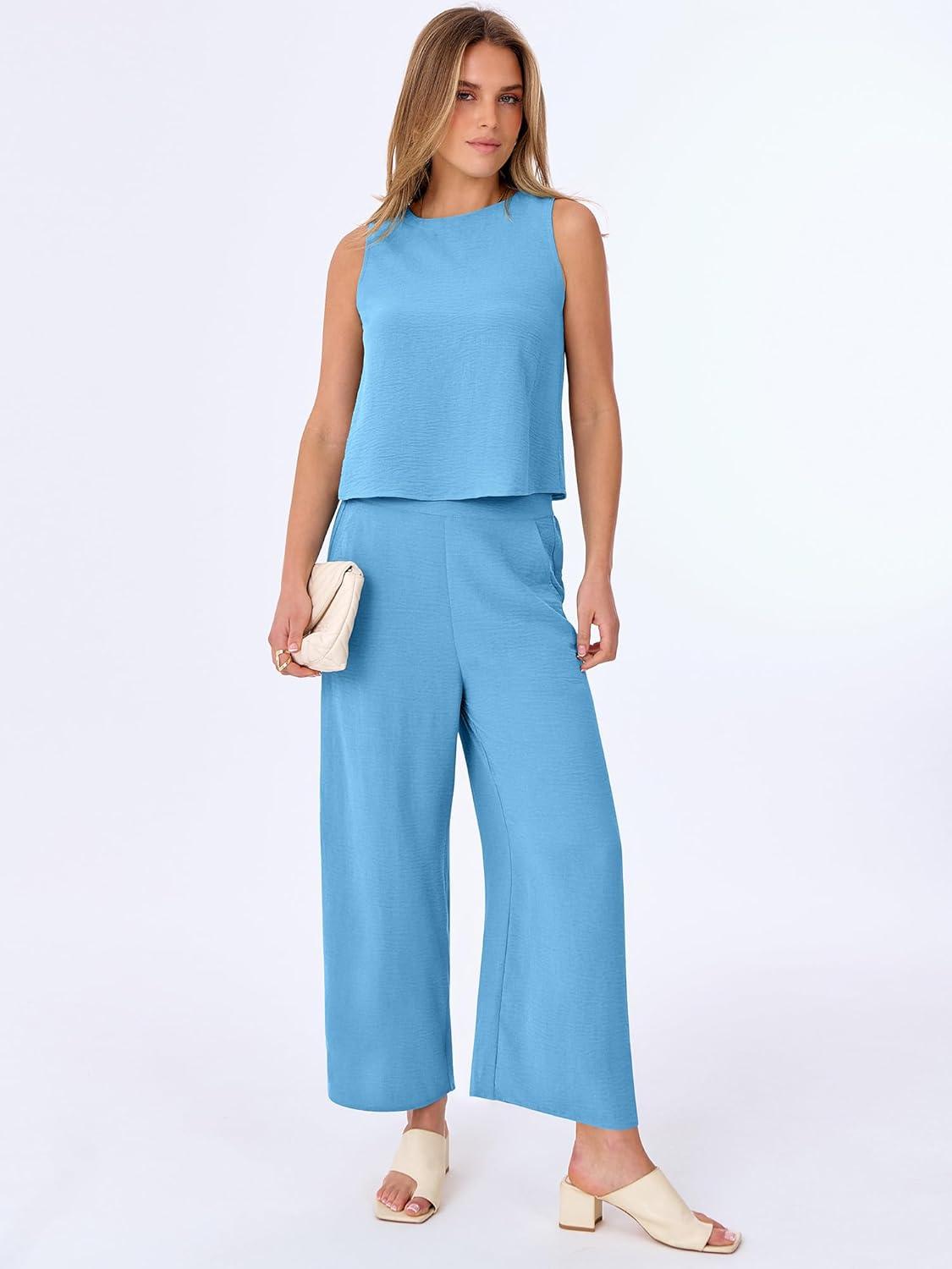 ANRABESS Women Lounge Sets 2 Piece Outfits Summer Sleeveless Crop Tops Capri Wide Leg Pants Vacation Beach Travel Sets(Bright Blue)