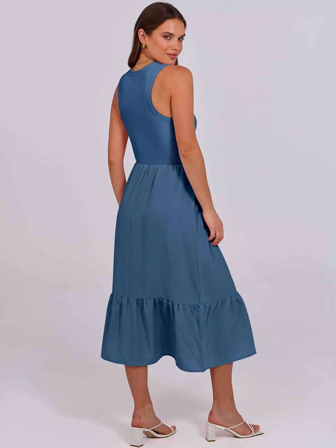 ANRABESS Women Midi Dresses 2025 Summer Casual Sleeveless Sundress High Neck Tank Top Racerback Flowy Beach Dress & Pockets(Blue)