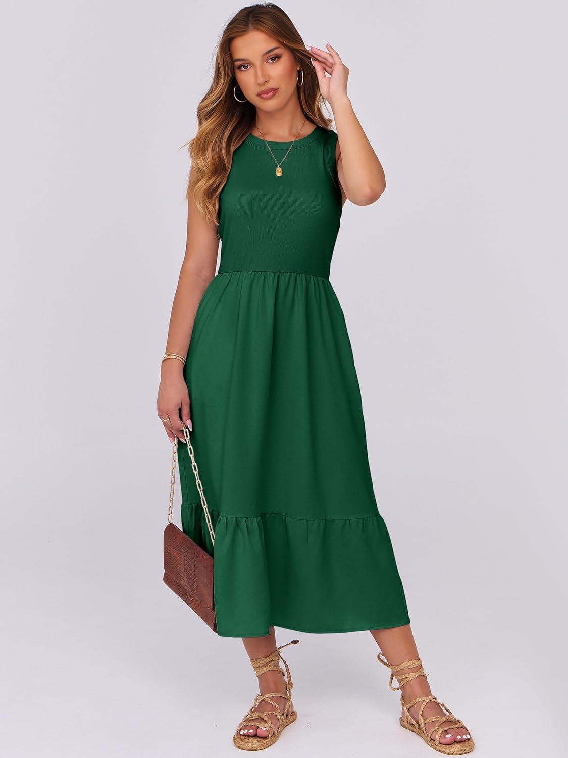 ANRABESS Women Midi Dresses 2025 Summer Casual Sleeveless Sundress High Neck Tank Top Racerback Flowy Beach Dress & Pockets(Dark Green)