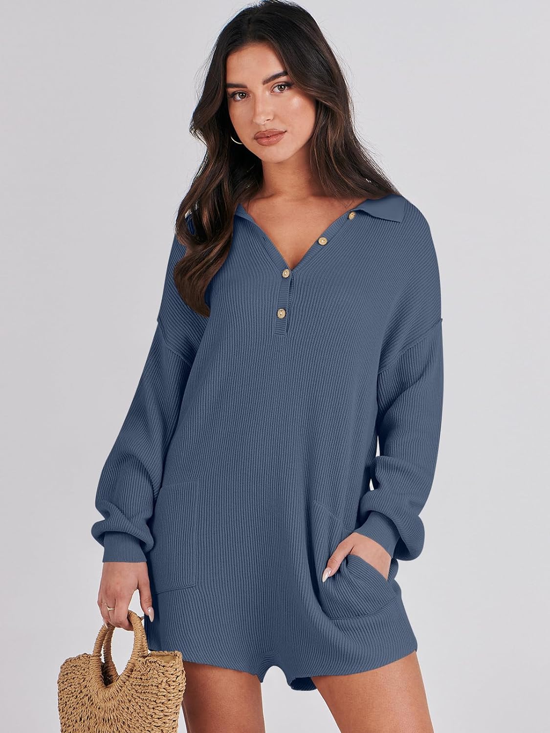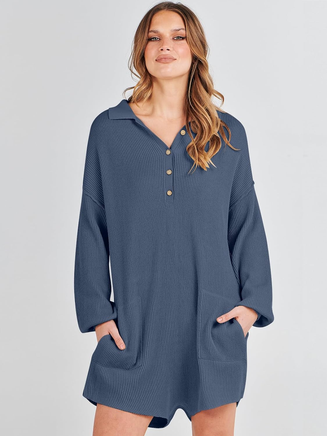 imageANRABESS Women One Piece Pajamas Sweater Rompers 2024 Spring Around House Lounging Outfits Long SLeeve Knit JumpsuitsDusty Blue