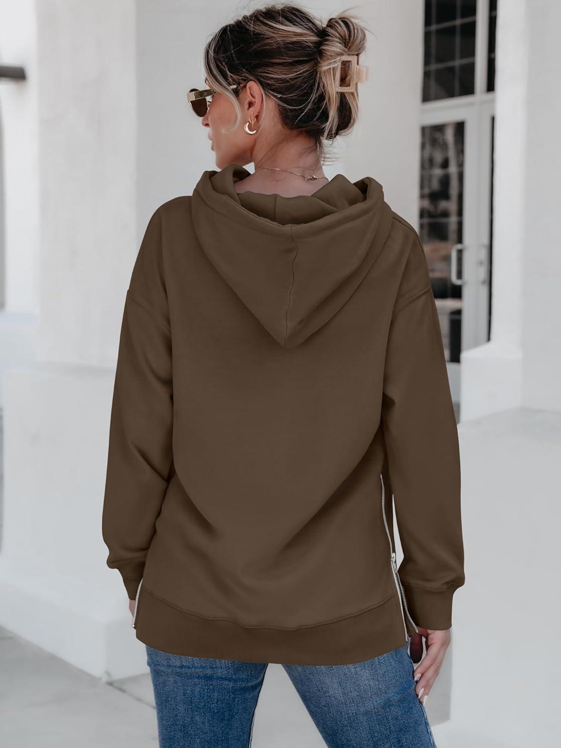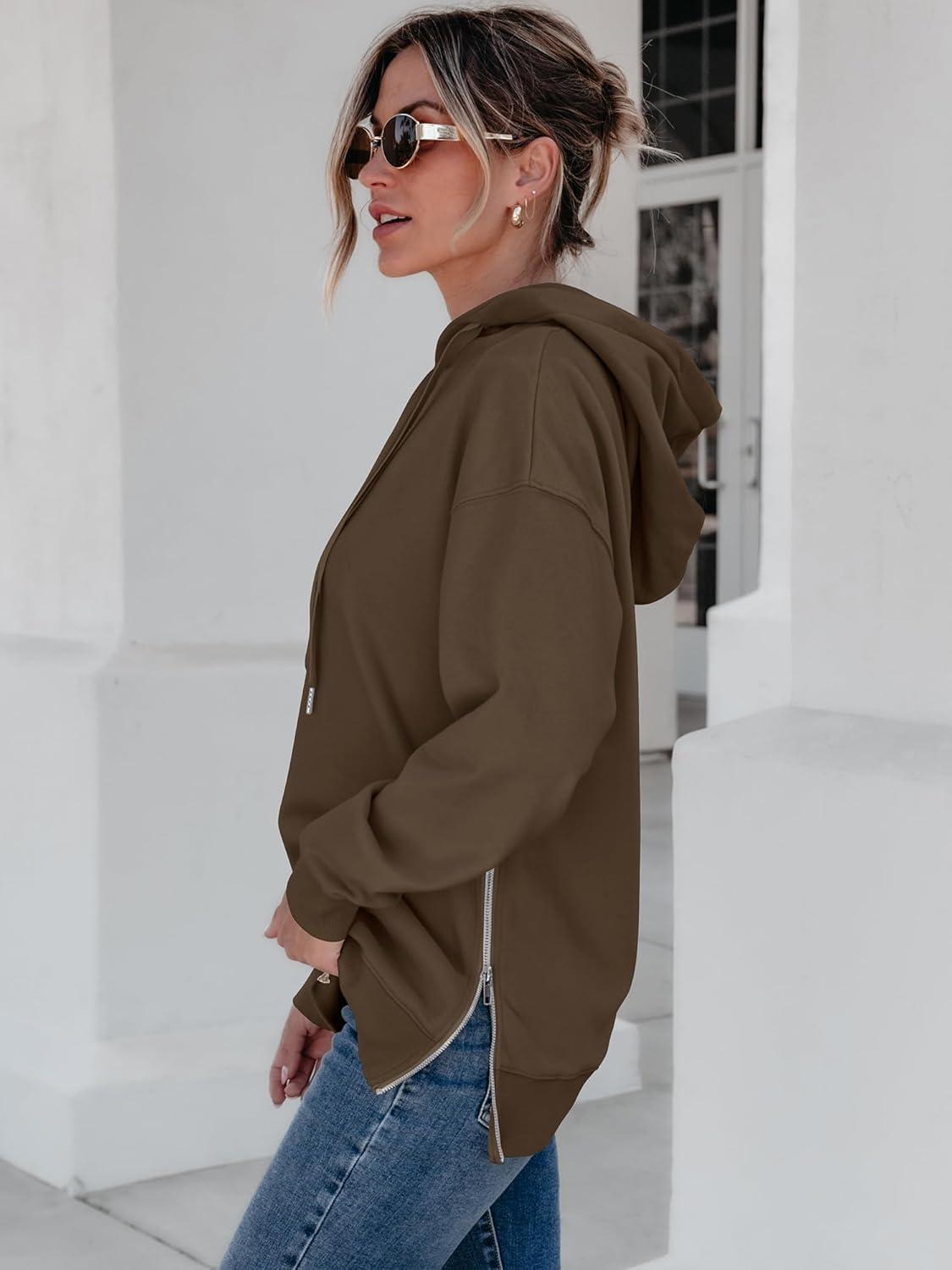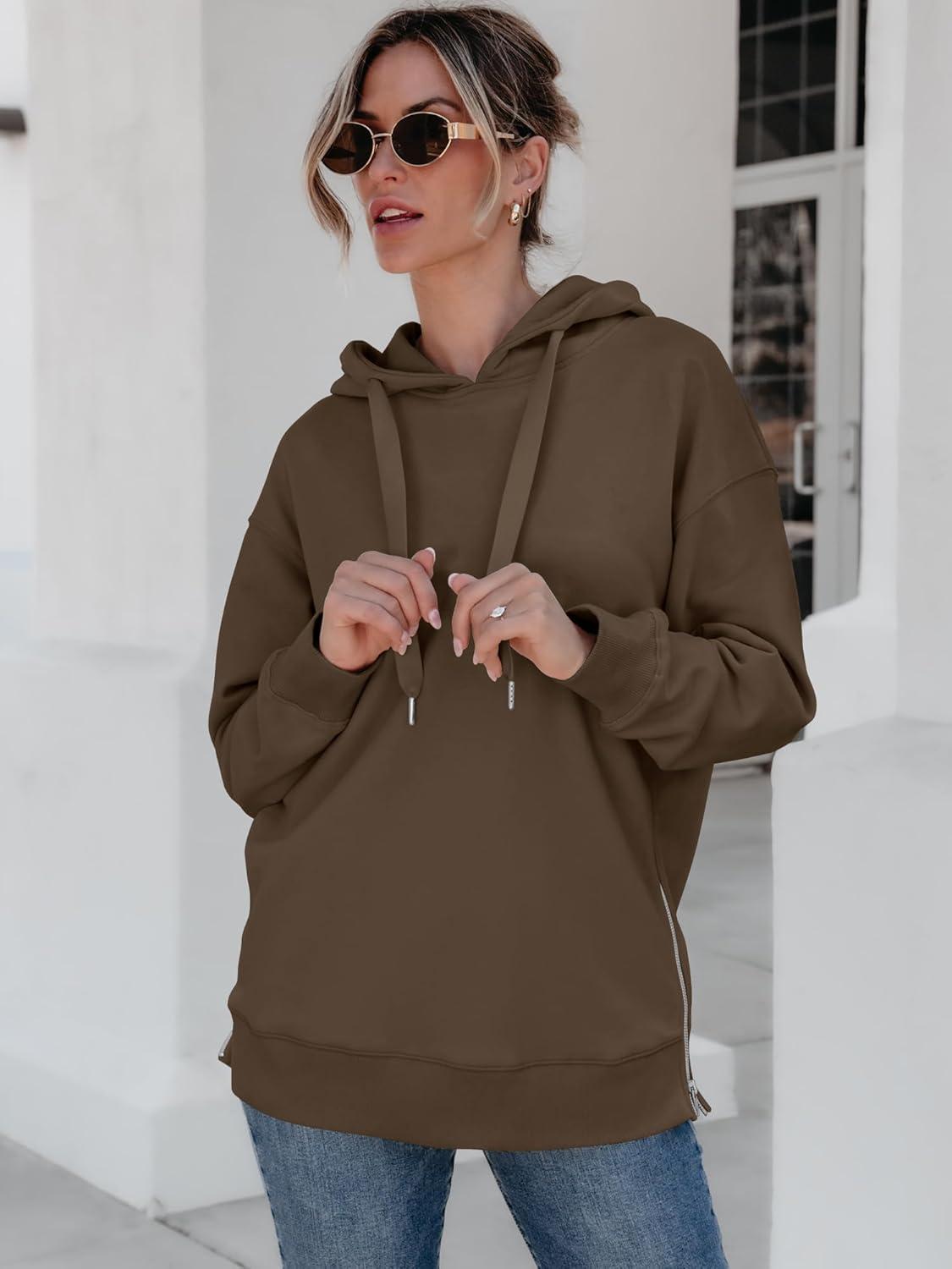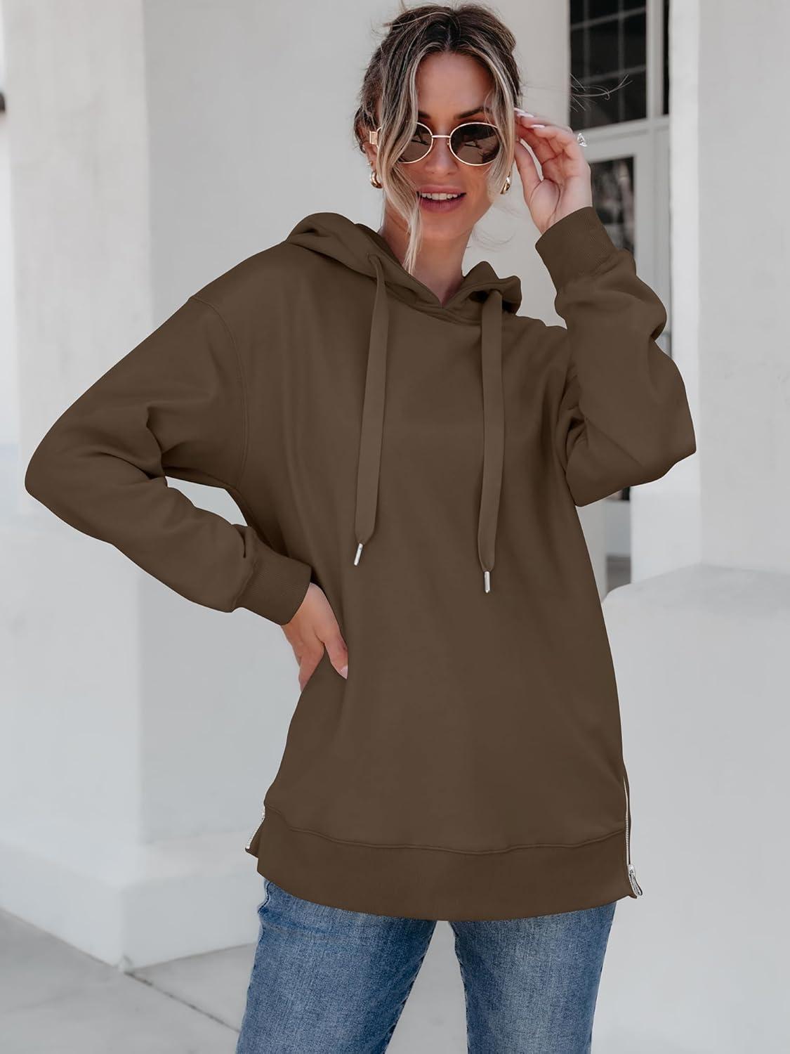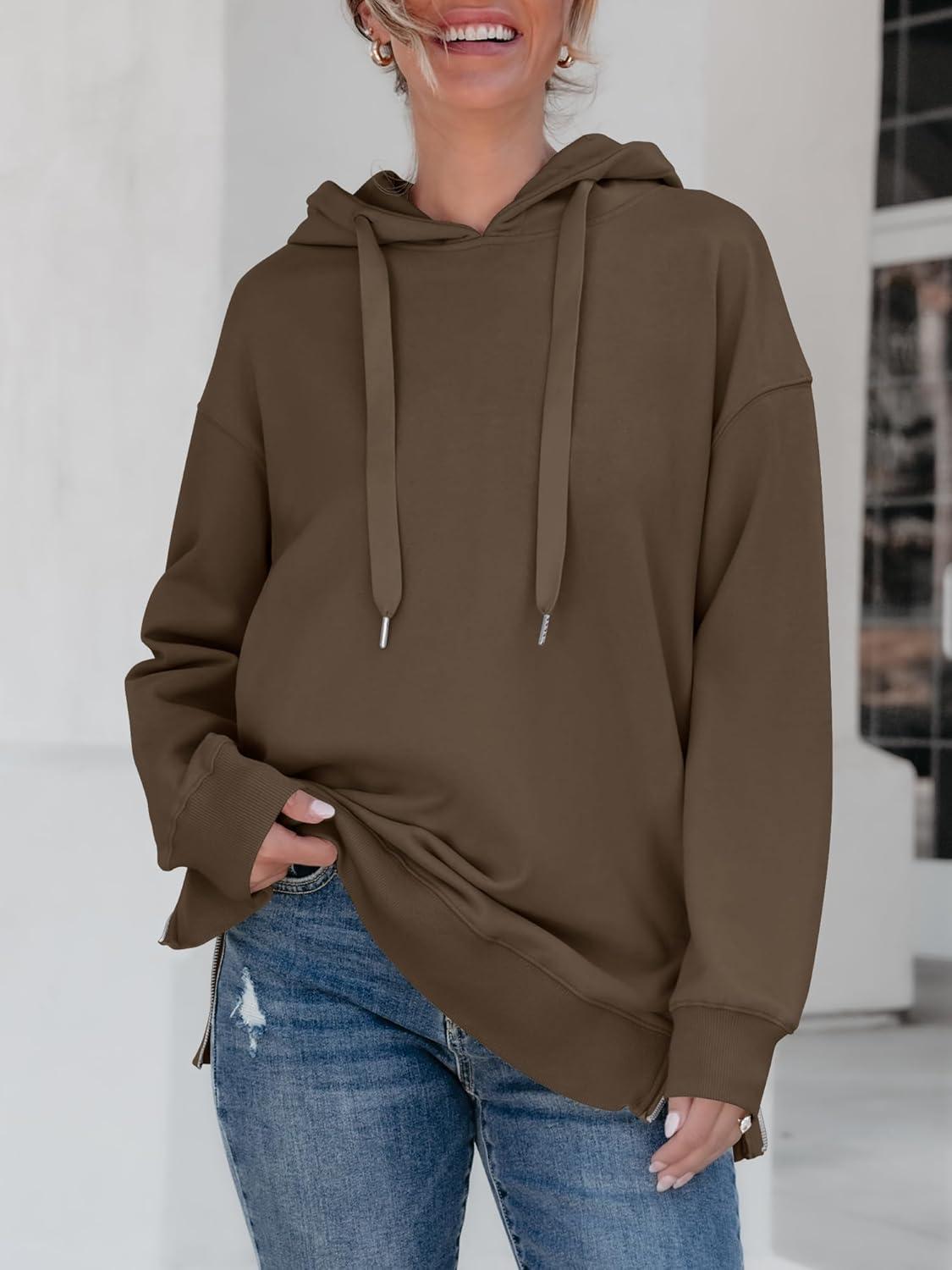 ANRABESS Women Oversized Hoodies Side Zipper Fleece Long Sweatshirts Lightweight Tunic Pullover 2025 Fall Trendy Clothes(Brown)