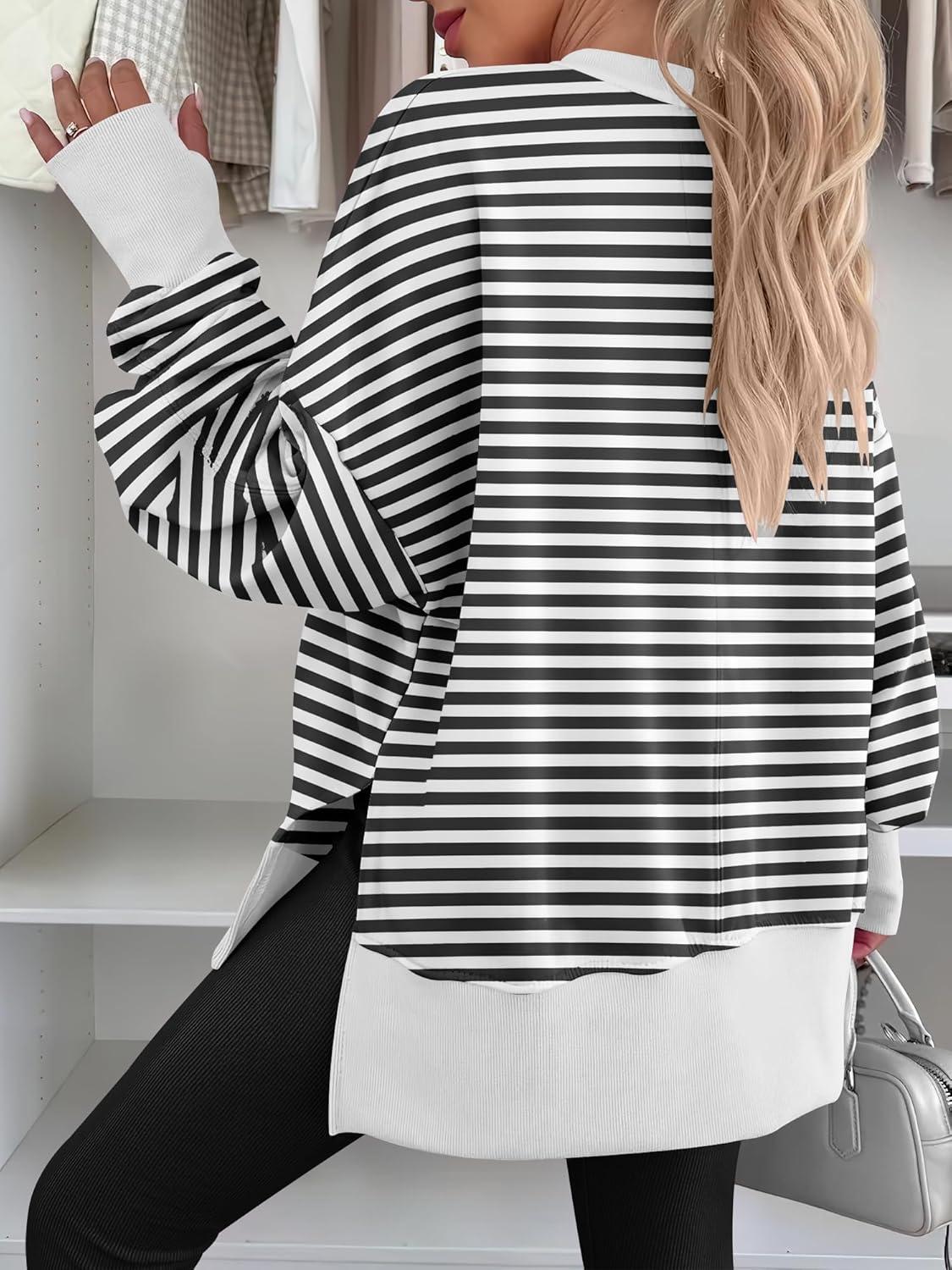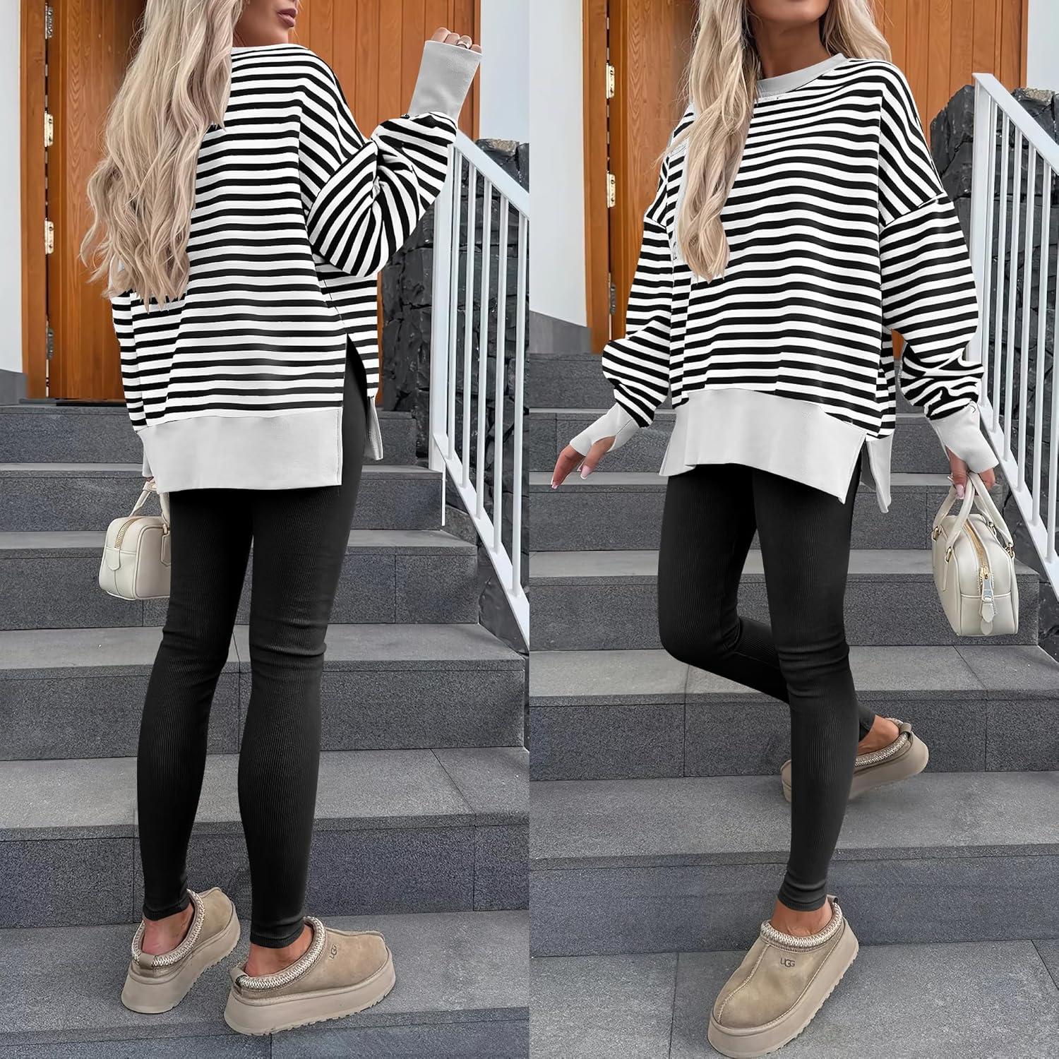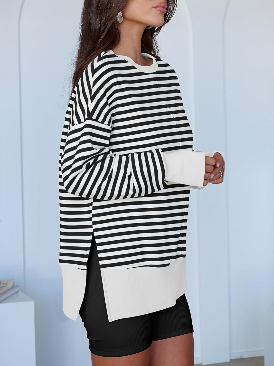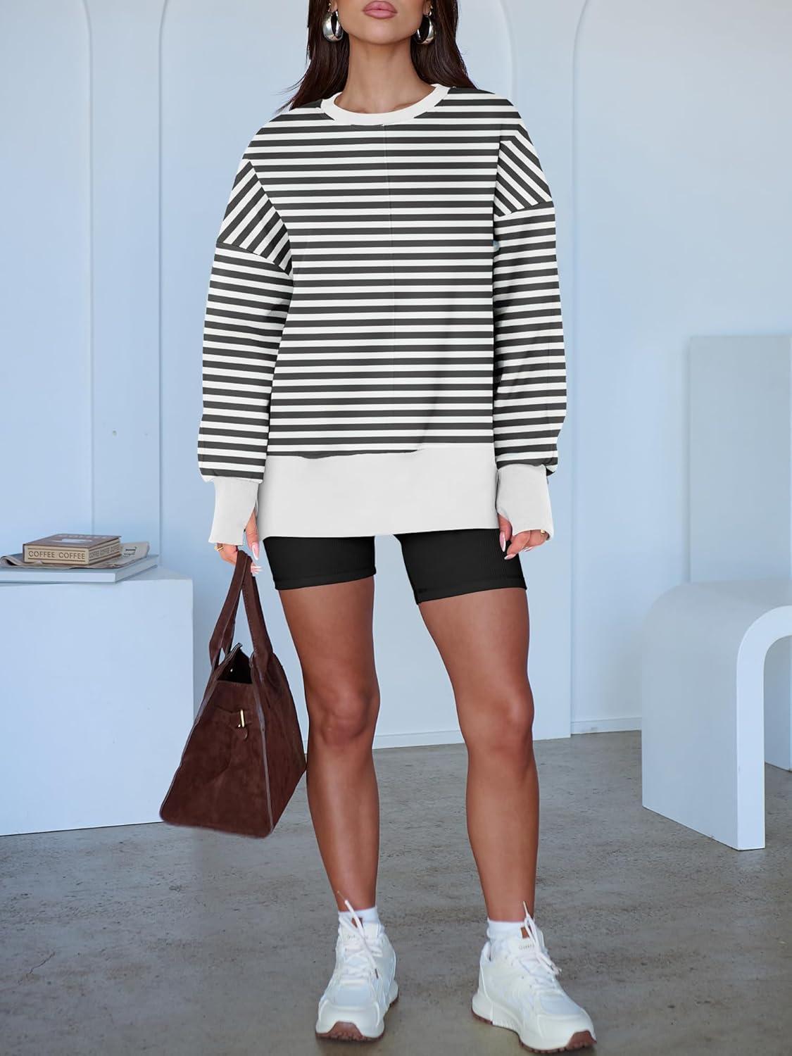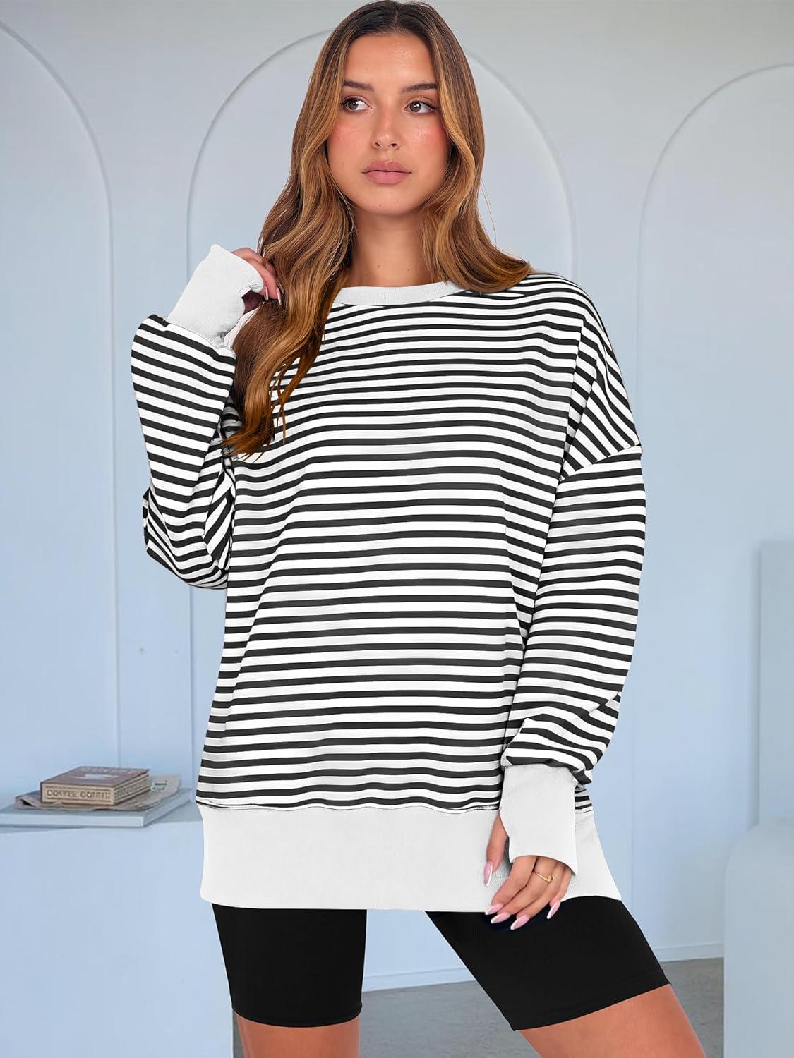ANRABESS Women Oversized Sweatshirts Thumbhole Long Sleeve Hoodies Shirts 2025 Fall Side Slit Pullover Top Teen Y2k Outfits(Black White Striped)