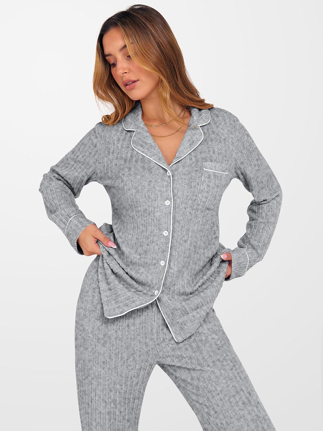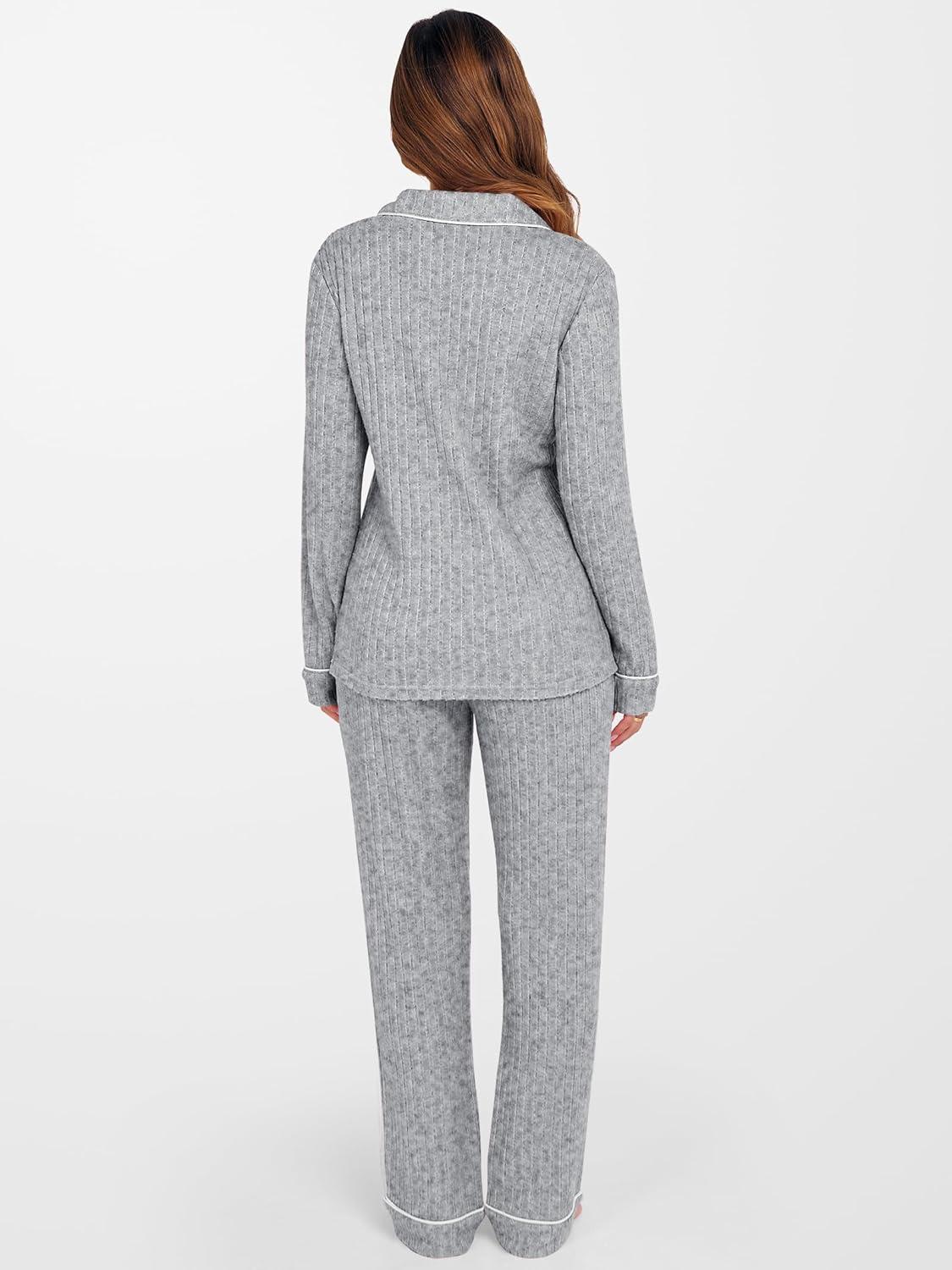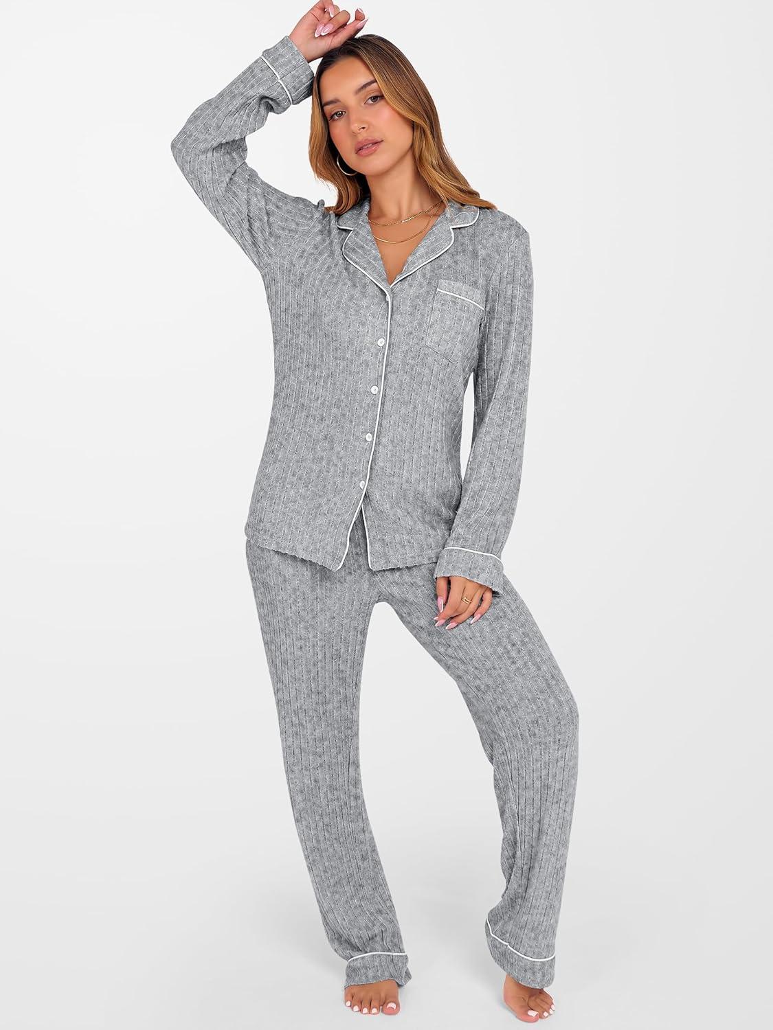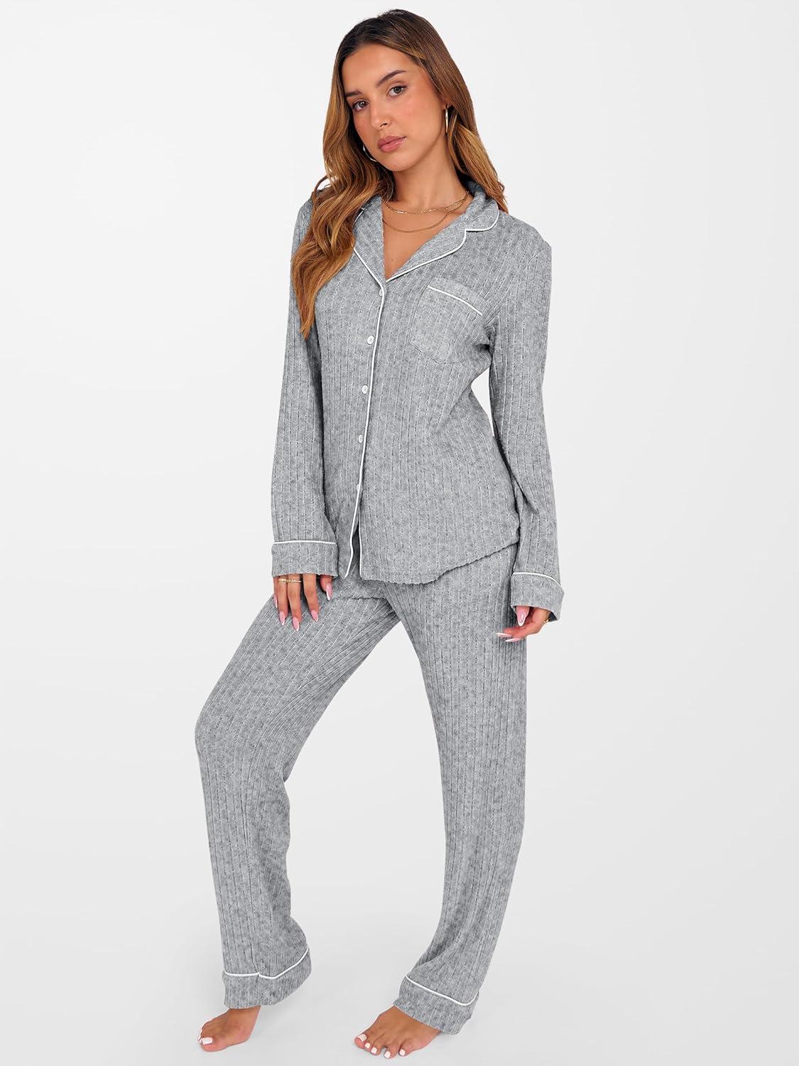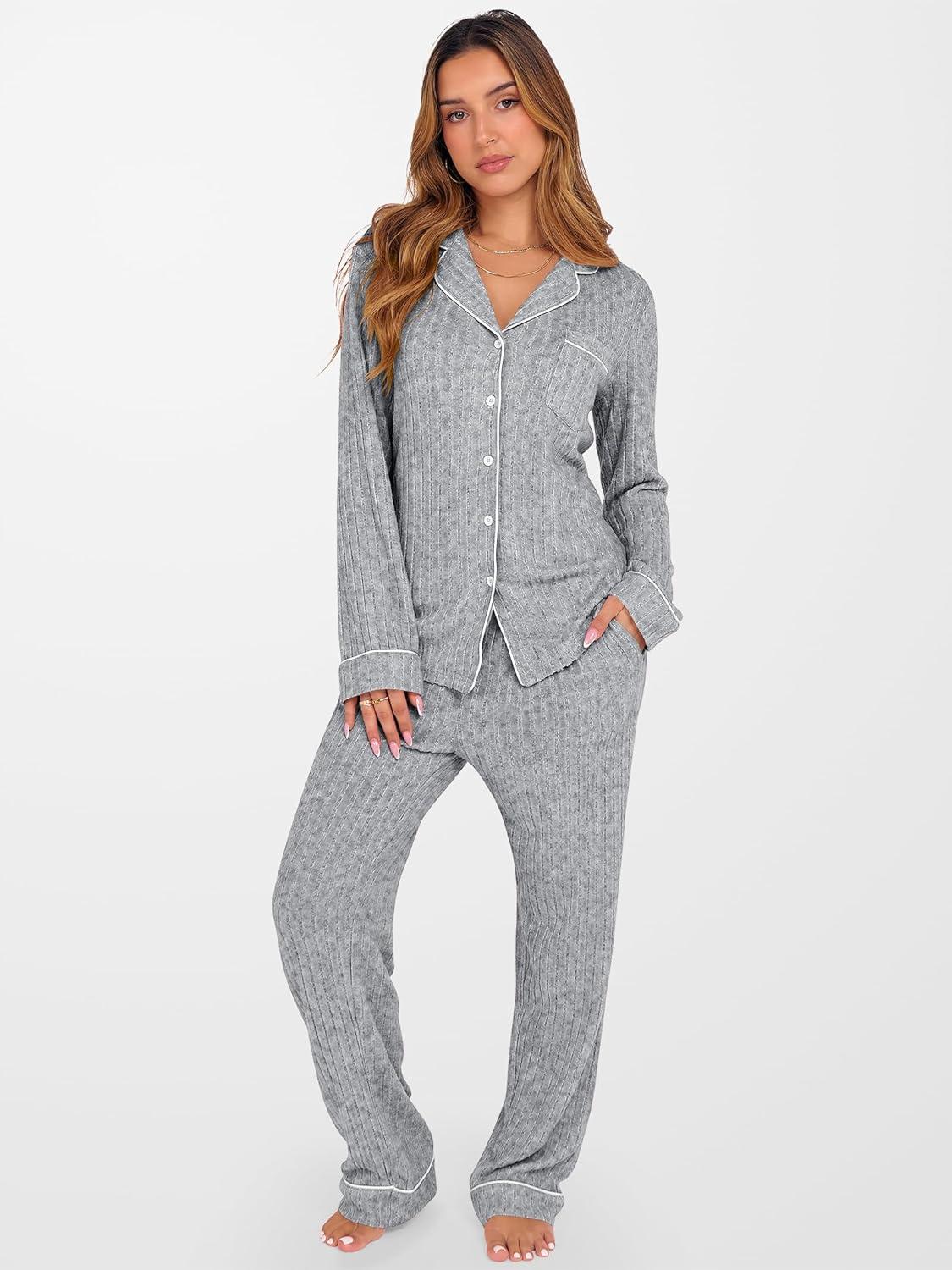 ANRABESS Women Pajama Lounge Sets 2025 Fall 2 Piece Outfits Ribbed Long Sleeve Matching PJ Set Sleepwear Loungewear(Grey)