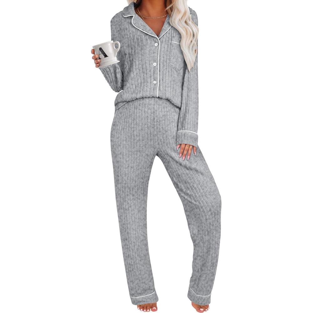 ANRABESS Womens Pajama Sets Long Sleeve Ribbed Knit Top Pant Matching Set 2025 Winter Button Down Sleepwear Lounge Nightwear
