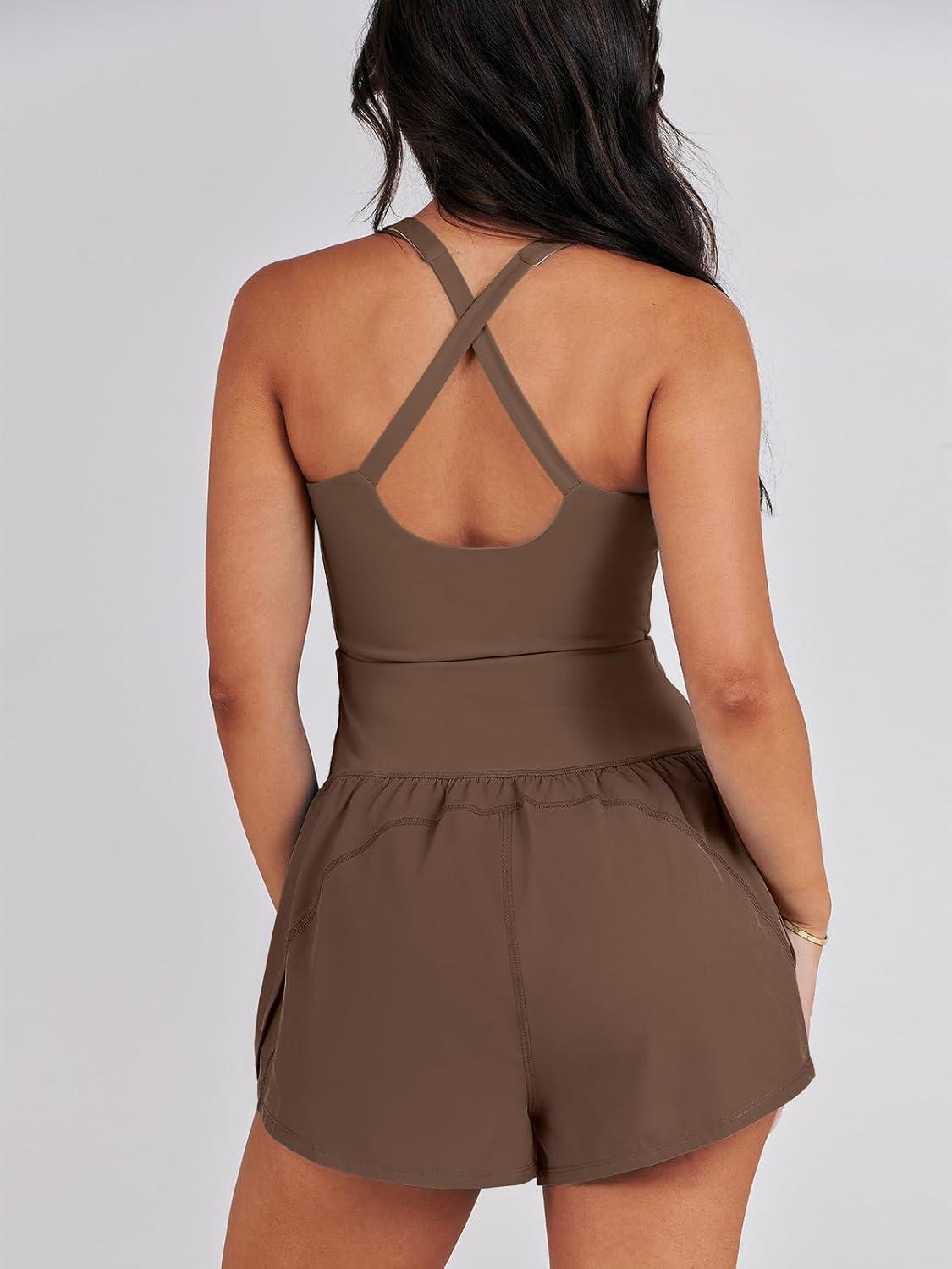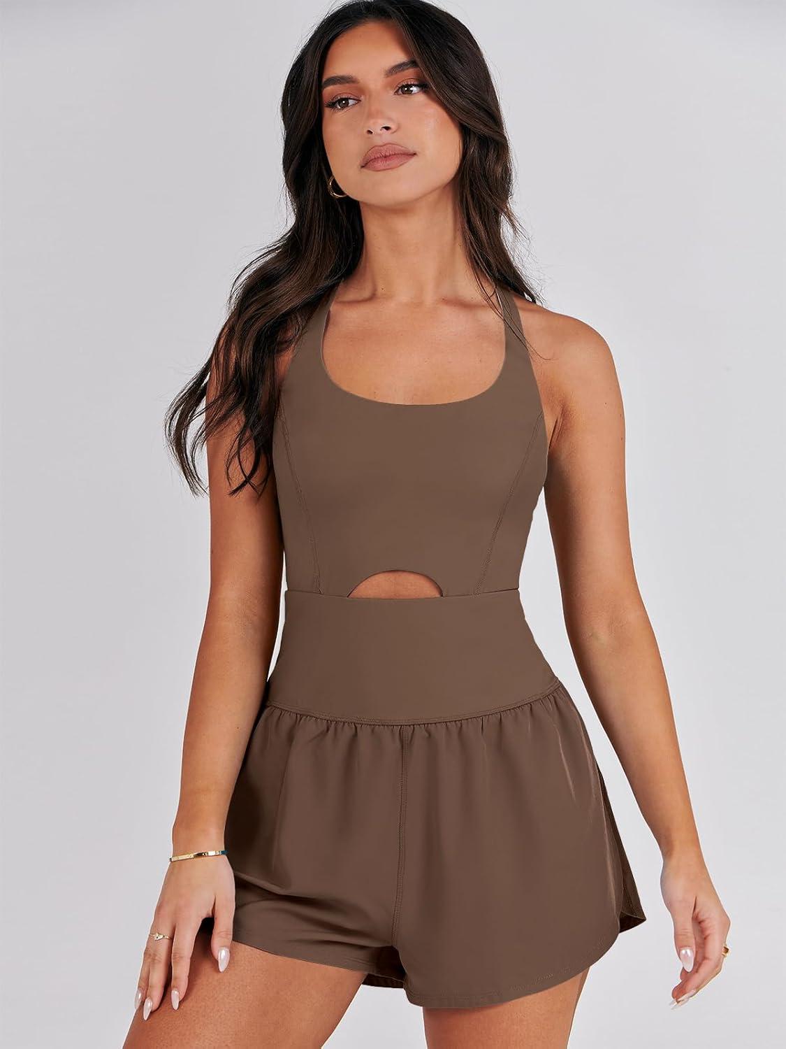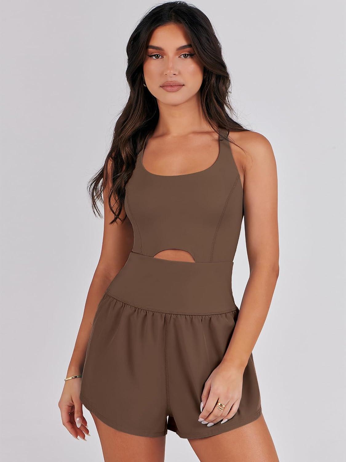 ANRABESS Women Rompers Running Exercise Workout Set One Piece Jumpsuits Gym Yoga Outfits 2025 Summer Active Wear Clothes(Coffee)