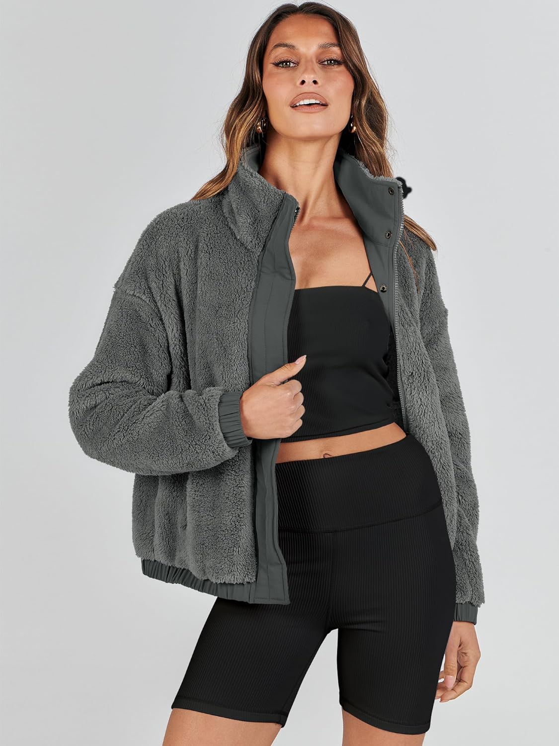 ANRABESS Women Sherpa Fleece Jackets Casual Long Sleeve Buttons Cropped Coat Winter Outwear(Dark Grey)