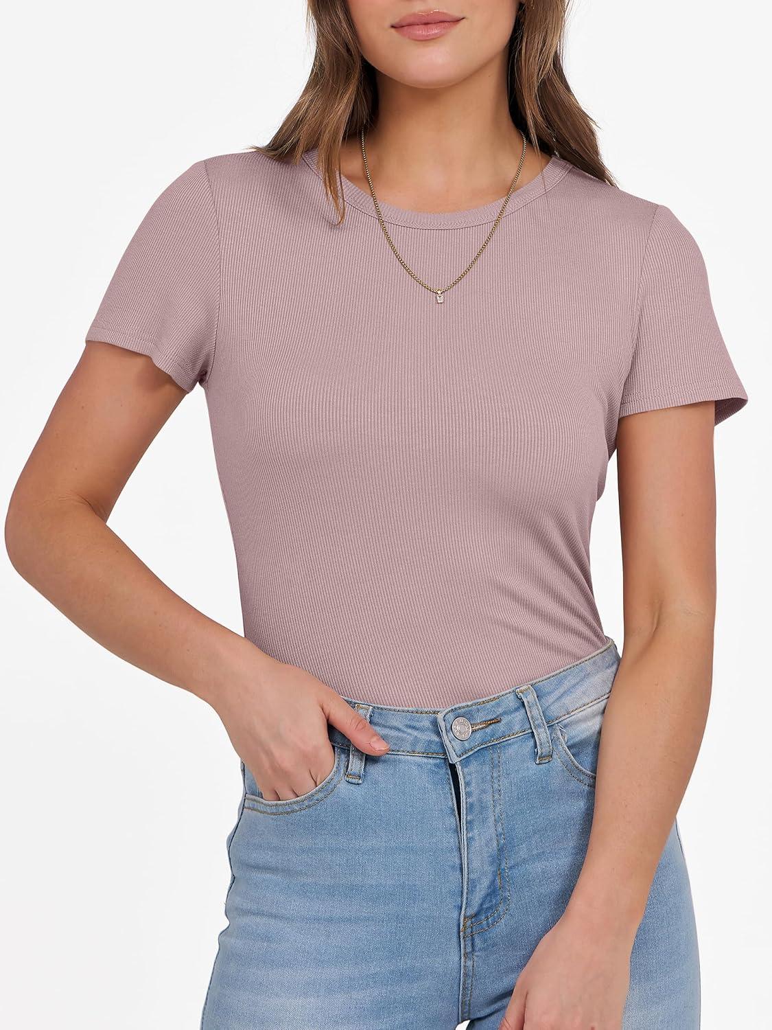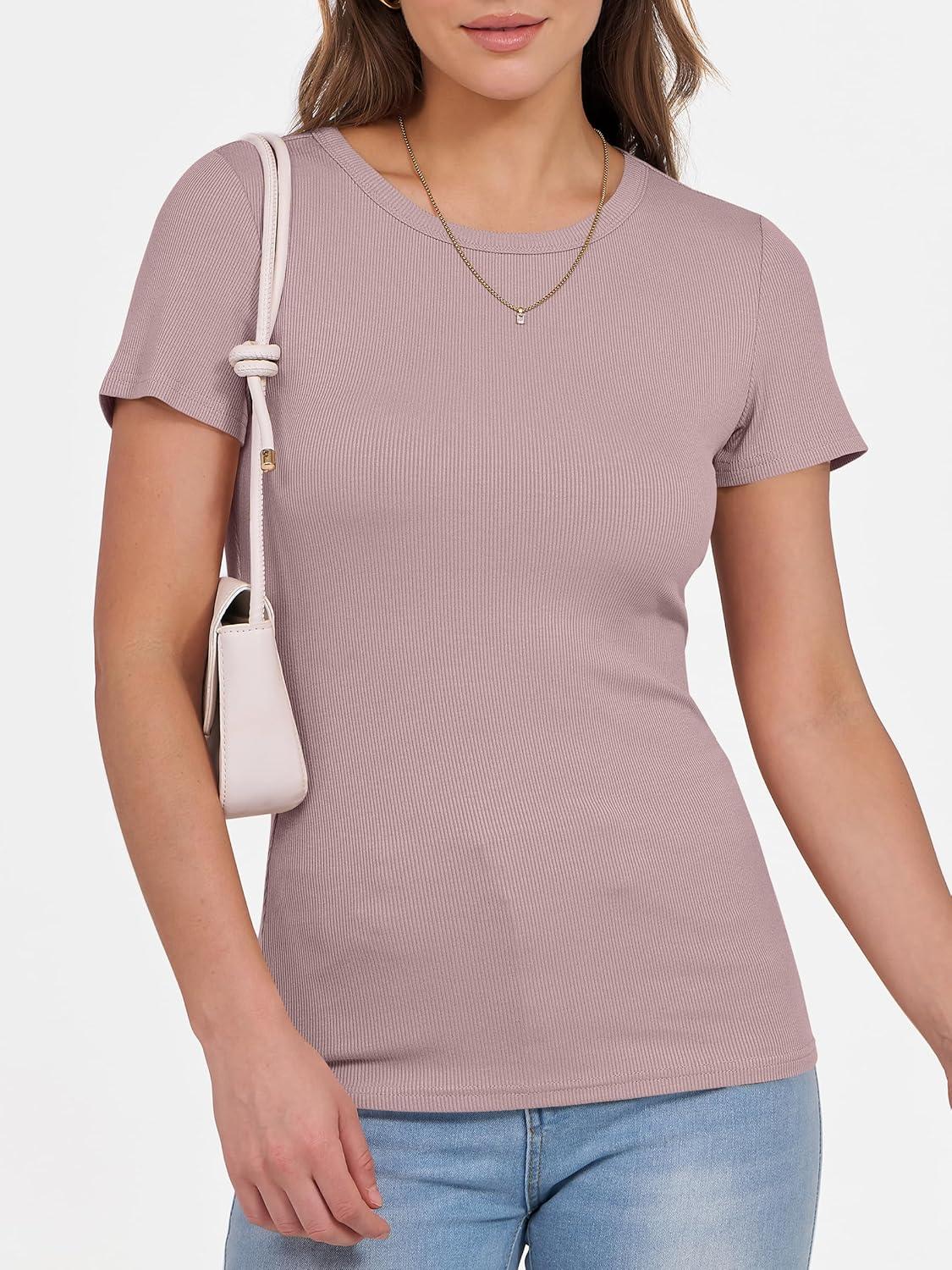 ANRABESS Women Short Sleeve Crewneck Ribbed Knit Slim Fitted Shirts Summer Tops Basic Tee Casual 2025 Fall Outfits Clothes(Nutmeg)