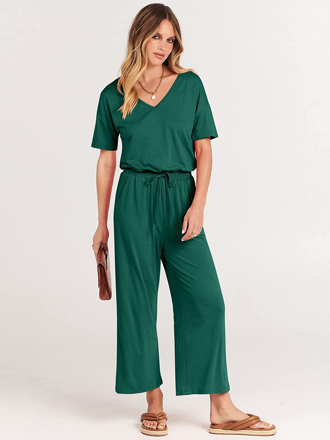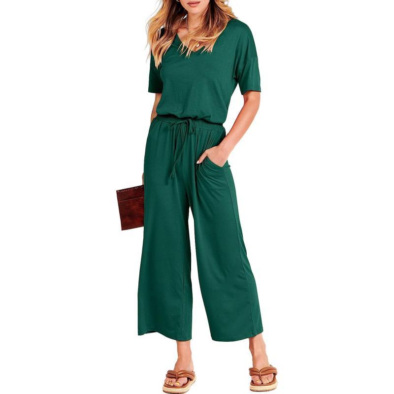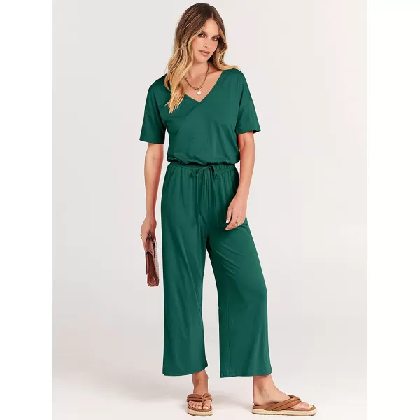 imageANRABESS Women Short Sleeve Summer Casual V Neck Elastic Waist Wide Leg Cropped Pant Jumpsuits Rompers with Pockets03deep Green