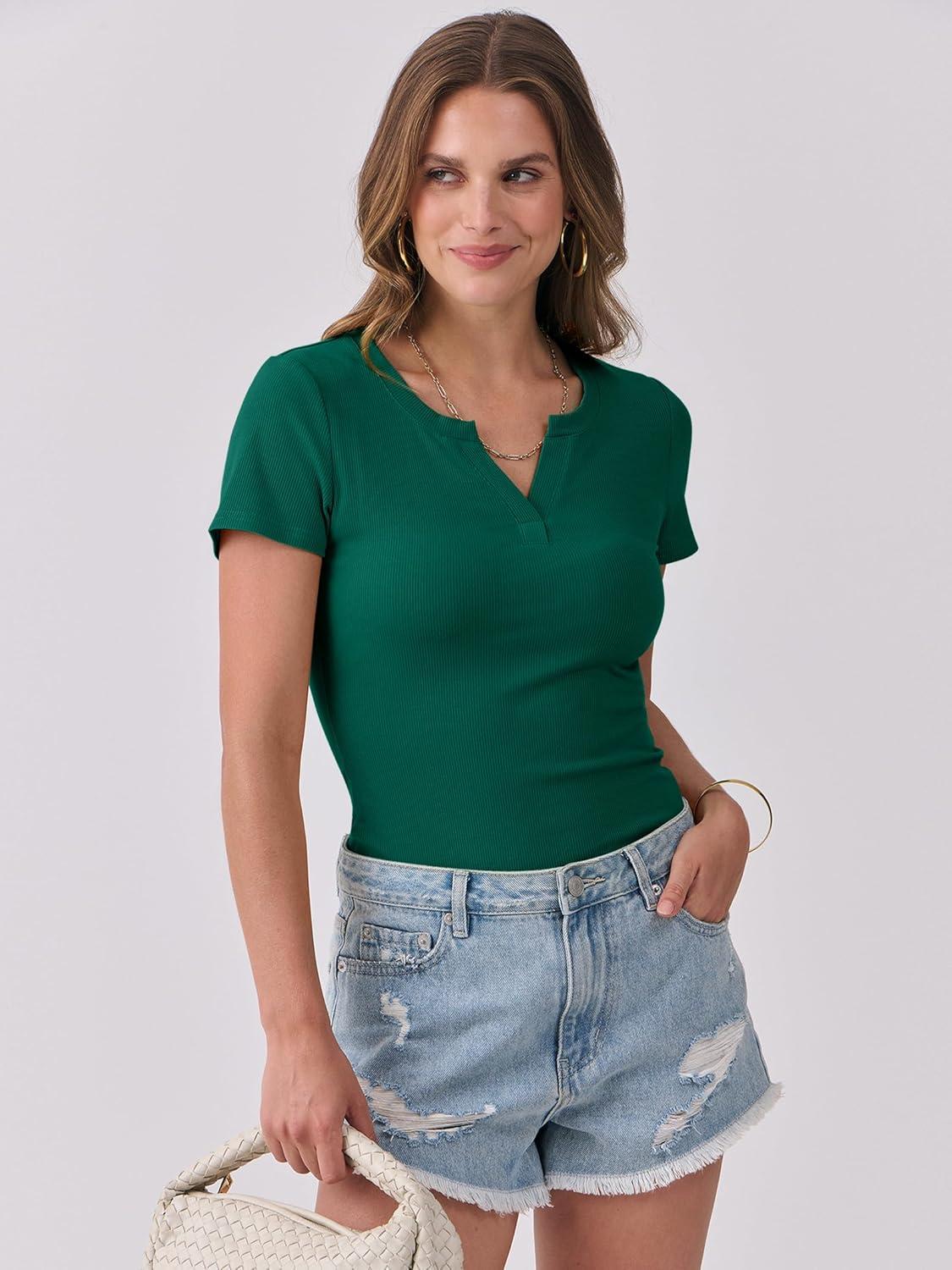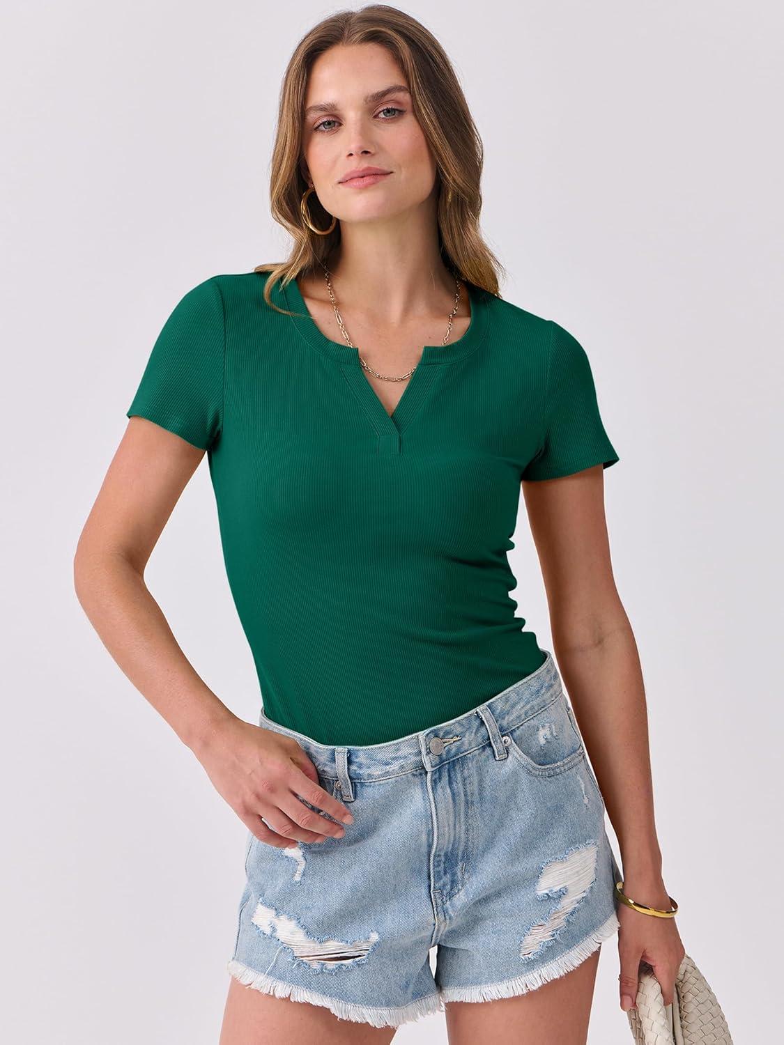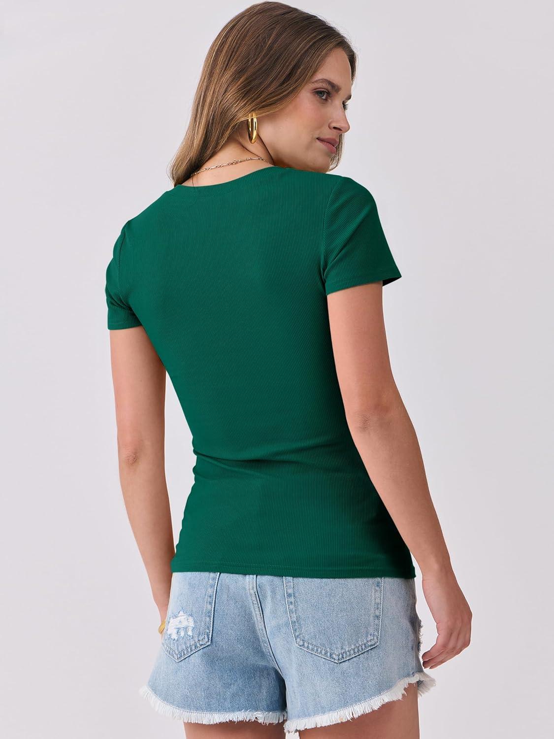 ANRABESS Women Short Sleeve Tops V Neck Rib Knit Slim Fit Shirts Basic Tee 2025 Summer Casual T-Shirt Outfits Clothes(Deep Green)