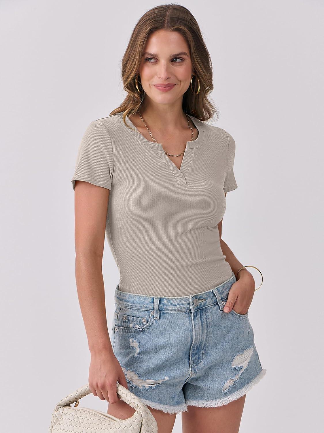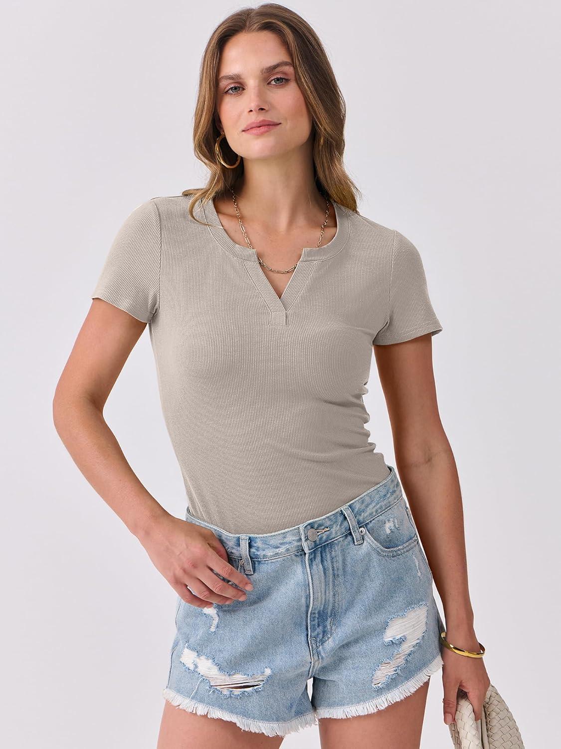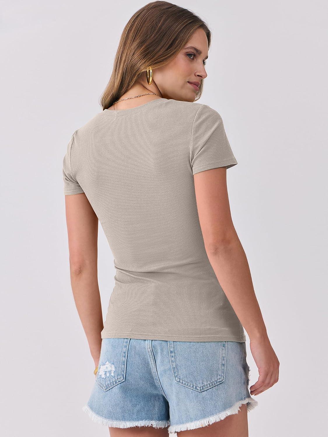 ANRABESS Women Short Sleeve Tops V Neck Rib Knit Slim Fit Shirts Basic Tee 2025 Summer Casual T-Shirt Outfits Clothes(Grey Khaki)
