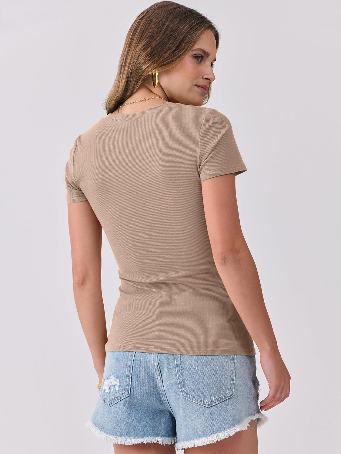 ANRABESS Women Short Sleeve Tops V Neck Rib Knit Slim Fit Shirts Basic Tee 2025 Summer Casual T-Shirt Outfits Clothes(Grey Khaki)