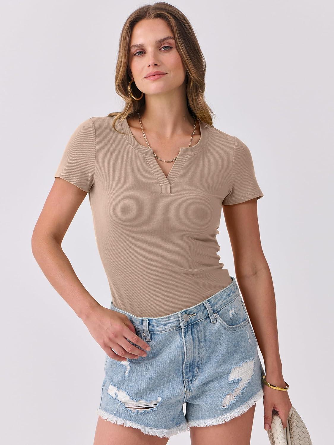 imageANRABESS Women Short Sleeve Tops V Neck Rib Knit Slim Fit Shirts Basic Tee 2025 Summer Casual TShirt Outfits ClothesGrey Khaki
