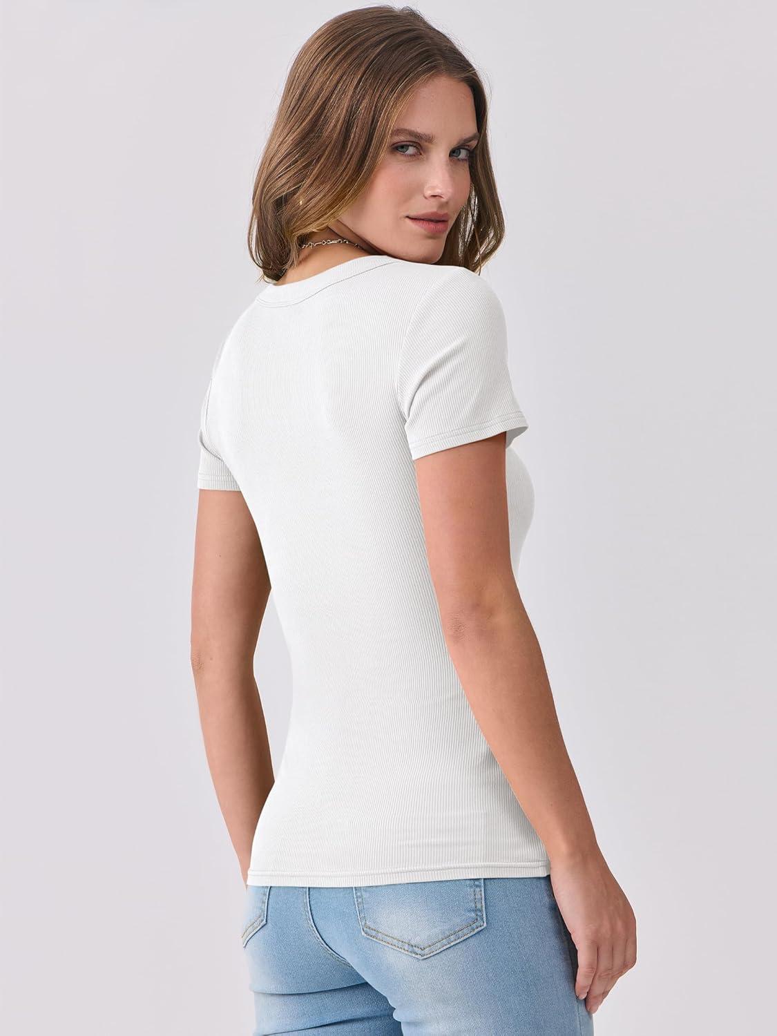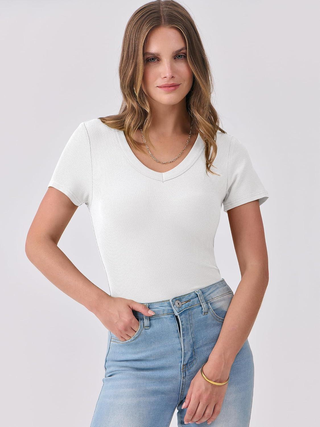 ANRABESS Women Short Sleeve V Neck Ribbed Knit Fitted Shirts Basic Tees Tops 2025 Summer Casual T-Shirts Going Out Outfits(White)