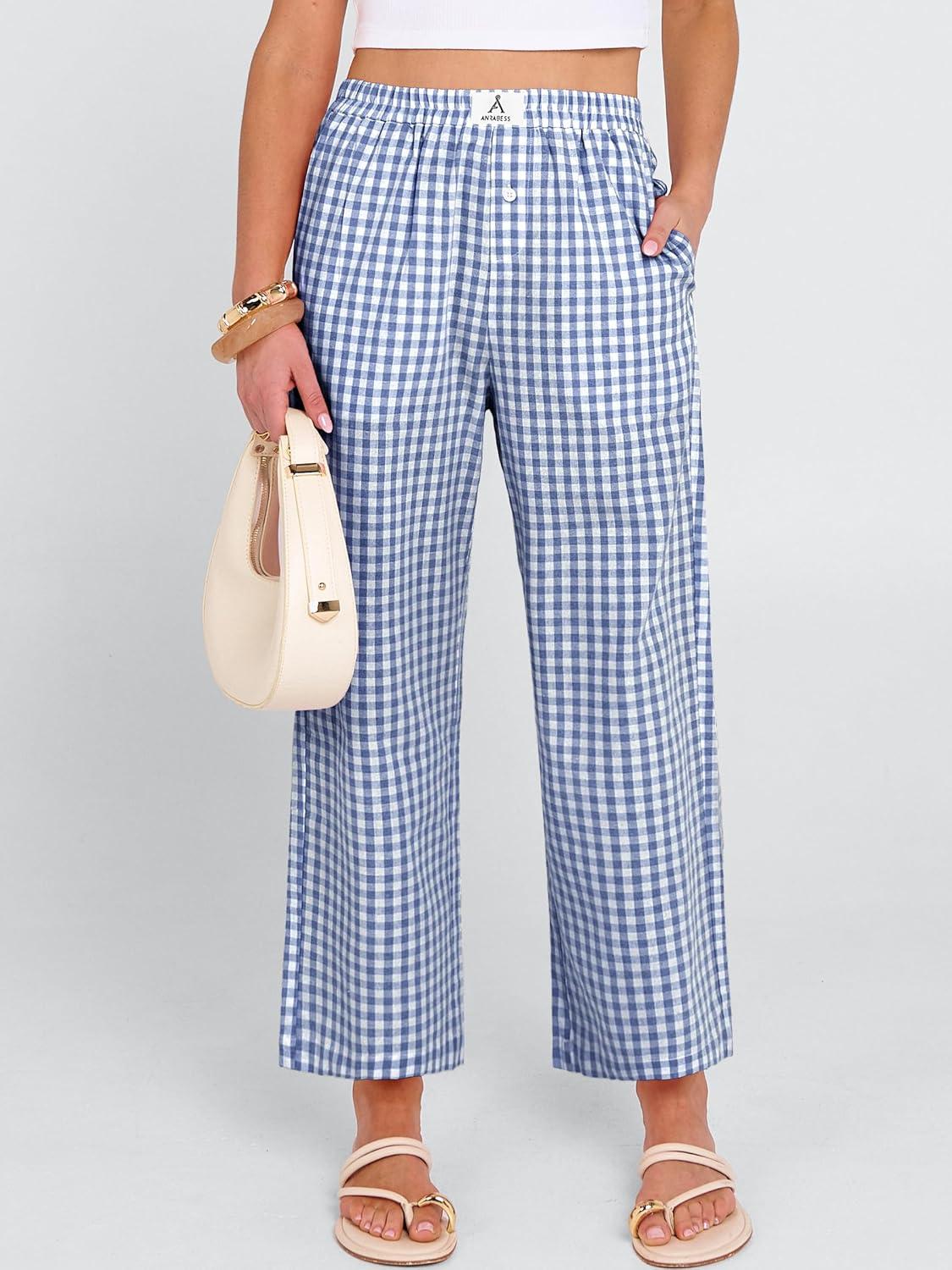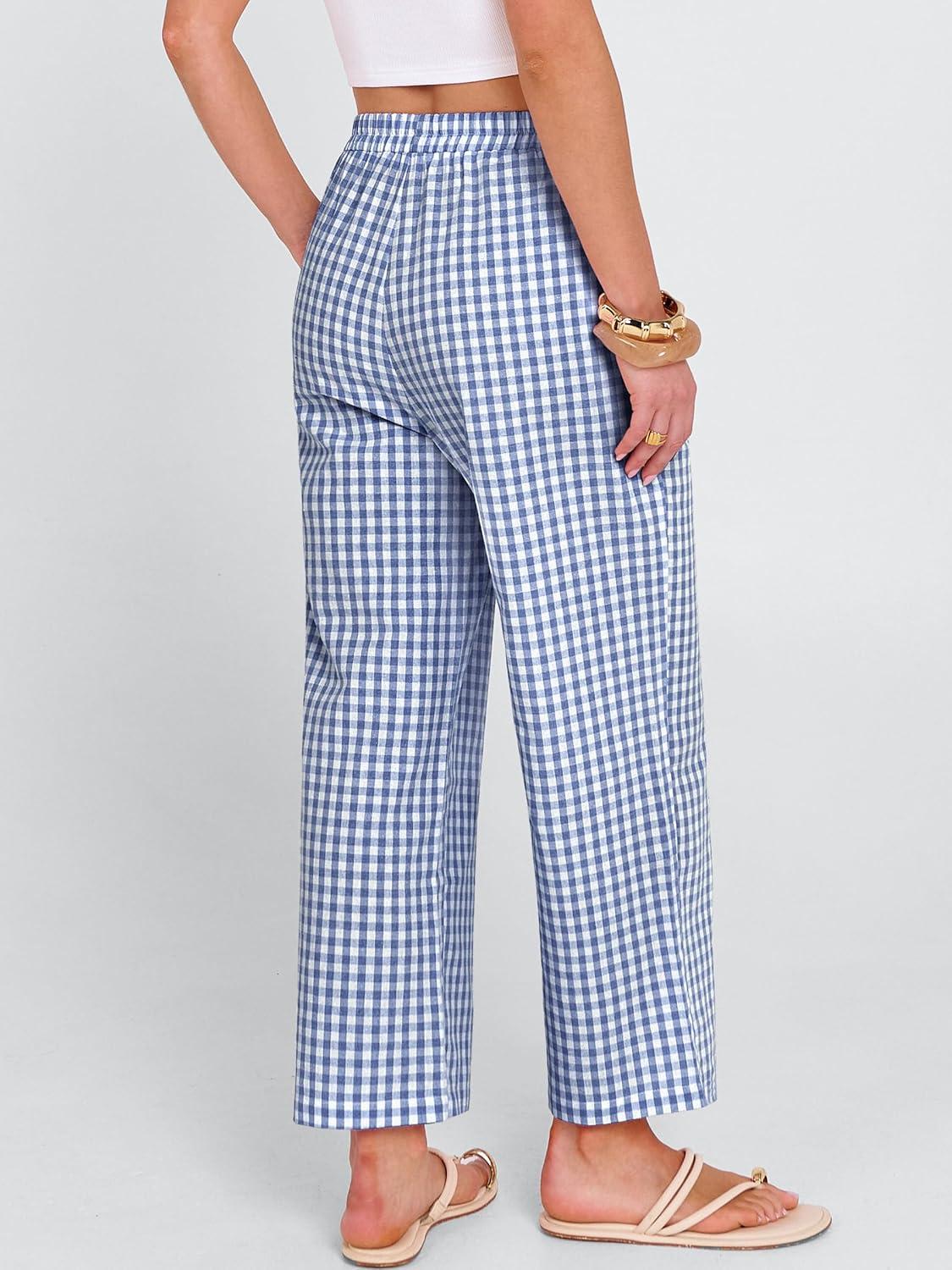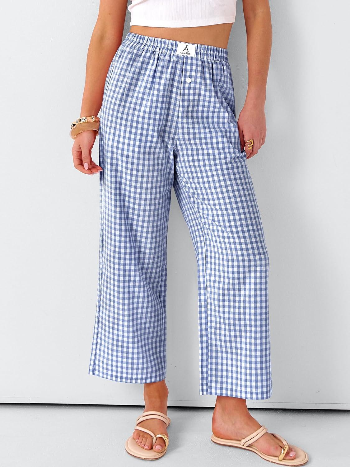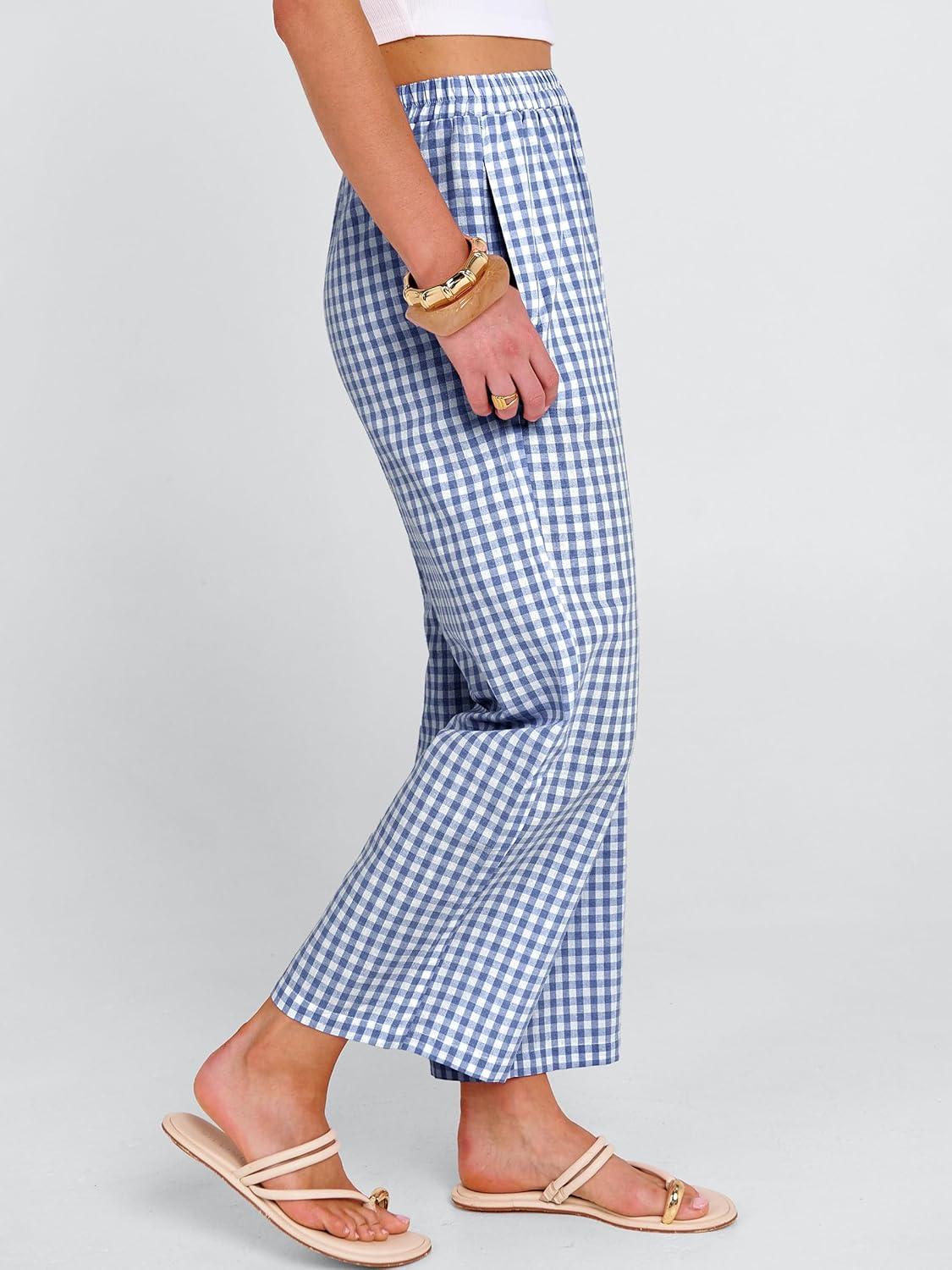 ANRABESS Women Striped Gingham Palazzo Cropped Pants Wide Leg Pajama Lounge Pant Plaid PJ Bottoms Cute Trousers with Pockets(Blue White Plaid)