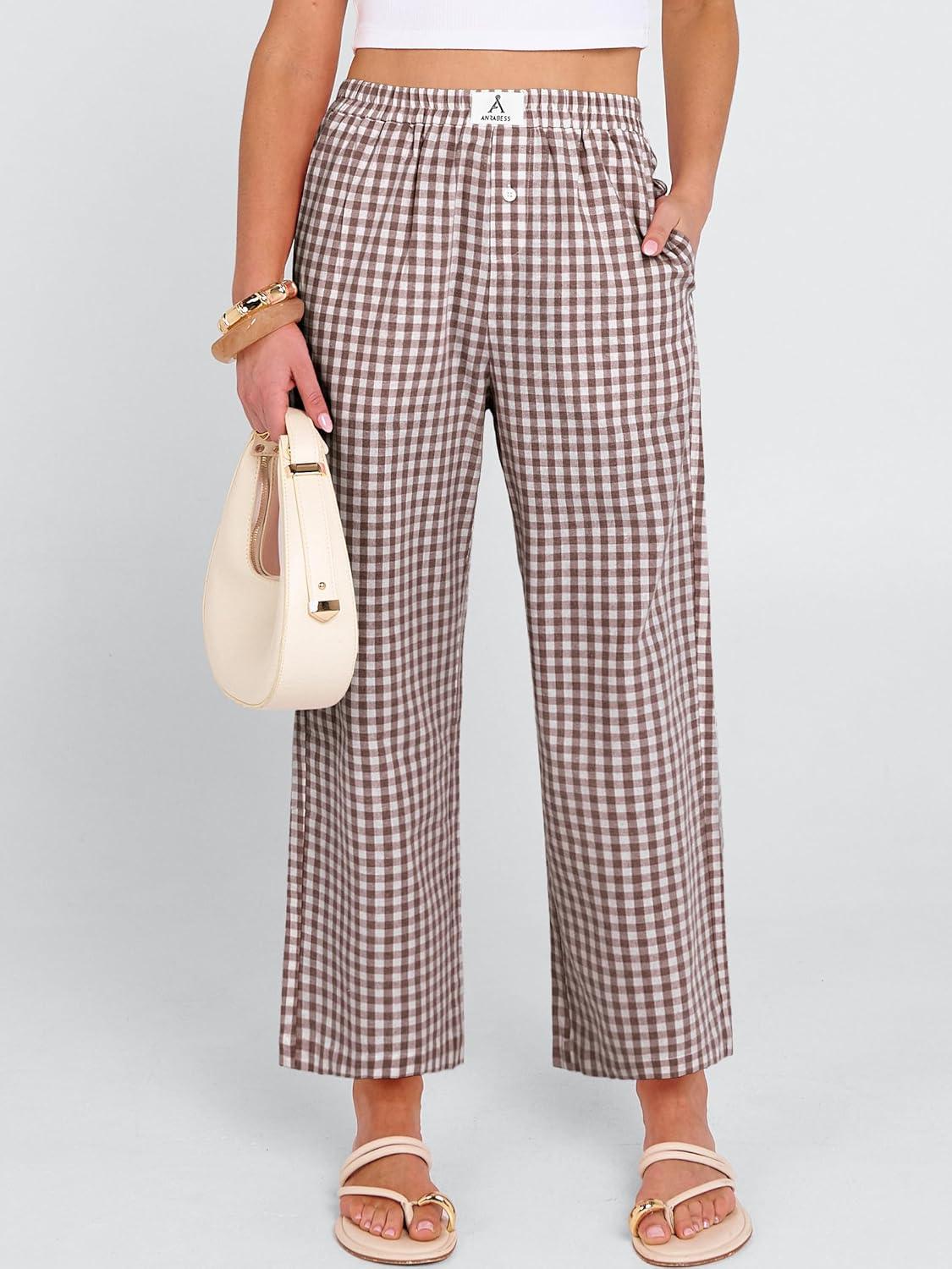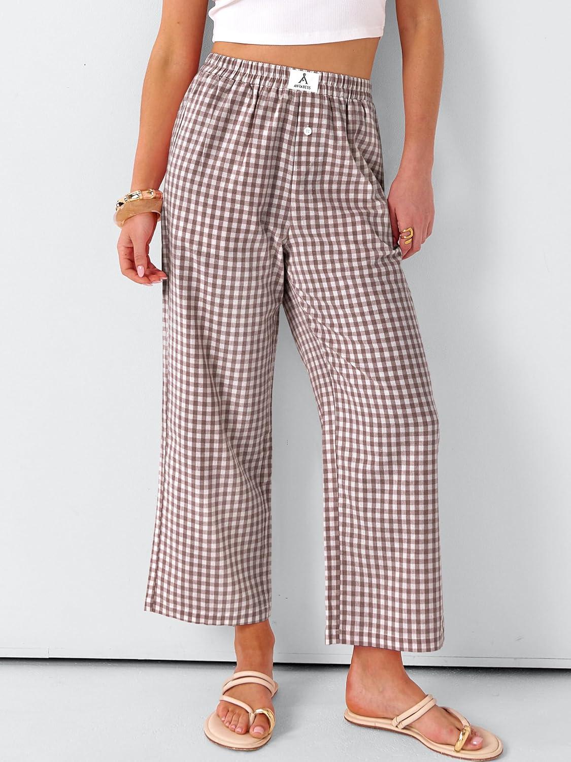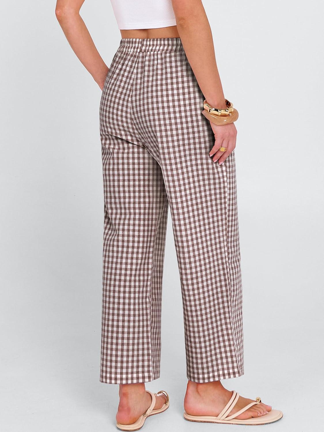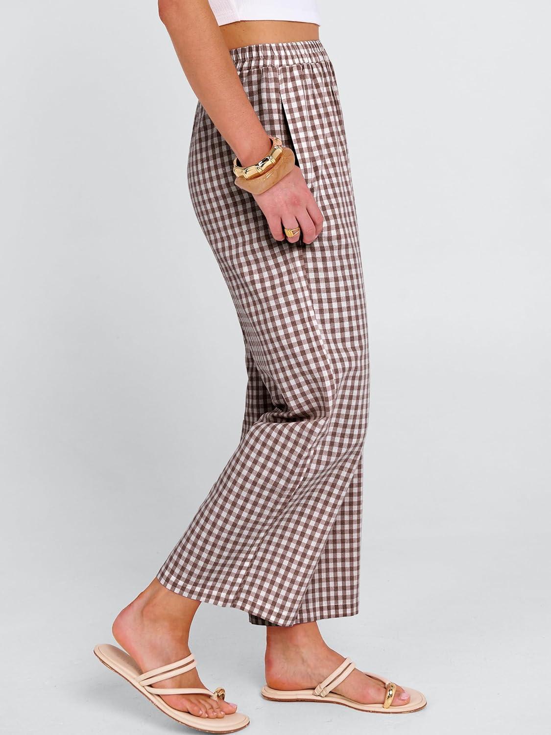 imageANRABESS Women Striped Gingham Palazzo Cropped Pants Wide Leg Pajama Lounge Pant Plaid PJ Bottoms Cute Trousers with PocketsBrown White Plaid
