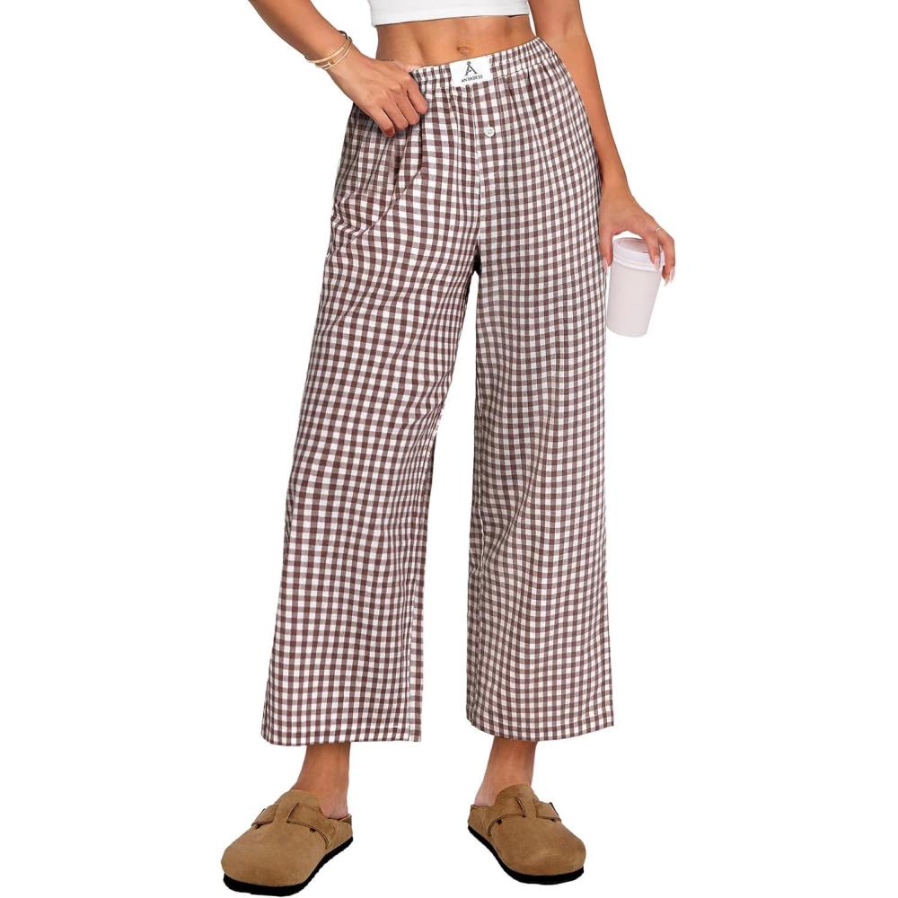 ANRABESS Women Striped Gingham Palazzo Cropped Pants Wide Leg Pajama Lounge Pant Plaid PJ Bottoms Cute Trousers with Pockets(Brown White Plaid)