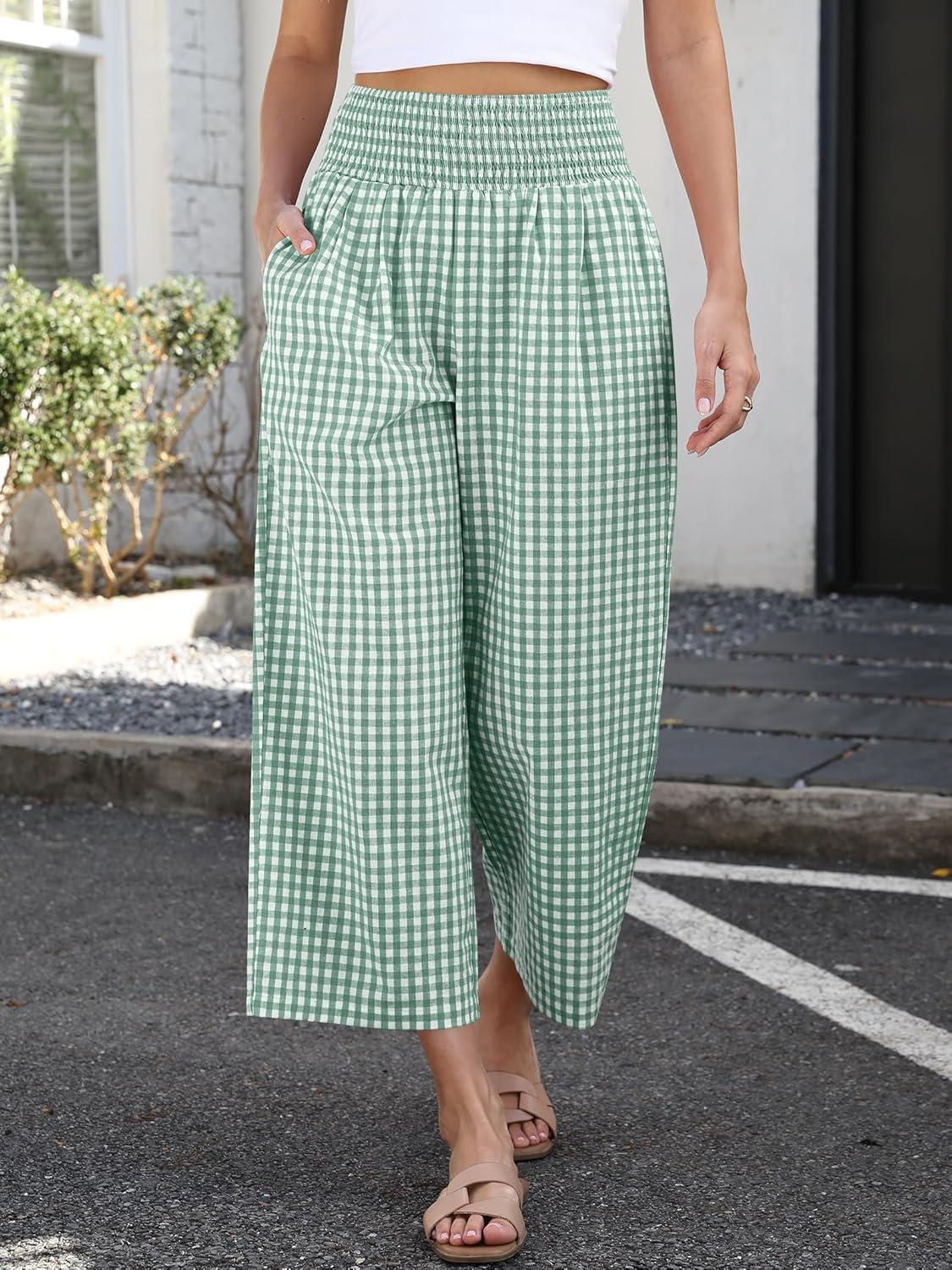 ANRABESS Women Striped Gingham Wide Leg Palazzo Pants Casual Lounge Cute Comfy Plaid Checkered Pajama PJ Bottoms with Pockets(Green White Plaid)