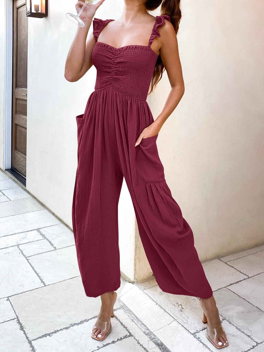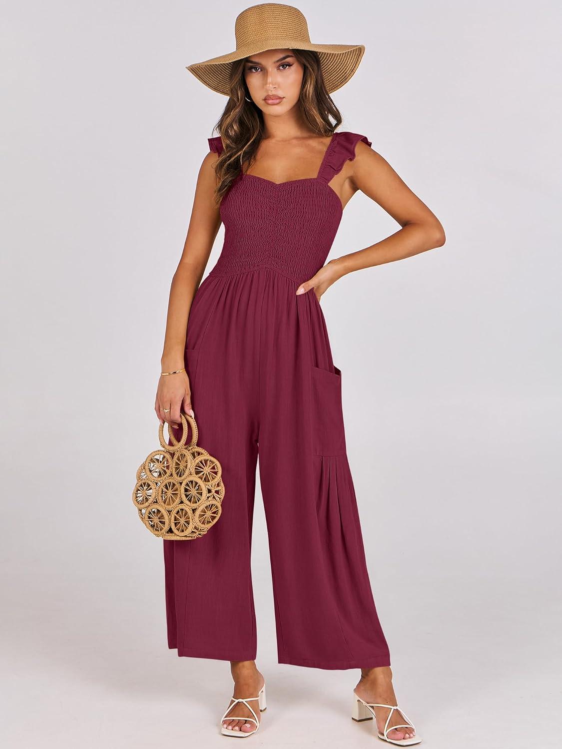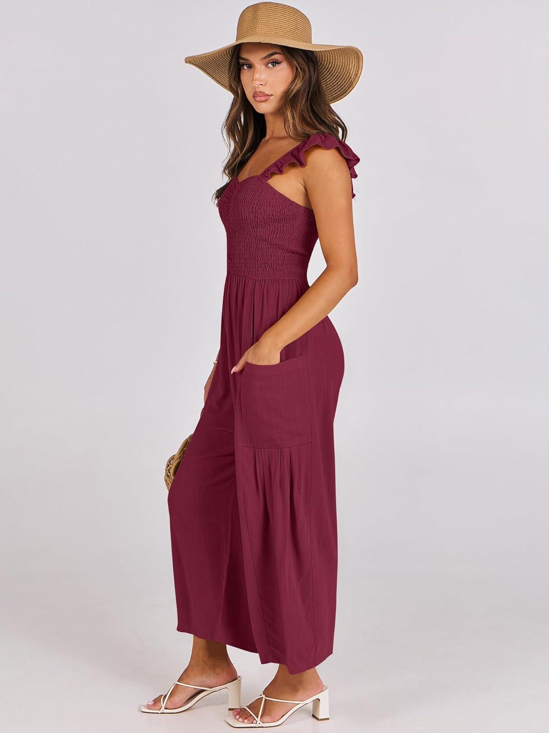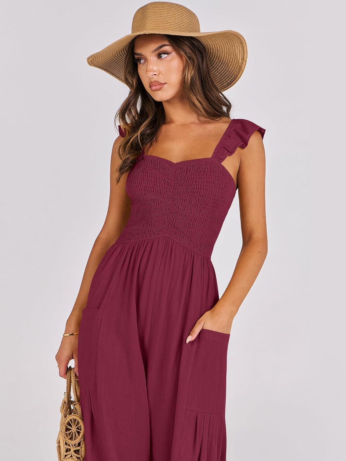 ANRABESS Women Summer Casual Dressy Sleeveless Smocked Wide Leg Linen Jumpsuits Rompers 2025 Trendy Travel Outfit Pocket(Deep Red)