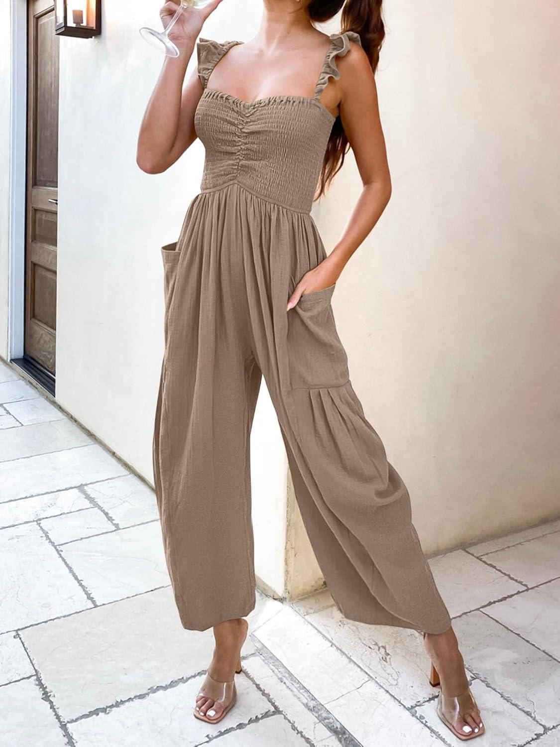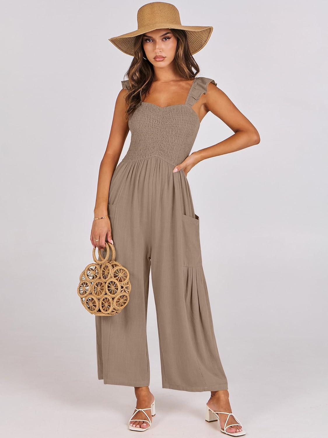 ANRABESS Women Summer Casual Dressy Sleeveless Smocked Wide Leg Linen Jumpsuits Rompers 2025 Trendy Travel Outfit Pocket(Light Brown)