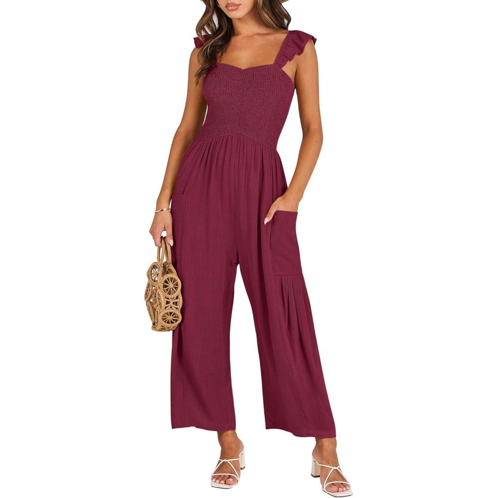 ANRABESS Women Summer Casual Dressy Sleeveless Smocked Wide Leg Linen Jumpsuits Rompers 2026 Trendy Travel Outfit Pocket(Deep Red)